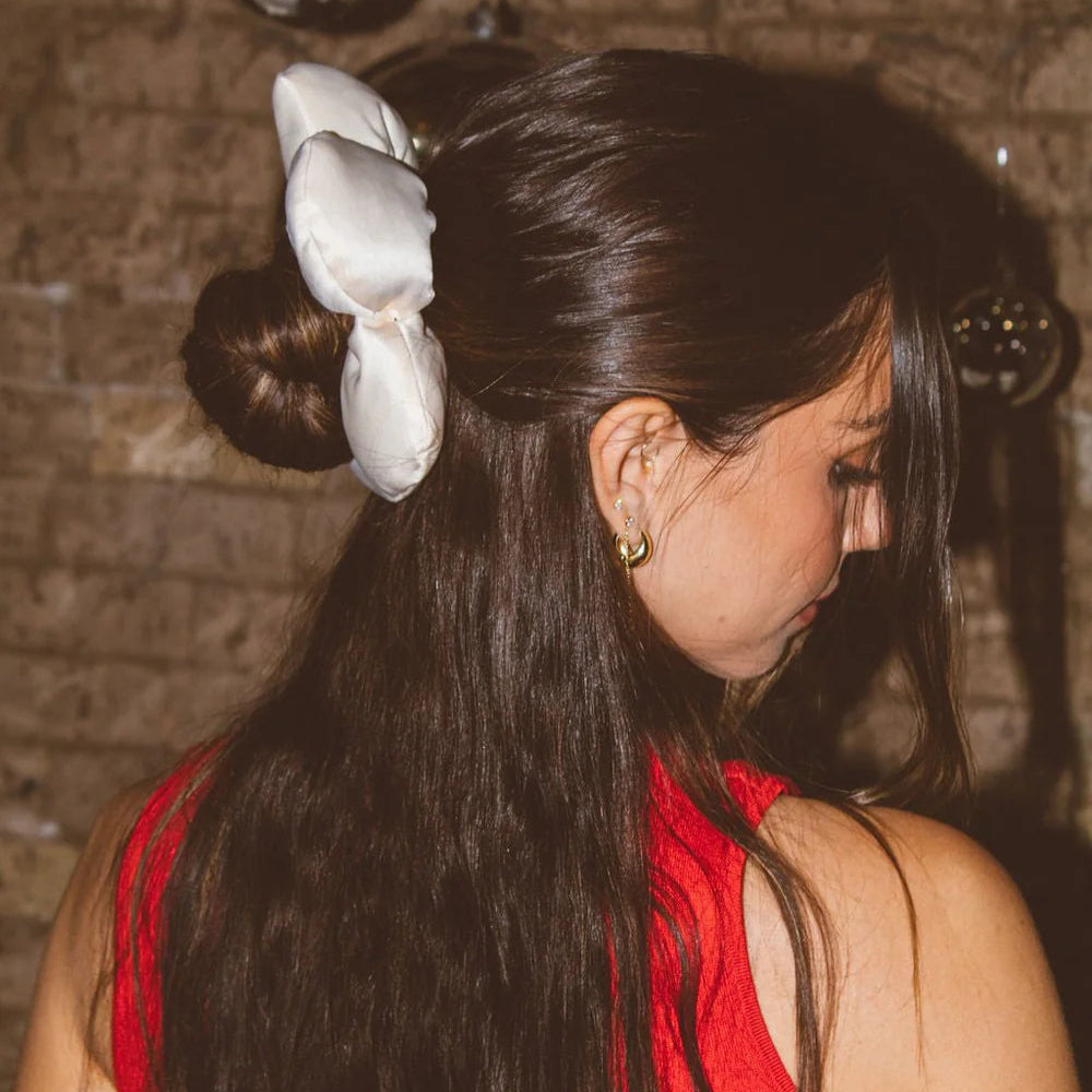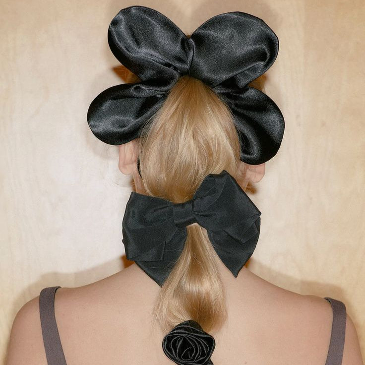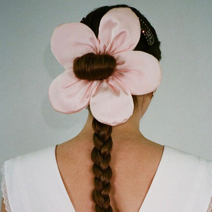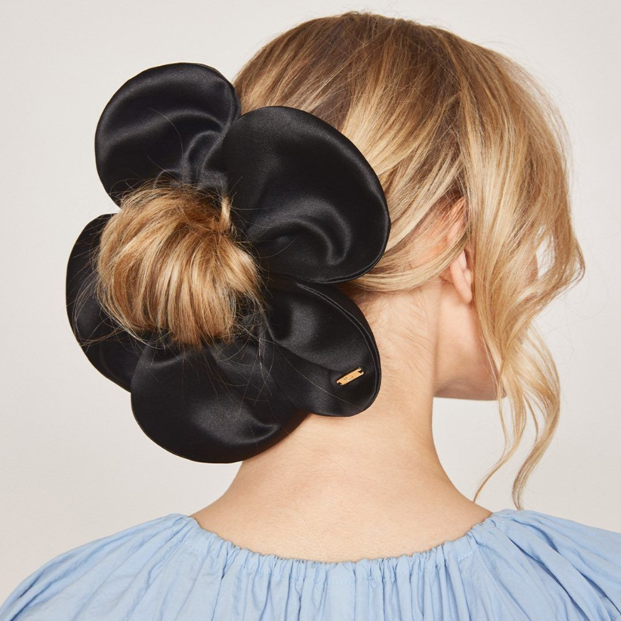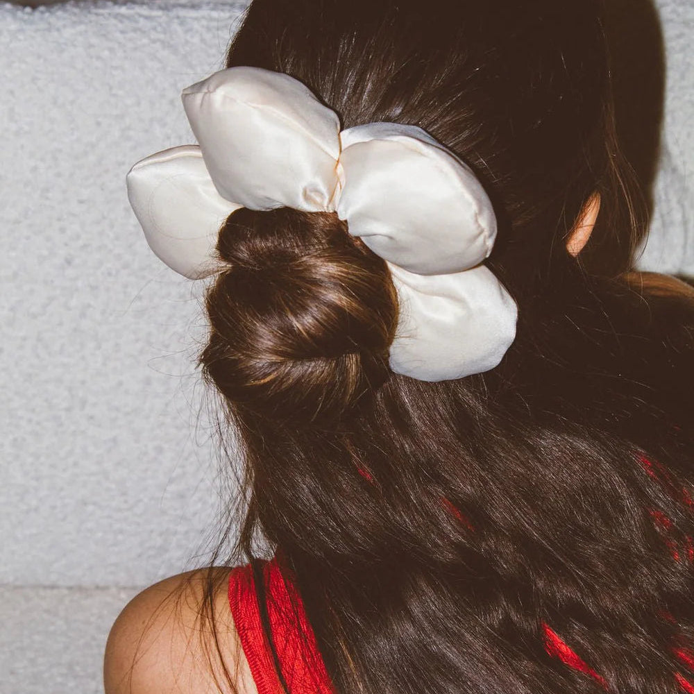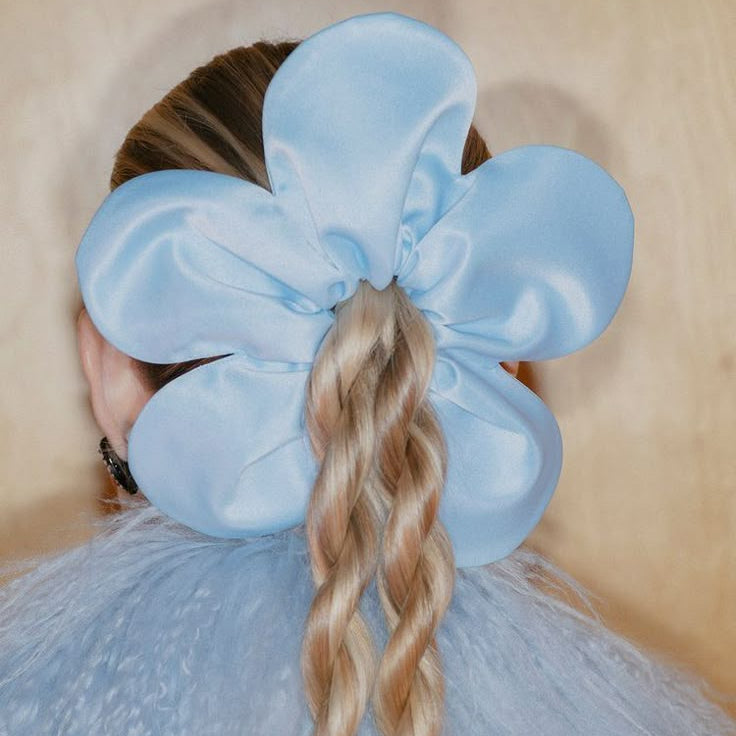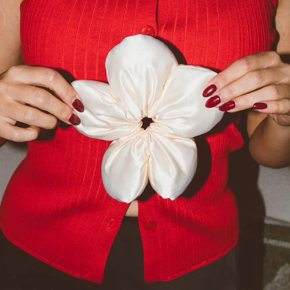 Elevate your daily hairstyles with our luxurious Silk Petal Puff Oversized Flower Scrunchie. Handcrafted from premium mulberry silk and filled with soft tussah silk, this floral accessory not only adds a touch of elegance but also protects your hair from damage. The breathable and gentle fabric minimizes breakage, while the plush filling enhances your updo with subtle volume and charm. Follow @mermaidway on Instagram for more styling tips. Care: Hand wash cold, line dry, cool iron, or dry clean as needed. Material: Outer – 100% Mulberry Silk; Filling – Tussah Silk. Enjoy a chic and comfortable hair accessory!