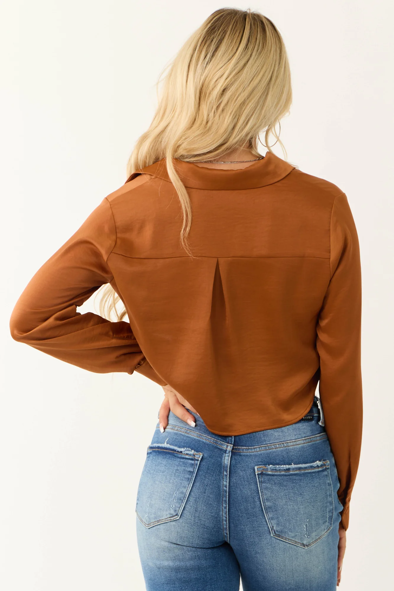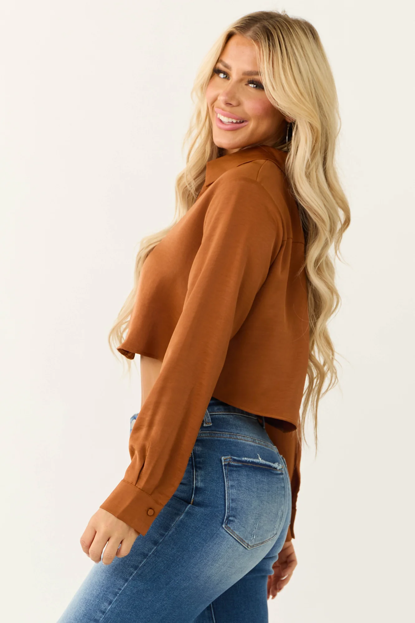 Achieve effortless elegance with our Silky Spice Button Up Cropped Long Sleeve Top. Crafted from 100% Polyester, this non-stretchy silky woven top features a collared V neckline, banded button cuffs, and a rounded high-low hemline. Perfect for any occasion, from casual to work. Hand wash cold and lay flat to dry for lasting beauty. Available in sizes S, M, and L.