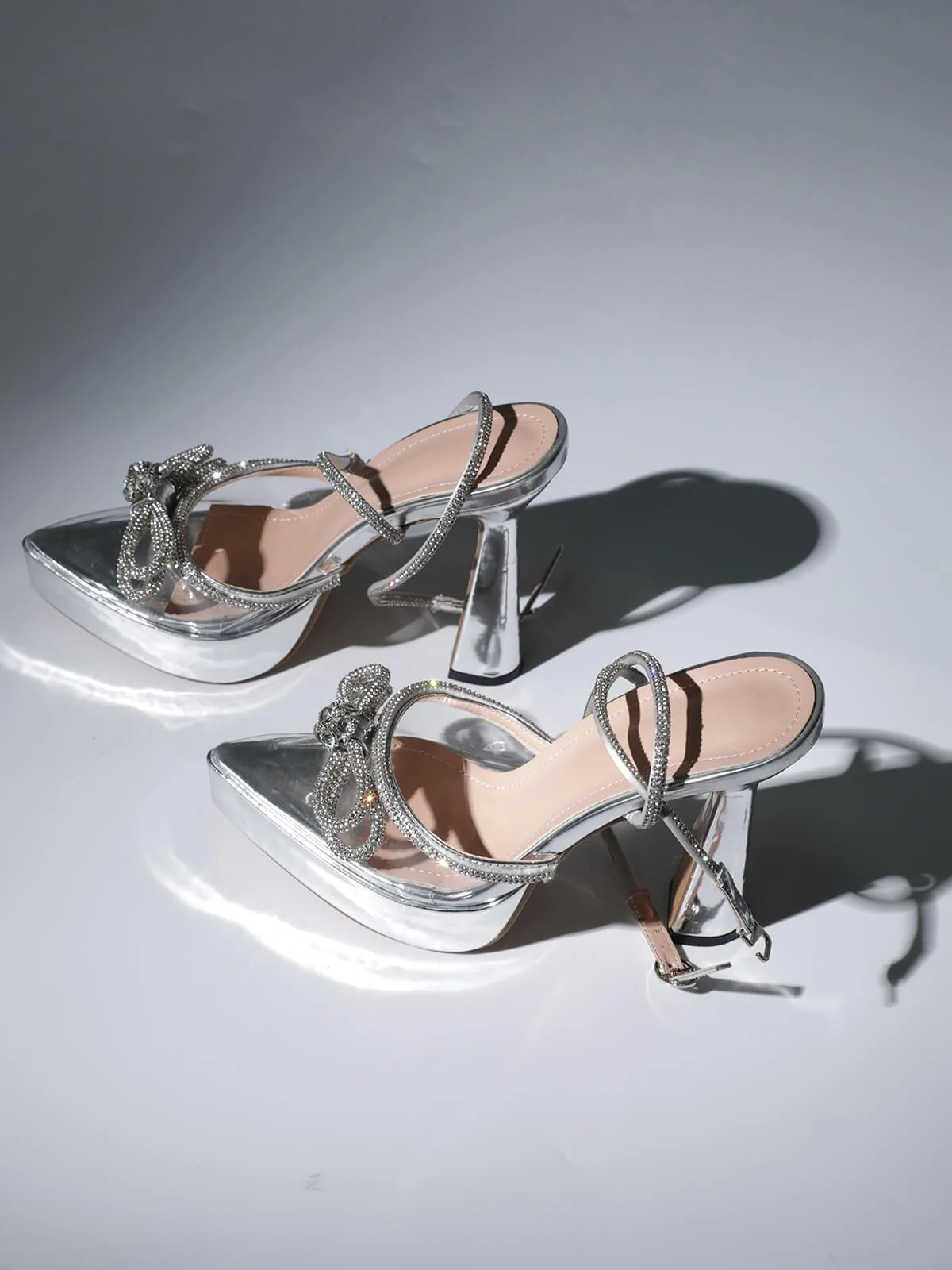 Indulge in elegance with our Silver Bow Crystal Heels, carefully crafted from durable PVC adorned with classic crystal bows. These heels feature a chic design with a timeless style suitable for any occasion, boasting an above the 8 cm / 3.1 inch heel height. Each pair is made to order, ensuring quality and uniqueness. Please refer to our size chart before placing your order. Shipping takes 7-15 business days after your order is placed. Elevate your look with these stunning crystal-heeled shoes.
