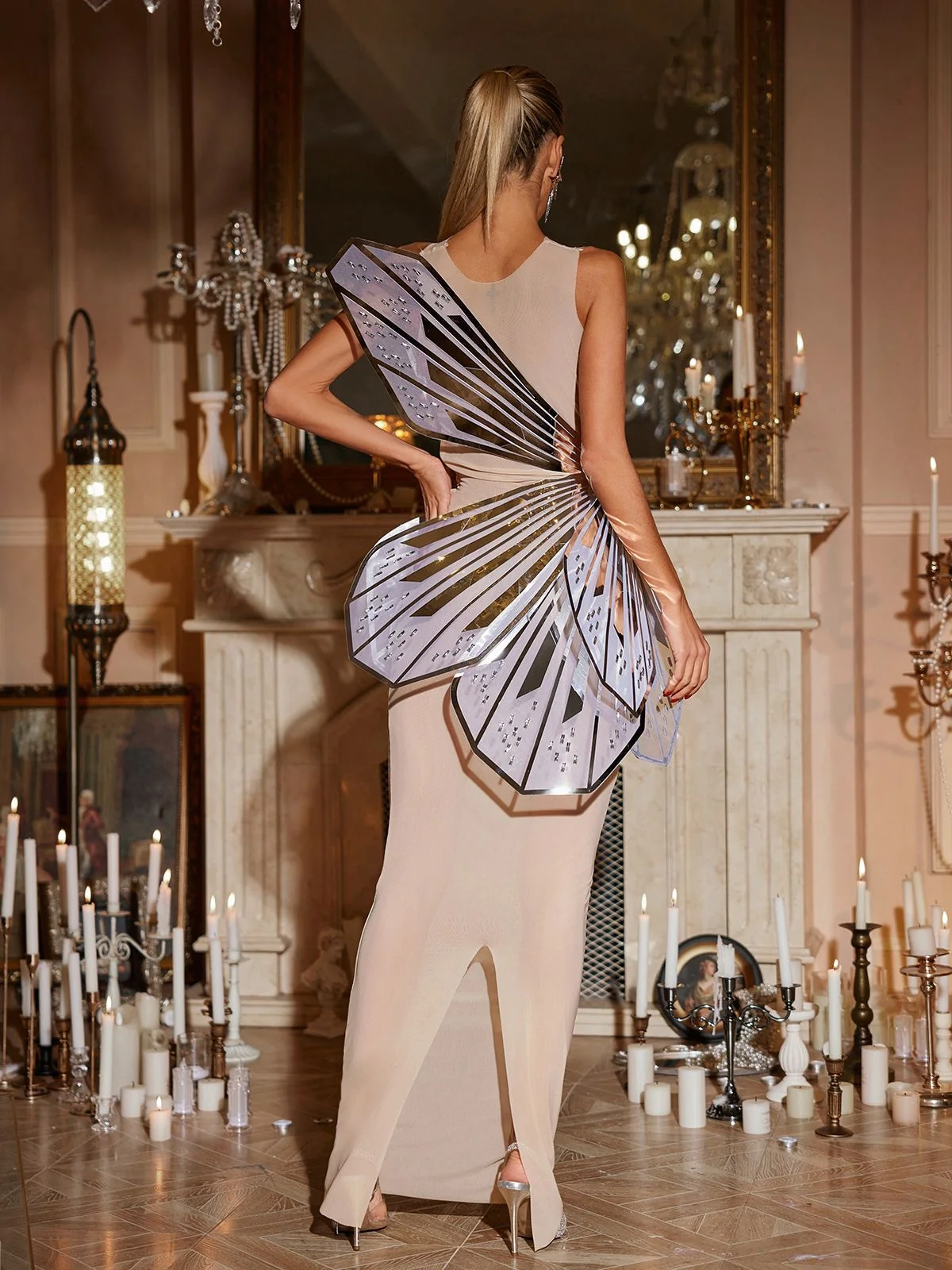 Elevate your style with the Silver Butterfly Maxi Dress. This stunning dress features intricate butterfly embellishments that exude elegance and grace. Made from 100% Polyester with a slight stretch, it offers both comfort and sophistication. Perfect for special occasions, its flowing silhouette and delicate details will make you feel like a true goddess. Stand out in style and make a statement with this glamorous dress. Please note: color may vary under different lighting conditions. Our model is wearing size S.