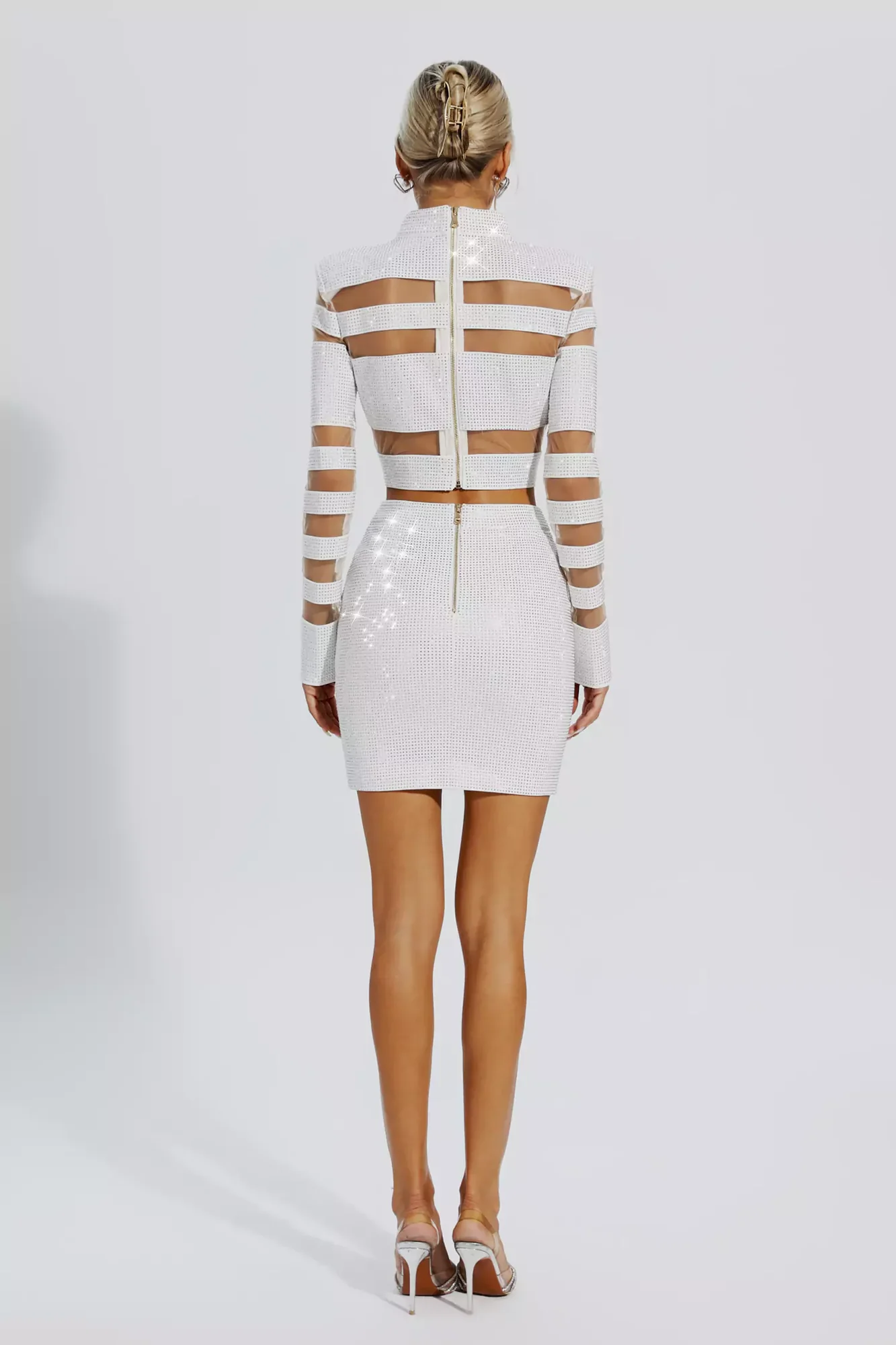 Indulge in the allure of the Silver Cutout Top and Bodycon Skirt Set, a perfect balance of sophistication and modern flair. This set features a stylish long-sleeved top with intricate diamond embellishments paired with a sleek bodycon skirt for a powerful yet glamorous look. Elevate your style with heels and exude elegance effortlessly. Top Length: Approx 42cm; Skirt Length: Approx 43cm. Crafted from high-quality polyester, this set requires gentle dry cleaning to maintain its pristine condition. Available in multiple sizes. Discover the ideal fit using our detailed size chart. Embrace the true essence of fashion with this impeccably tailored ensemble.