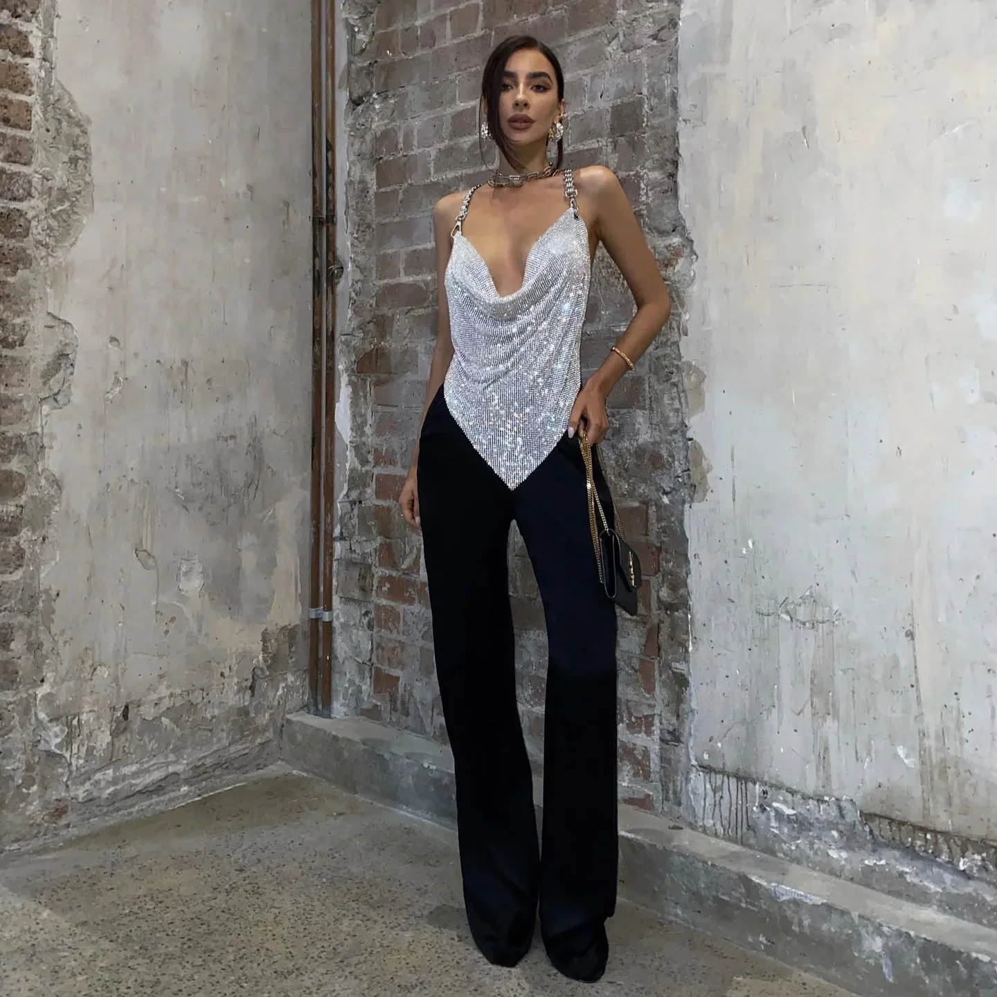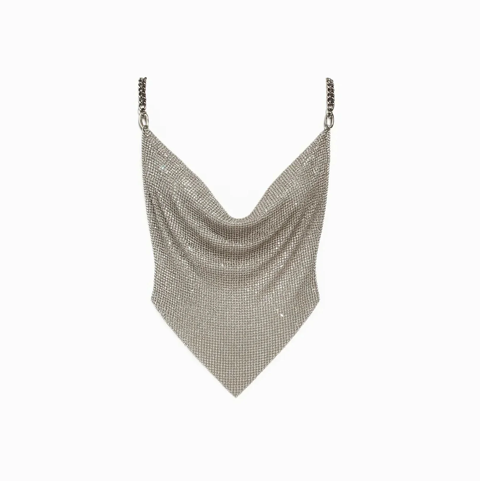 Illuminate your nights with the Silver Diamond Mesh Chain Crop Top that exudes sophistication and allure. This alluring top features a cowl neckline, a captivating criss-cross chain back, and a pointed hem for a touch of rebel chic. Crafted from flowing diamond mesh fabric, it shimmers elegantly in the spotlight. Perfect for after-dark glam, the backless silhouette with adjustable chain straps ensures a dramatic entrance. Feel effortlessly stylish and free in this unlined masterpiece designed to make heads turn. If you seek wardrobe inspiration, don’t miss following us on Instagram at @mermaid_way for style tips and more. Make a statement with your wardrobe choice that lingers till dawn. We offer hassle-free size exchanges if your item doesn’t fit perfectly.