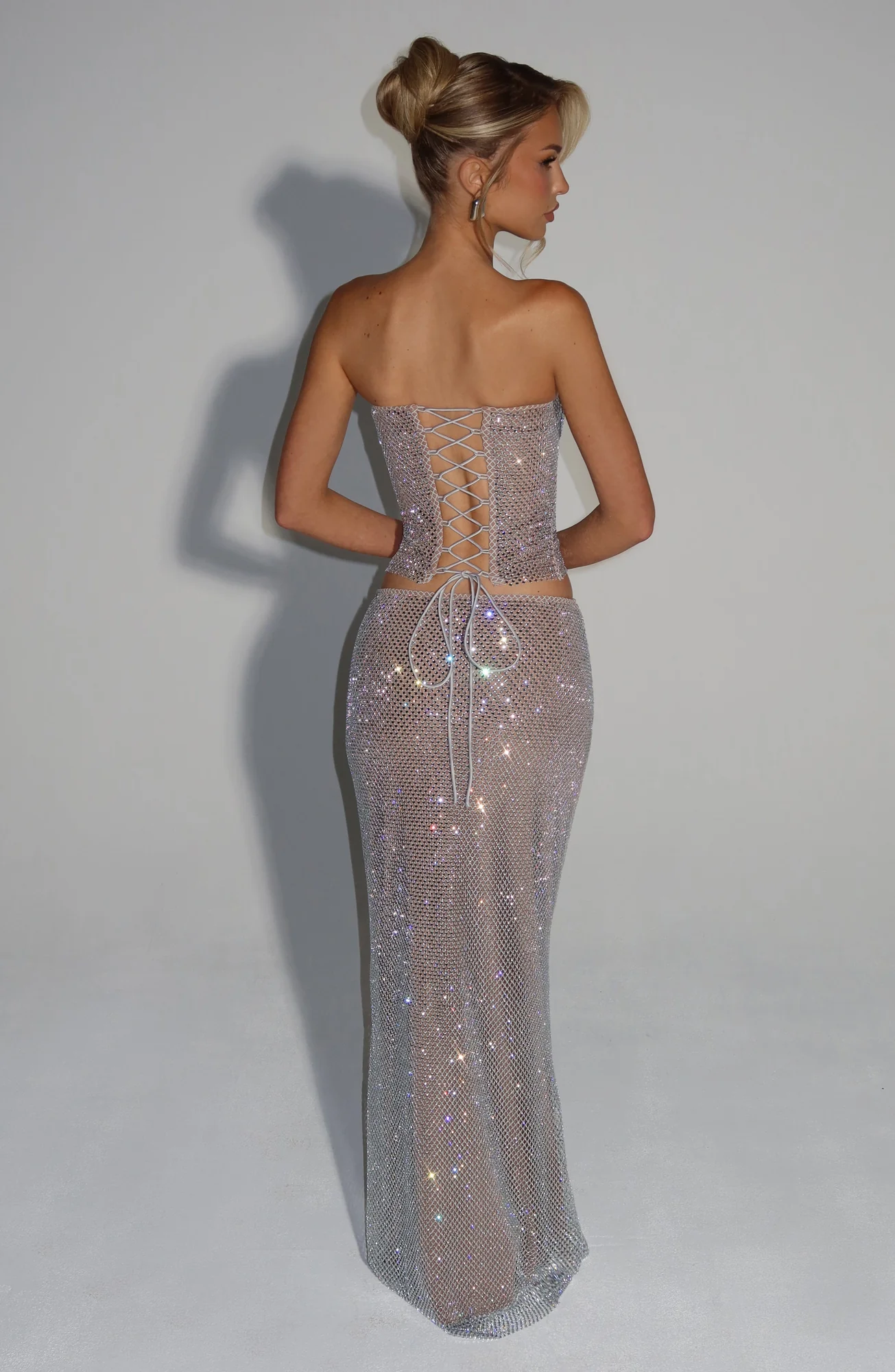 Elevate your style with the Silver Embellished Maxi Skirt from T.X. Crafted in stretch net fabric, this skirt features square hotfix rhinestones for a touch of glamour. The low-rise design with an elastic waistband ensures a comfortable and flattering fit. Fully lined in mesh for a sophisticated semi-sheer look, perfect for any occasion. Pair it with the Serena Top to complete your elegant ensemble. Available in XS to XXL sizes.