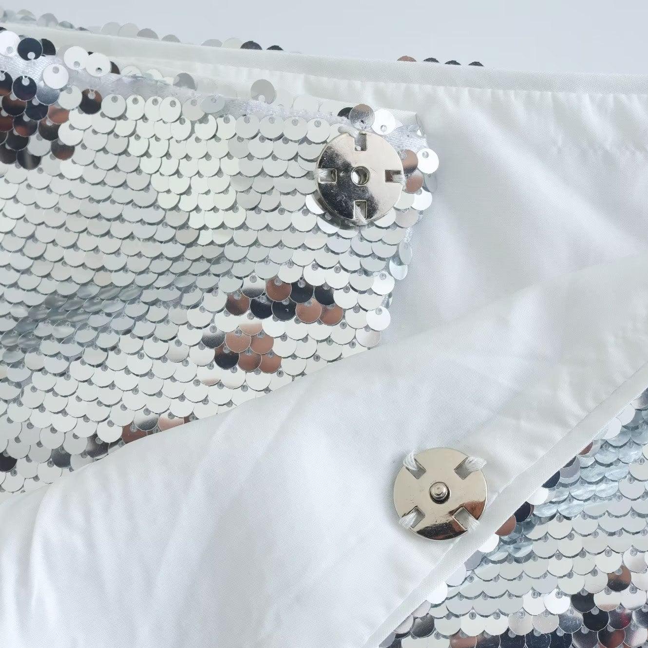 Shimmer and dazzle in our Silver Glitter Sequin Mini Skirt, crafted to captivate on any occasion. This stunning skirt is adorned with mesmerizing sequins that reflect light beautifully, enhancing your figure with its sleek design. Perfect for parties or special events, the flirtatious mini length adds a fun touch while the premium fabric ensures all-day comfort. Stand out on the dance floor or at elegant gatherings with this eye-catching skirt. Elevate your wardrobe with this statement piece that guarantees heads turning. For size exchanges, were happy to assist if the fit isnt perfect. COMPOSITION: Made from 97% polyester and 3% Spandex, with a lining crafted from 95% polyester and 5% elastane. Recommended care includes dry cleaning for the sequin details. Discover more style ideas on our Instagram @mermaid_way.
