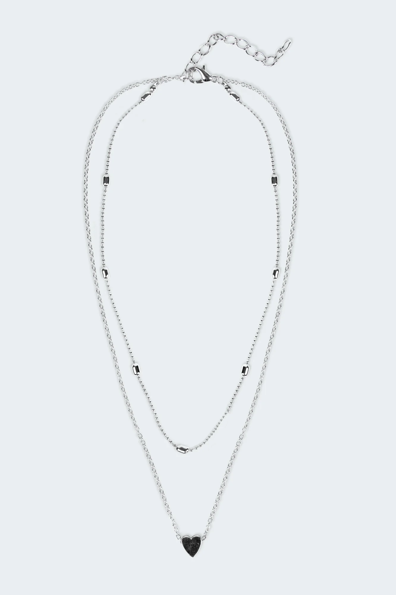 Enhance your style with this exquisite silver tone metal necklace featuring a charming heart pendant and 2 layered design with beaded chain. This necklace is a perfect addition to your collection. Measurements: Length 15.6 inches. Keep your item looking new by avoiding direct contact with perfume, soap, or creams.