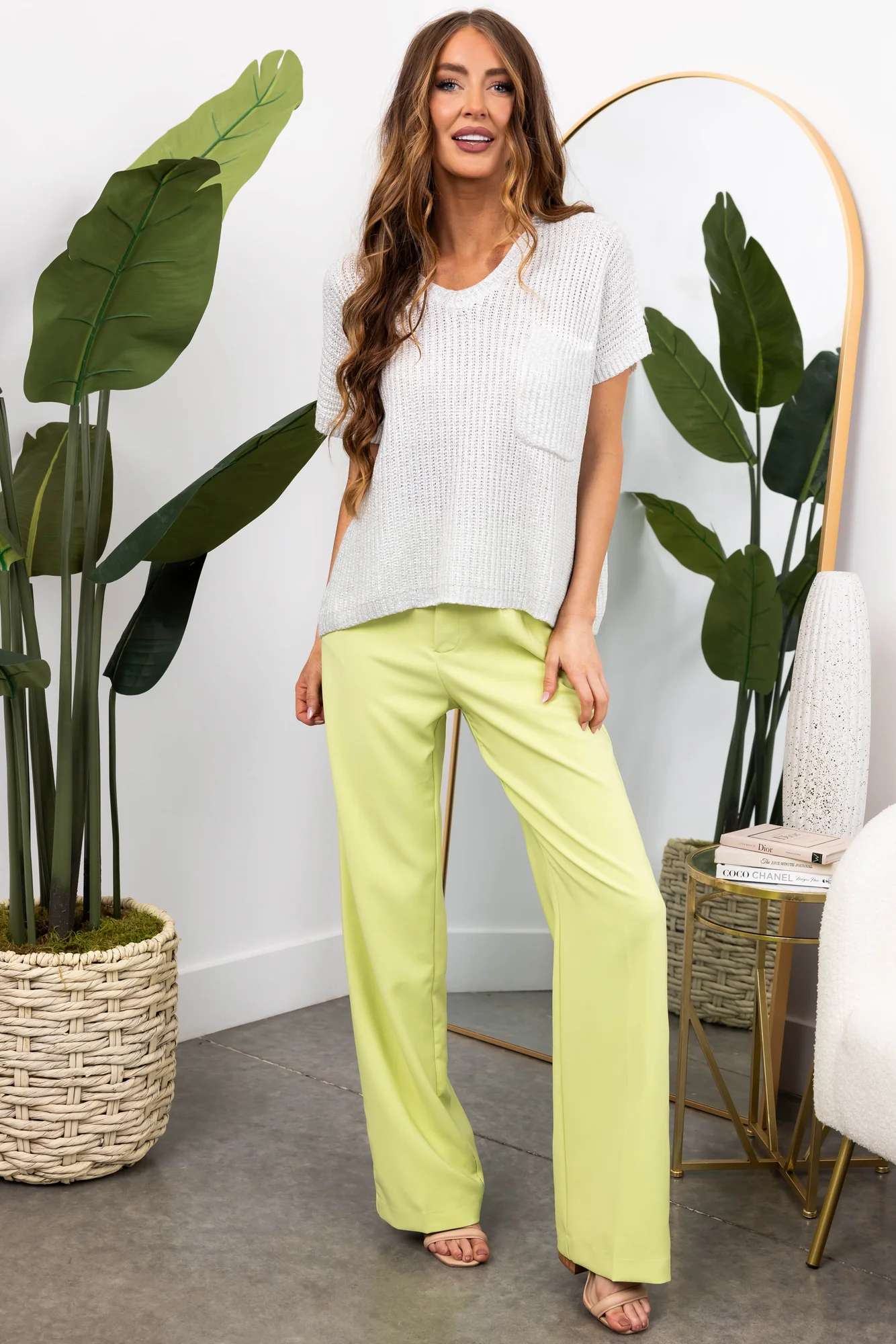 This versatile Silver Metallic Short Sleeve Knit Top offers a relaxed fit with a V-neck design. The stretchy ribbed knit material is accented with metallic coating, a chest pocket, and banded cuffs, neckline, and hemline for a stylish look. Perfect for casual or daytime wear, this top is unlined and made from 65% Acrylic and 35% Nylon for comfort and durability. Hand wash cold, wash separately to prevent color bleeding, lay flat to dry. Available in sizes S, M, and L.