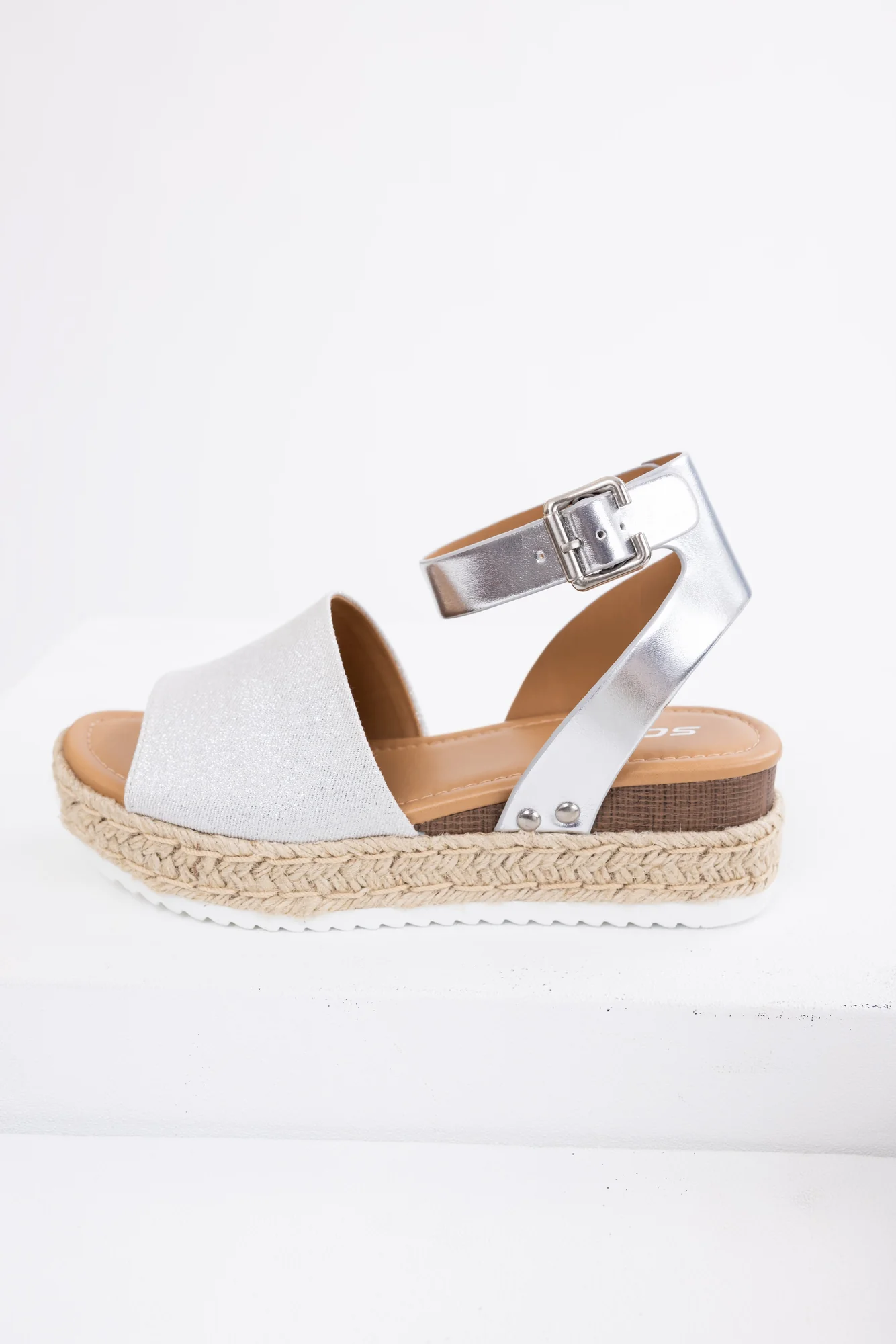 Step into style with these Silver Ankle Strap Espadrille Platform Sandals! Crafted from faux leather with a glitter fabric wide strap, these sandals feature an open toe, adjustable buckle ankle strap, and a comfortable 2.25″ heel. The white treaded sole adds a trendy twist, making them perfect for daytime wear in spring or summer. Elevate your look with a platform height of 1.5″. Imported and available in various sizes.