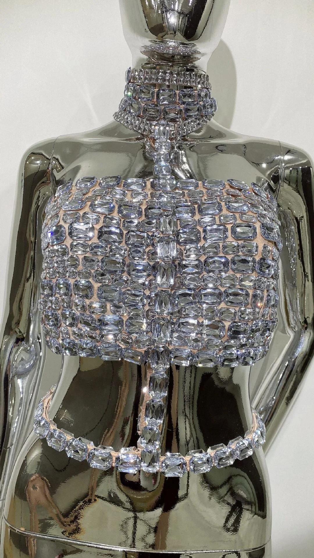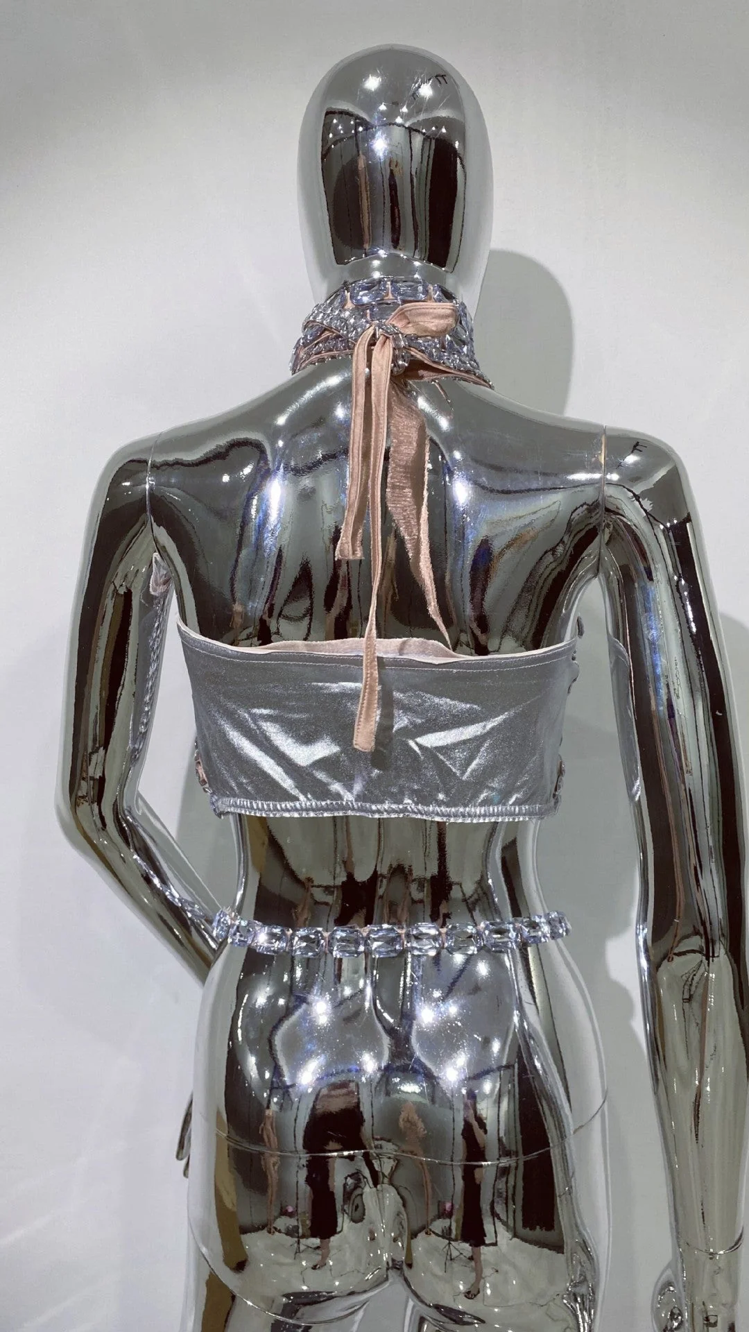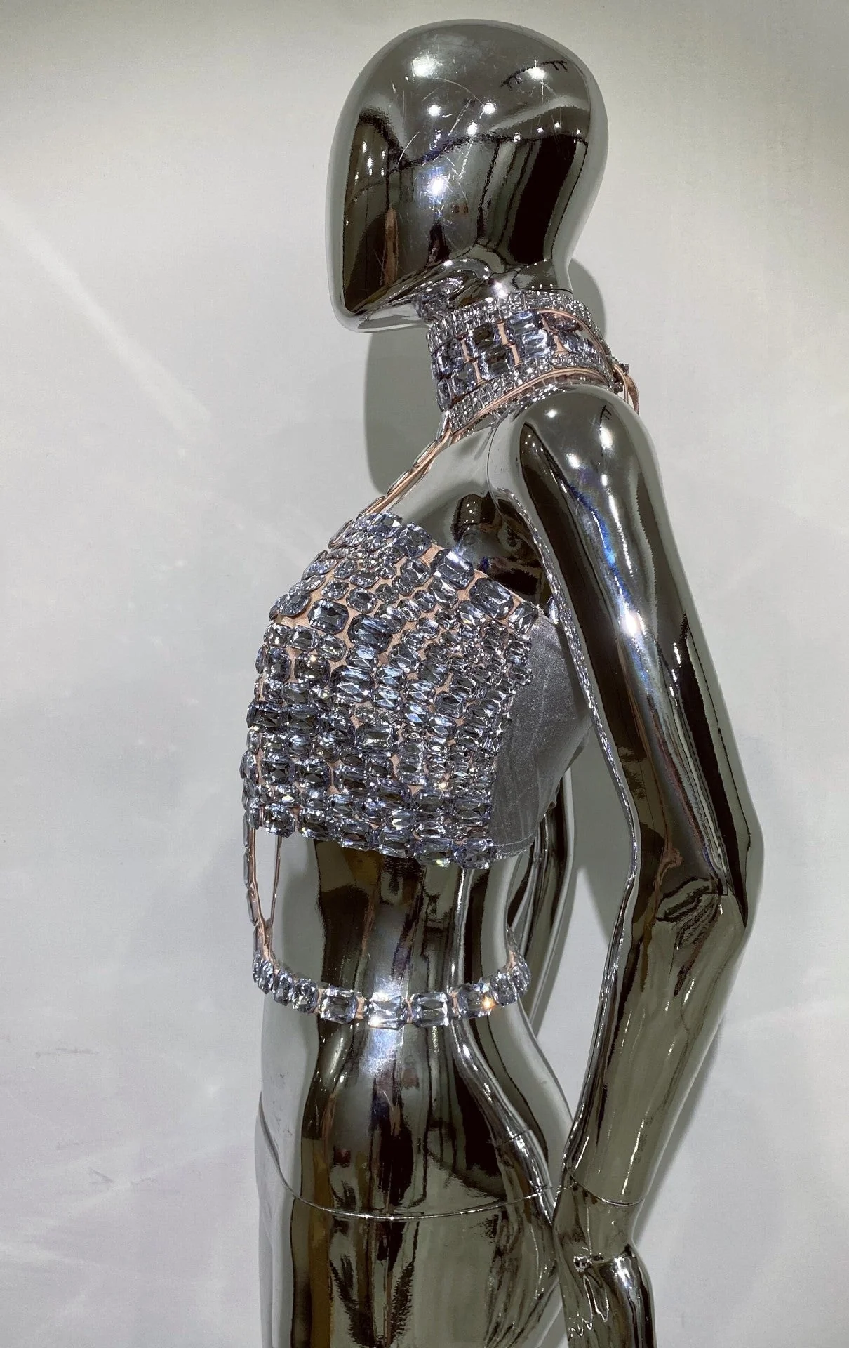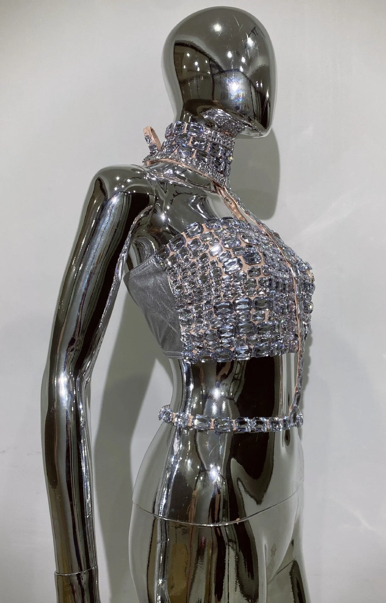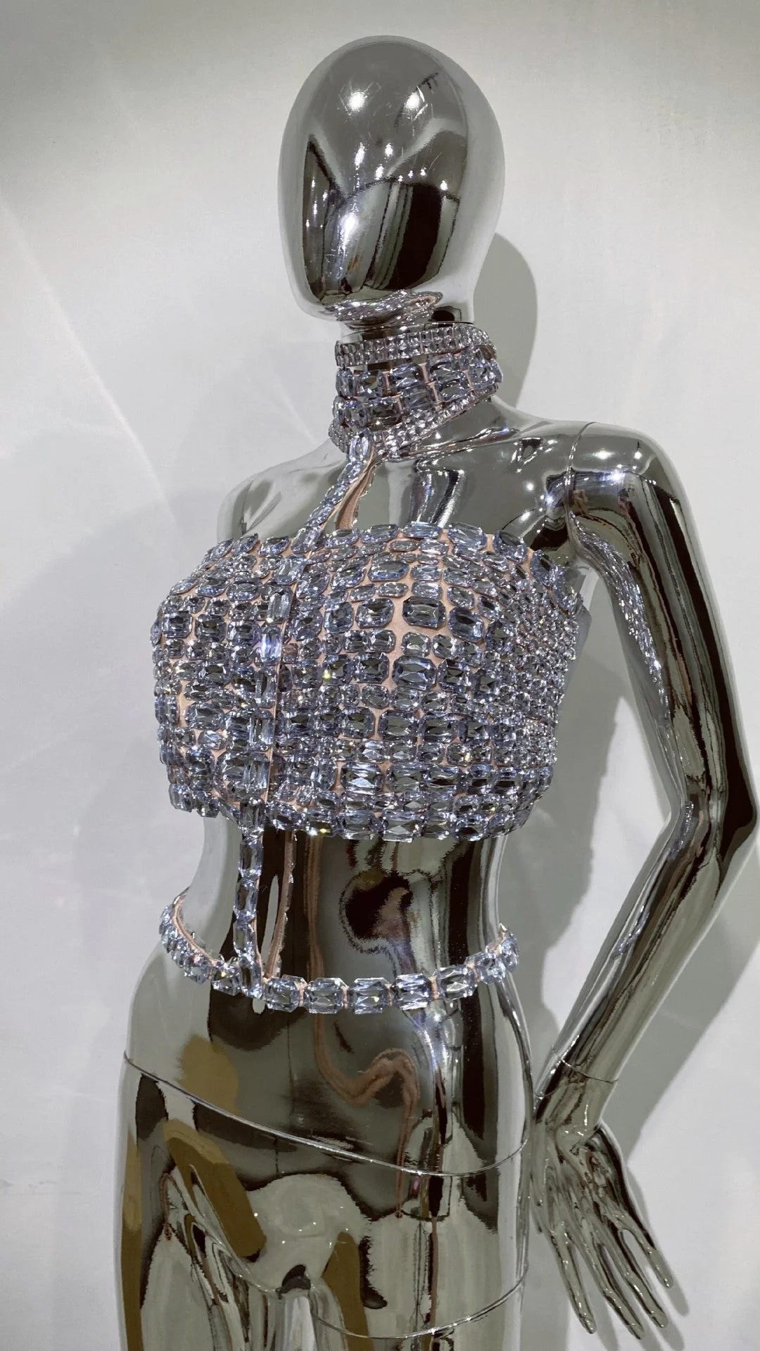 Elevate your style with our Silver Rhinestone Cutout Crop Top from Night Novas. Crafted with a sparkling rhinestone cutout design, this top boasts an exciting silhouette that guarantees to make a statement wherever you go. Made from 100% Polyester with a slight stretch, this top exudes luxury and confidence. Dry clean only. Please note that color may vary due to lighting. For the most accurate representation, refer to product images without the model. Model is showcasing size S.