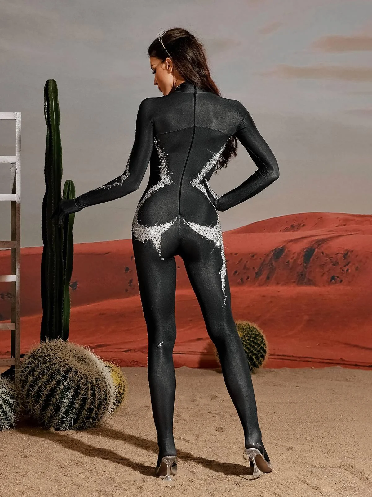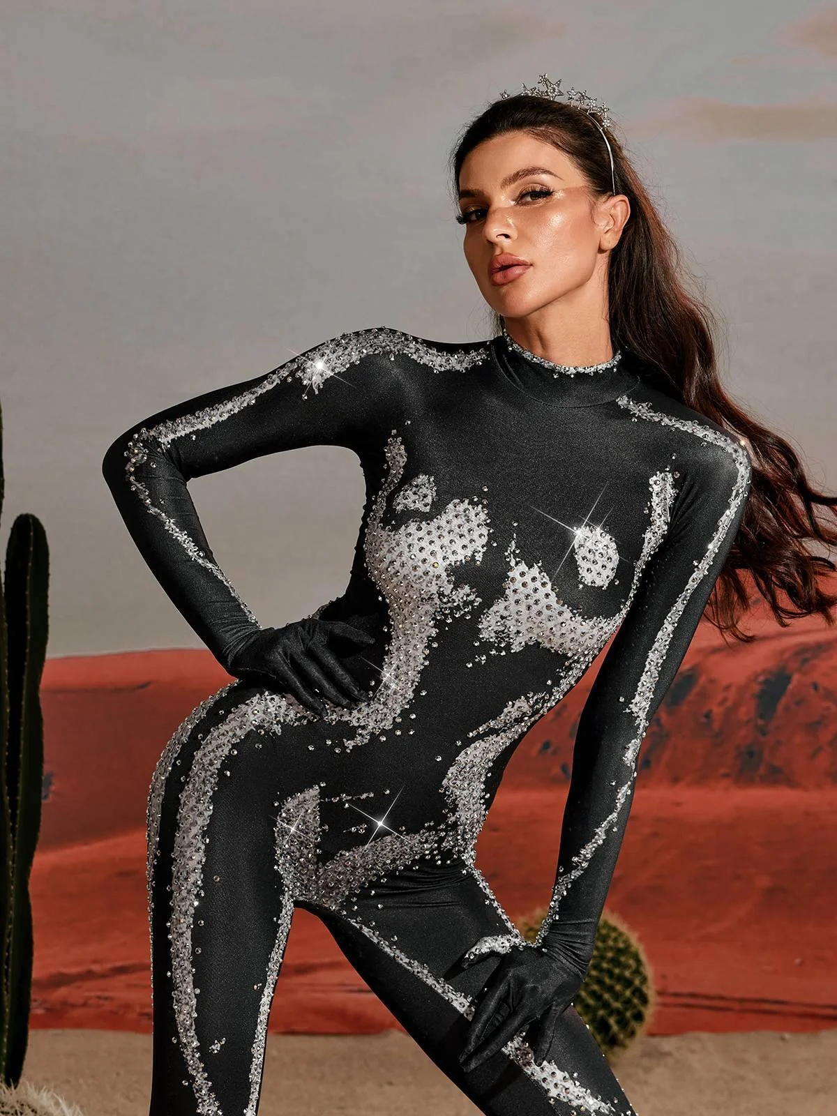 Unleash your inner diva with the Silver Rhinestone Embellished Body Gloves Jumpsuit. This dazzling jumpsuit features a chic rhinestone design and stylish gloves, offering both elegance and comfort. Make a bold statement and stand out at any event with this must-have piece made of 100% Polyester. The jumpsuit has a slight stretch with an invisible zipper opening at the back for easy wearing. Dry clean only for maintenance. Please note that color variations may occur due to lighting. Model is wearing size S for reference.