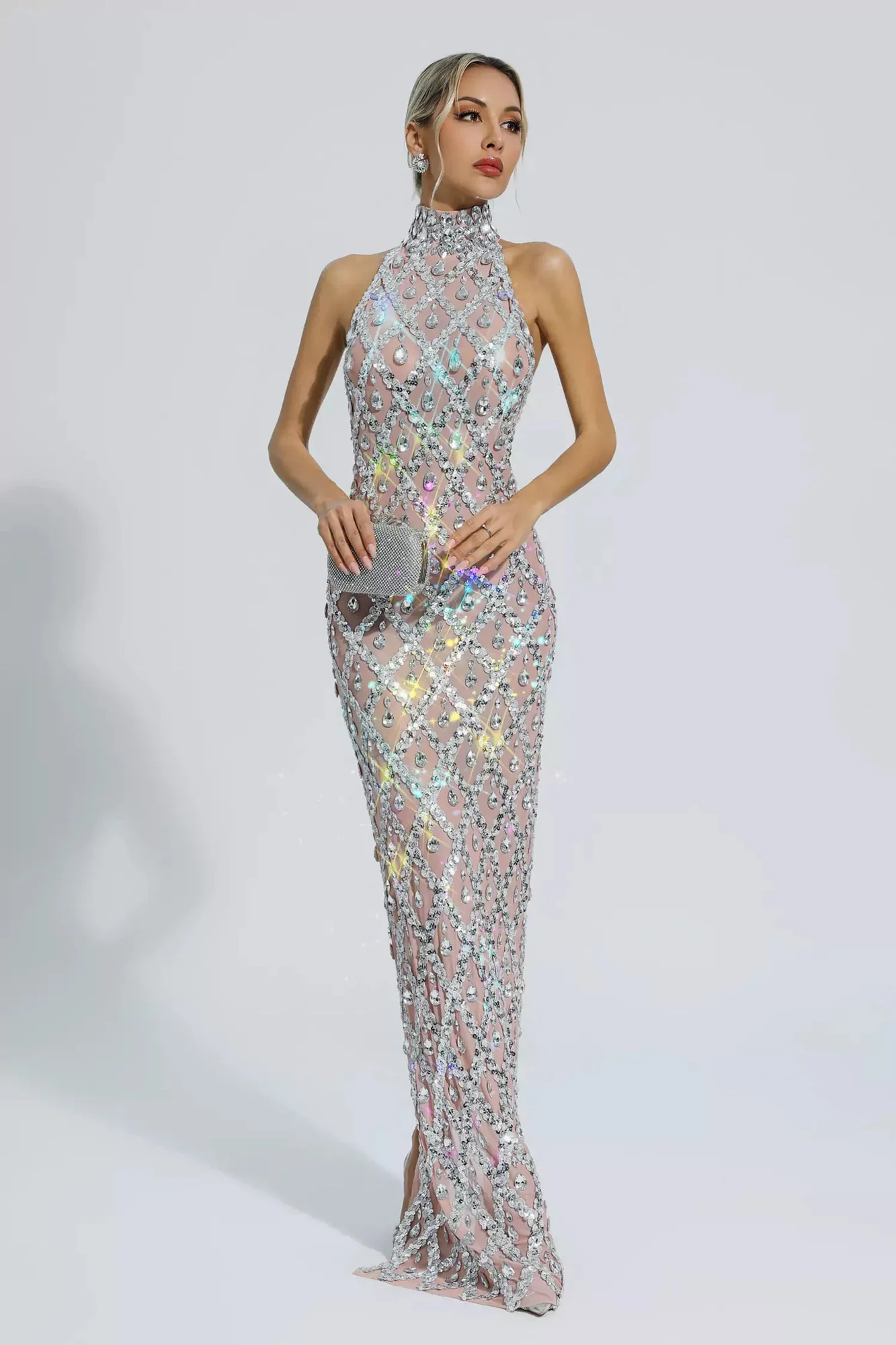 Elevate your evening looks with the exquisite Silver Sequin Embellished Maxi Dress. This sleeveless gown is embellished with sparkling sequins, perfect for formal occasions. Showcase sophistication and style with this sexy and elegant long dress, designed for the empowered and confident woman. The dress length is approximately 155cm and is made of Spandex. It is recommended for gentle dry cleaning only. The model is 5 ft 7 tall and wears size S. Please refer to our size chart for the best fit. Dress runs true to size; do not size up or down. Color may vary due to lighting. The product images (without a model) depict the true color of the dress.