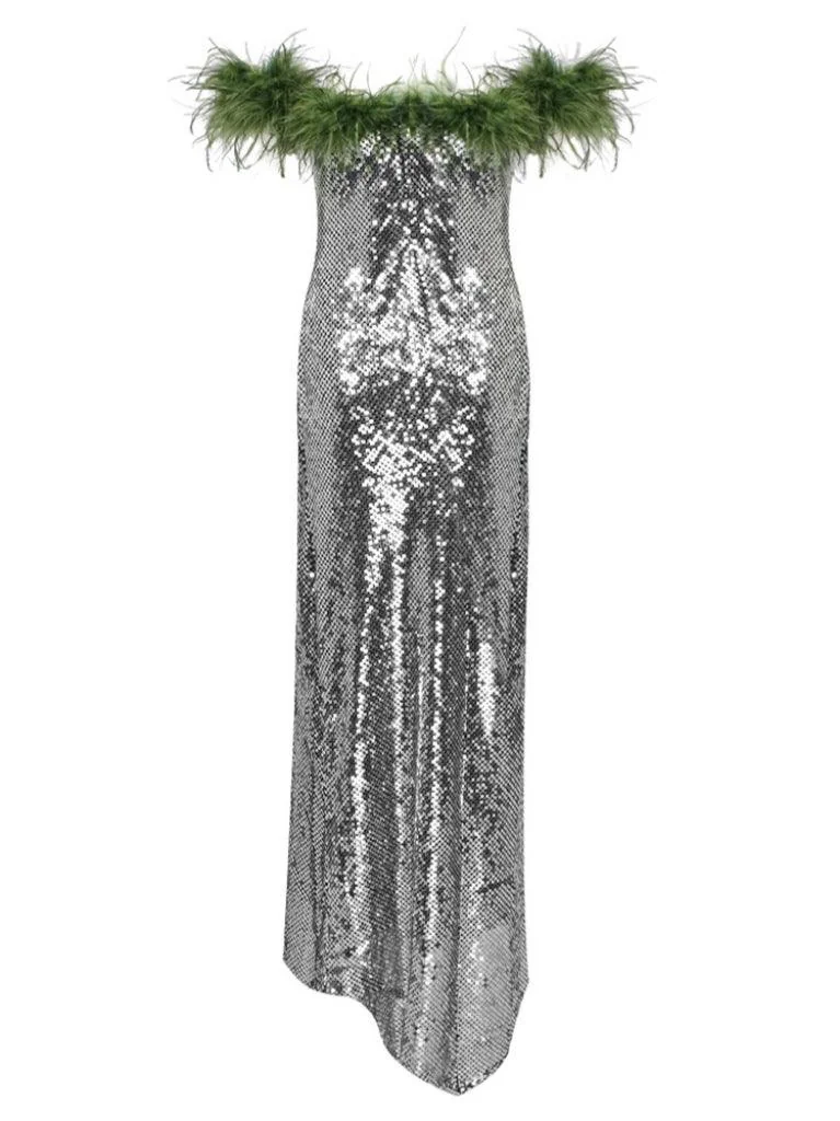 Indulge in sophistication with our exquisite Silver Sequin Feather Maxi Dress. This elegant off-shoulder dress is perfect for nights out, featuring delicate feather accents and a shimmering sequin finish. Crafted from a lightweight blend of 100% polyester, this dress exudes charm and grace. The invisible zipper at the back ensures a seamless fit, while the non-stretch material maintains its shape beautifully. Dry clean only. Please note: Color may vary due to lighting. Embrace luxury with every wear.