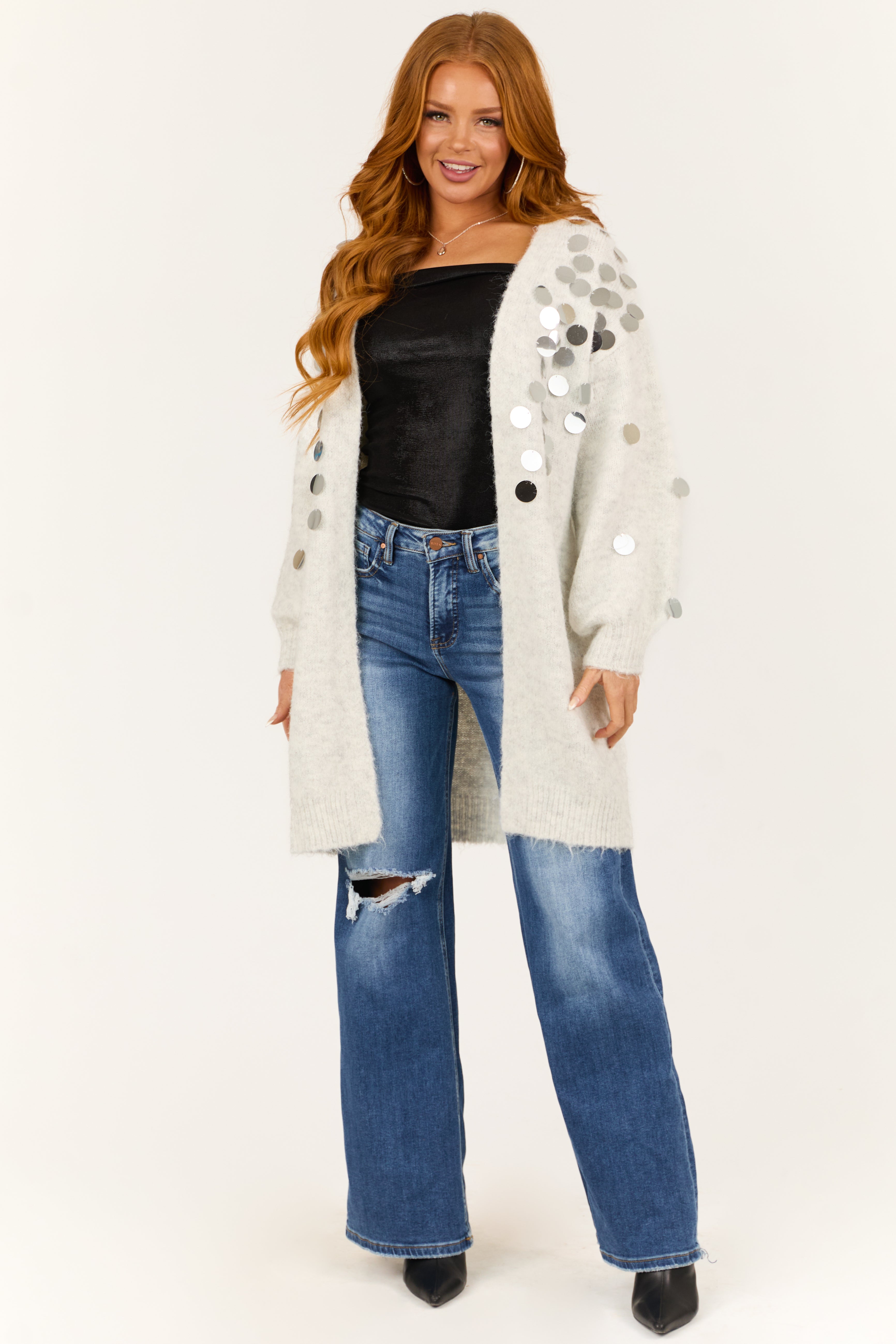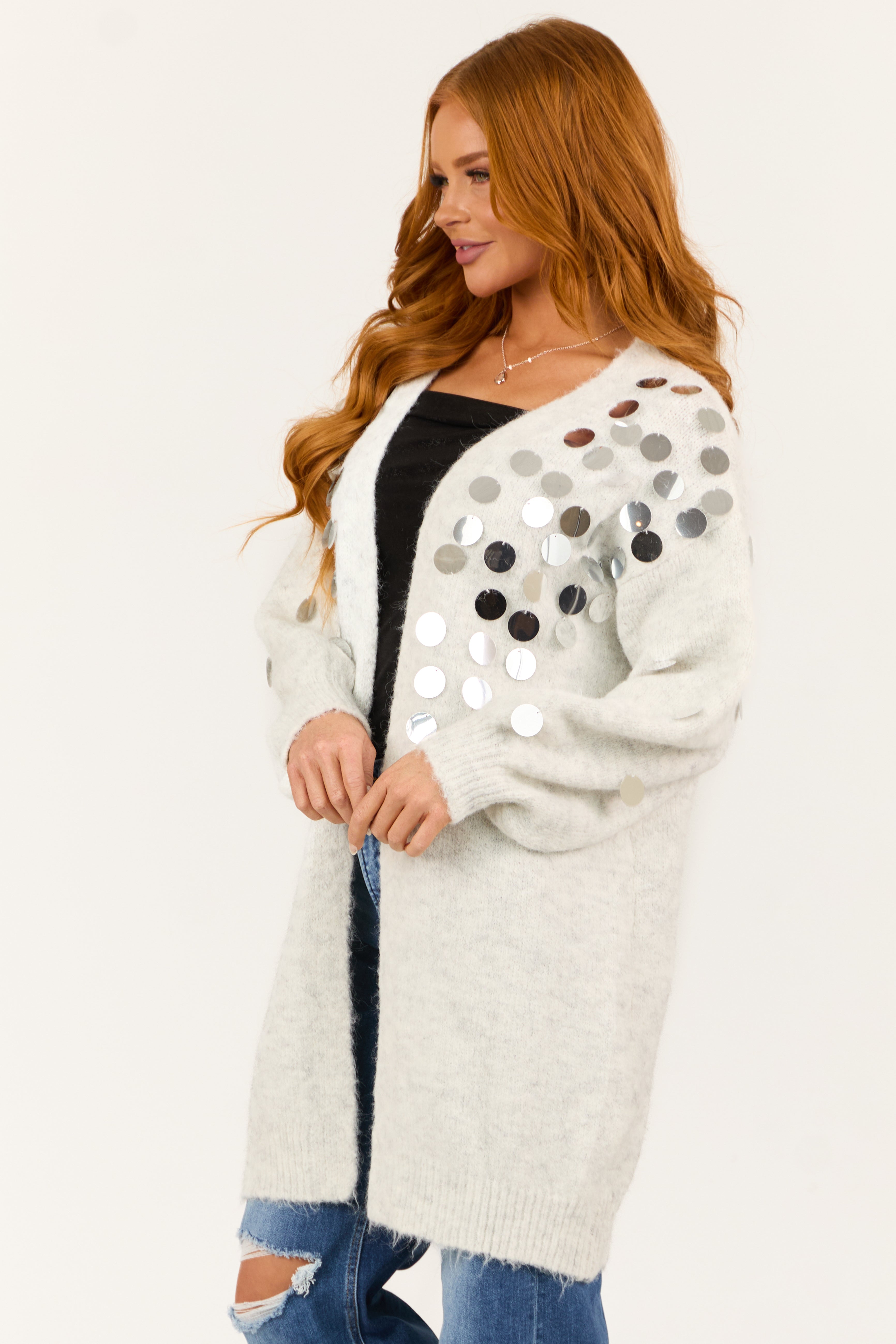 Indulge in shimmering elegance with our Silver Sequin Sparkle Open Front Knit Cardigan. Crafted from a stretchy metallic blend, this oversized cardigan features long bubble sleeves, ribbed trim, and a versatile length for effortless styling. The subtle pewter grey hue complements the silver sequins, adding a touch of sophistication to any outfit. Carefully hand wash to maintain the luxurious finish. Make a statement at any occasion with this dazzling piece. Available in S/M and M/L sizes.