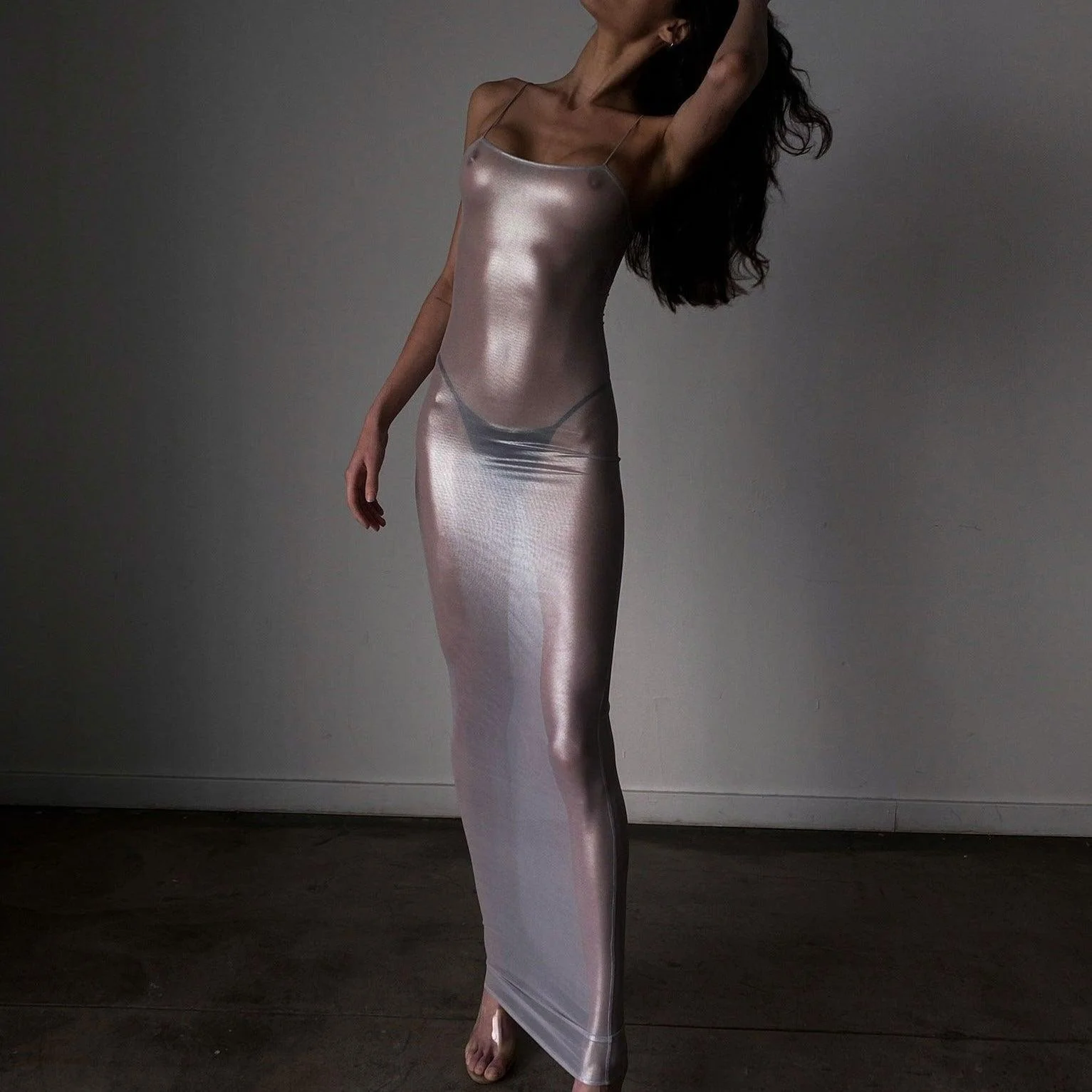 Tags: Elegant Dress, Evening Wear, maxi dress, Sheer Metallic, silver dress
