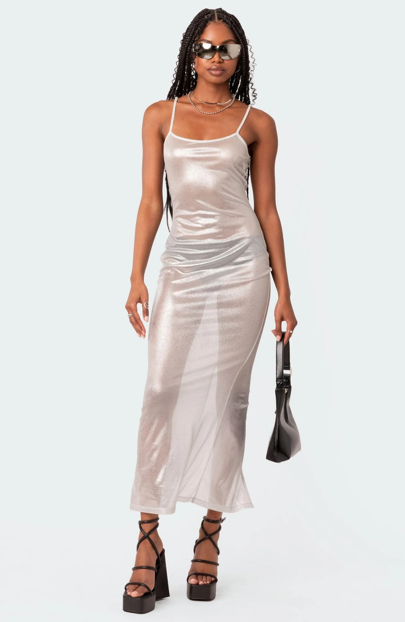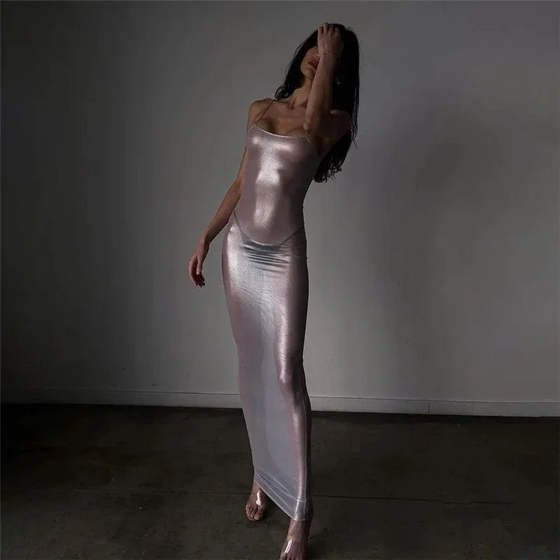 Elevate your wardrobe with this exquisite Silver Sheer Metallic Maxi Dress, crafted from a delicate sheer fabric with a captivating metallic sheen. This elegant evening wear is designed to offer a flattering silhouette, embodying modern elegance suitable for any glamorous occasion. Enjoy comfort with the poly and elastane blend that ensures a flexible, form-fitting style. Transition effortlessly from formal events to relaxed gatherings, pairing with strappy platform heels for a graceful ensemble. Discover styling tips on Instagram @mermaid_way. Benefit from our satisfaction guarantee, offering a free replacement or local tailoring support for the perfect fit. Exchange for a different size if needed.