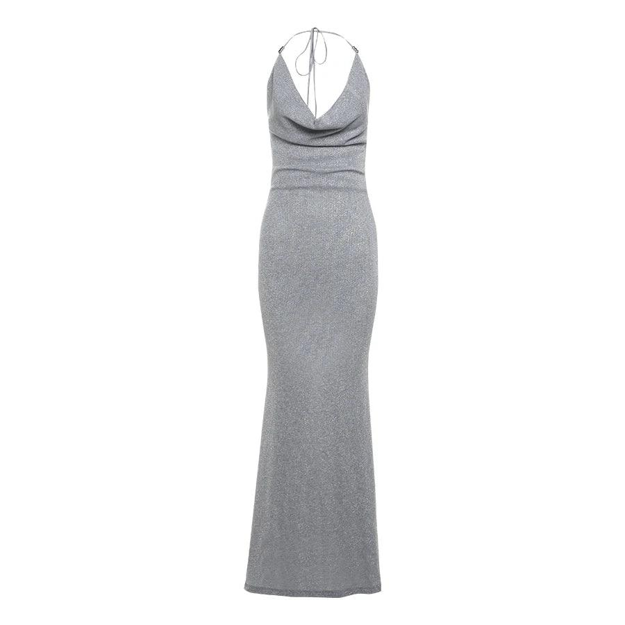 The Silver Shimmering Open Back Maxi Dress is a stunning piece that captivates with its delicate shimmer fabric, elegant open-back design, and sultry low cowl neckline. This bodycon dress features a draped cowl neckline with halter straps, intricate beaded hardware accents, and a maxi length for a sophisticated look. Pair it with statement jewelry and stiletto heels for an effortlessly chic and cocktail-ready ensemble. Made of 100% Polyester. This delicate garment should be handled with care. If you need a different size, were happy to provide a complimentary exchange.