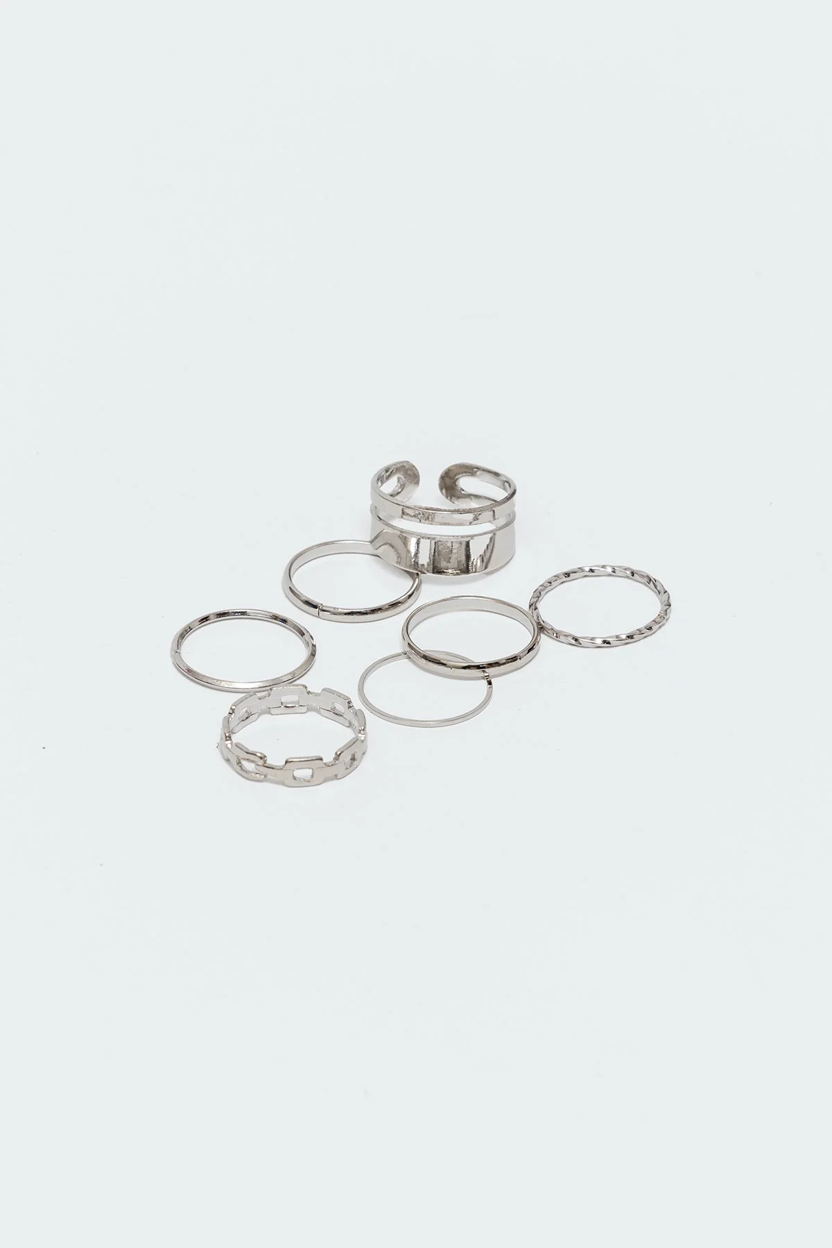 Discover the elegance with our Silver Tone Assorted Ring Pack featuring 7 rings in various styles. Crafted from high-quality silver tone metal, these rings range in diameter from 0.7 to 0.6 inches. Elevate your style with this versatile set. Avoid direct contact with perfume, soap, or creams to maintain their brilliance and shine.