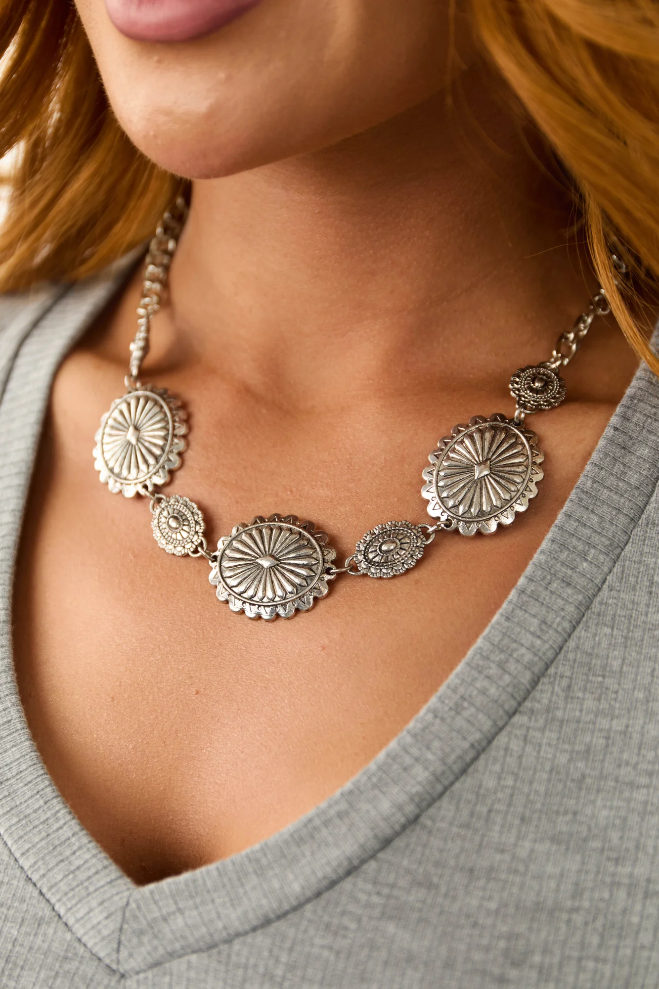 Enhance your outfit with this stylish Silver Western Chain Necklace. Crafted with etched metal, featuring scallop-edged medallions, it offers a trendy touch. The lobster clasp closure ensures secure wearing. This necklace has a chain length of 17 inches with a 2.5-inch extension for a customizable fit. Elevate your style effortlessly with this imported accessory.