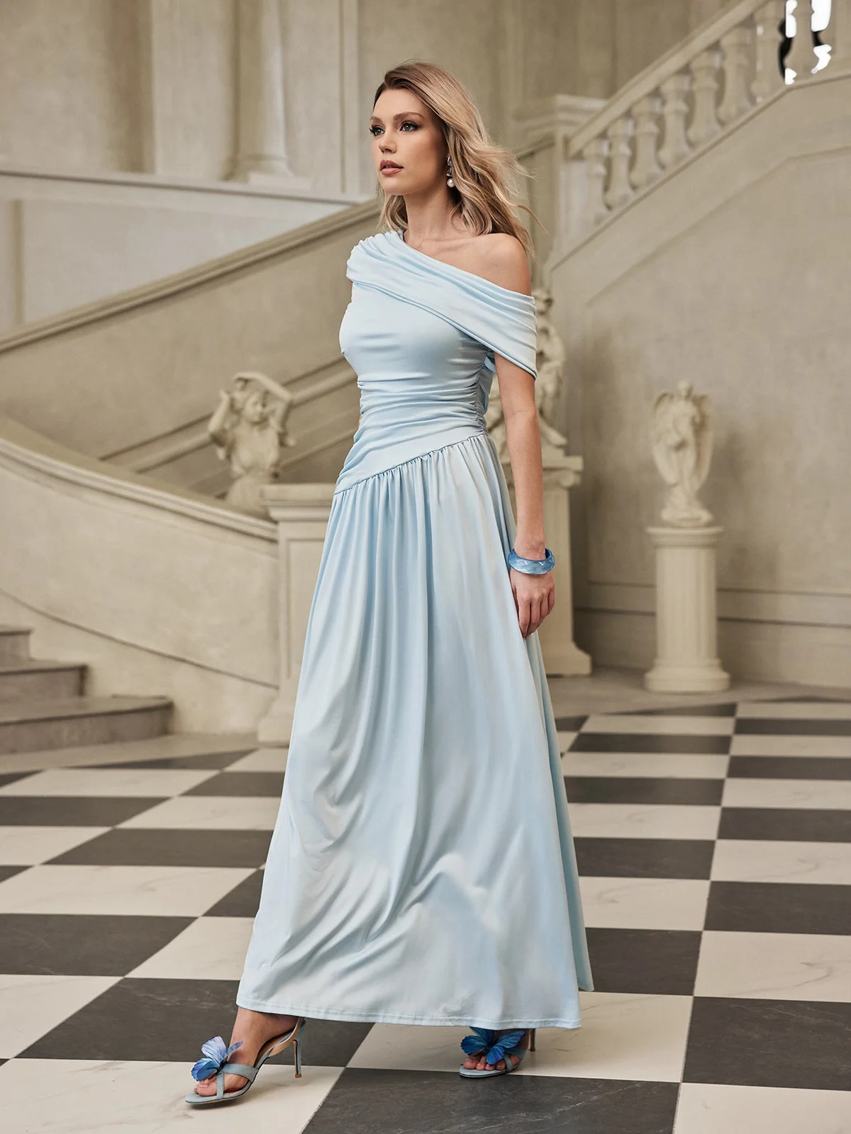 Elevate your style with the Sky Blue One-Shoulder Ruched Maxi Dress. This elegant dress features a flattering ruched design, asymmetrical one-shoulder silhouette, and flowing maxi length for a graceful and modern look. Perfect for special occasions, the soft sky-blue hue enhances your natural beauty while providing comfort with slight stretch. Stand out effortlessly at weddings or vacations with Wang Kuans creation. Material: 100% Polyester. Care: Dry clean only. Color may vary due to lighting. Model is wearing size S.