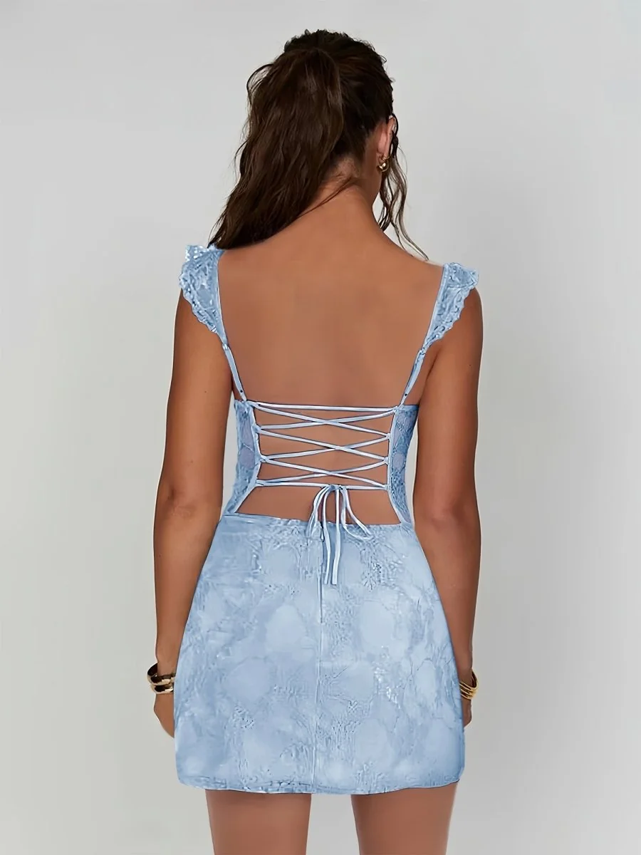 Elevate your style with the enchanting Sky Blue Sheath Lace Short Homecoming Dress with a slit. Crafted from delicate lace, this mini dress features spaghetti straps, a sleeveless design, and a lace-up back for a customizable fit. The figure-hugging silhouette and subtle slit exude sophistication, making it perfect for homecoming, parties, or any special occasion. Available in multiple elegant colors like lilac, yellow, white, and more.