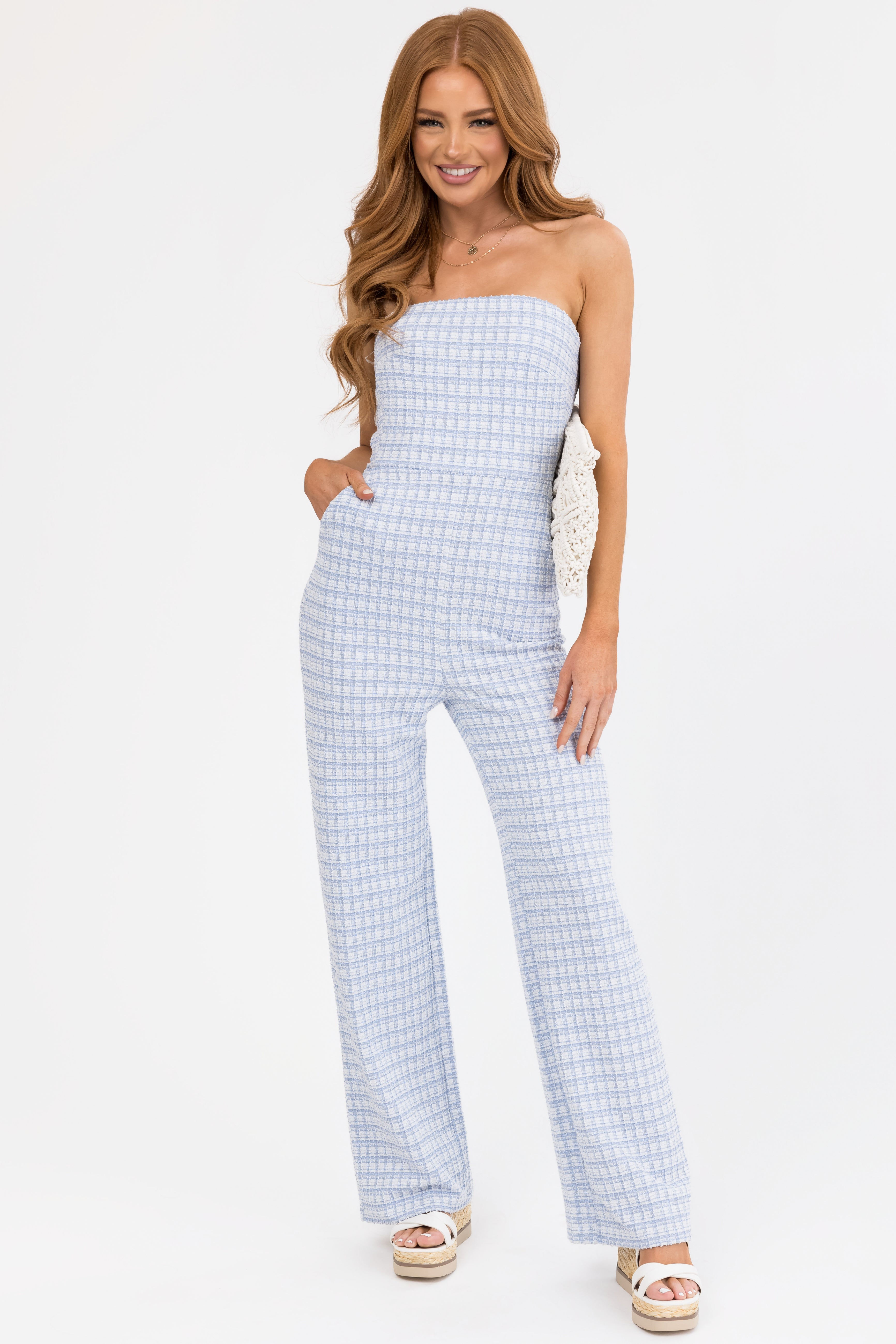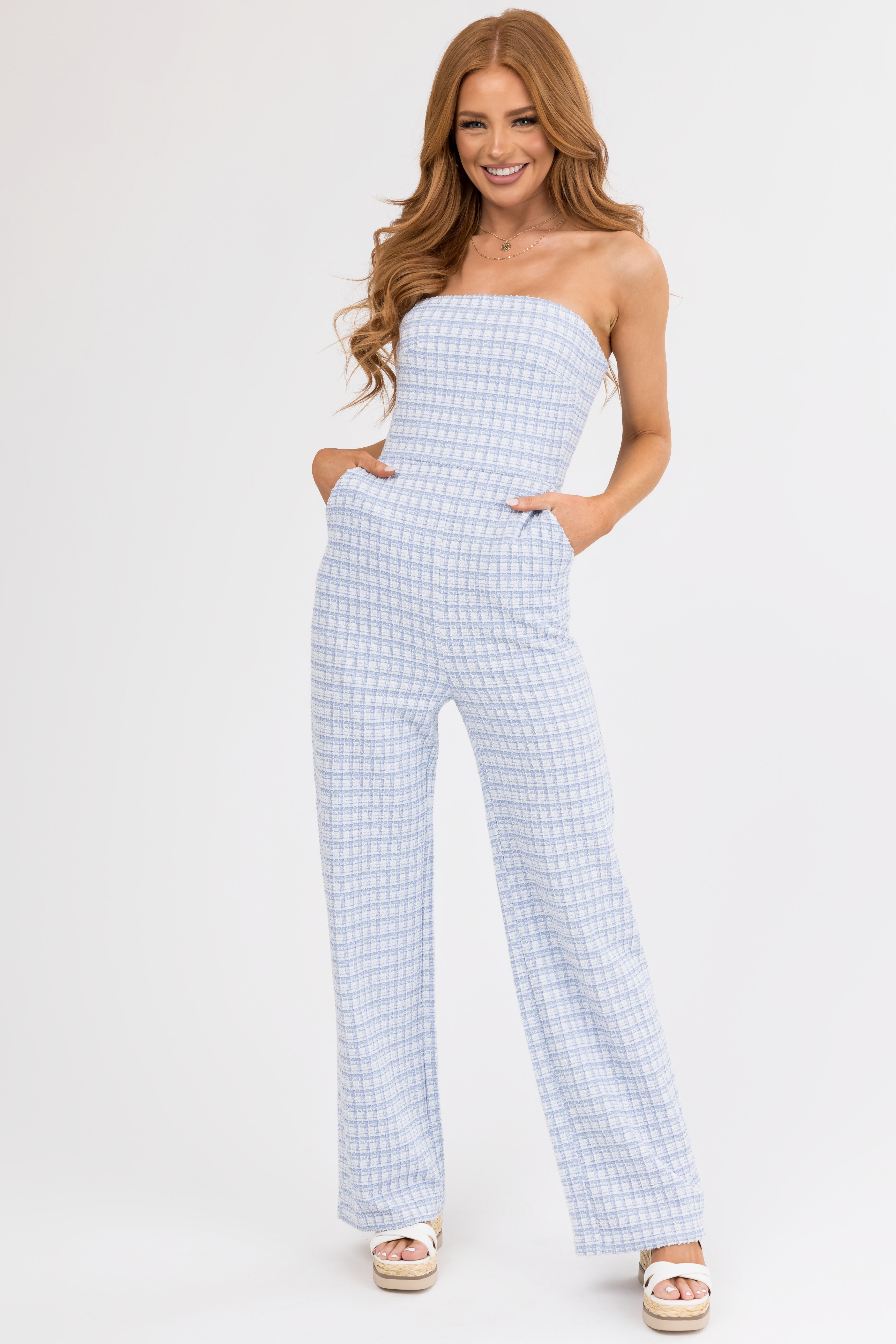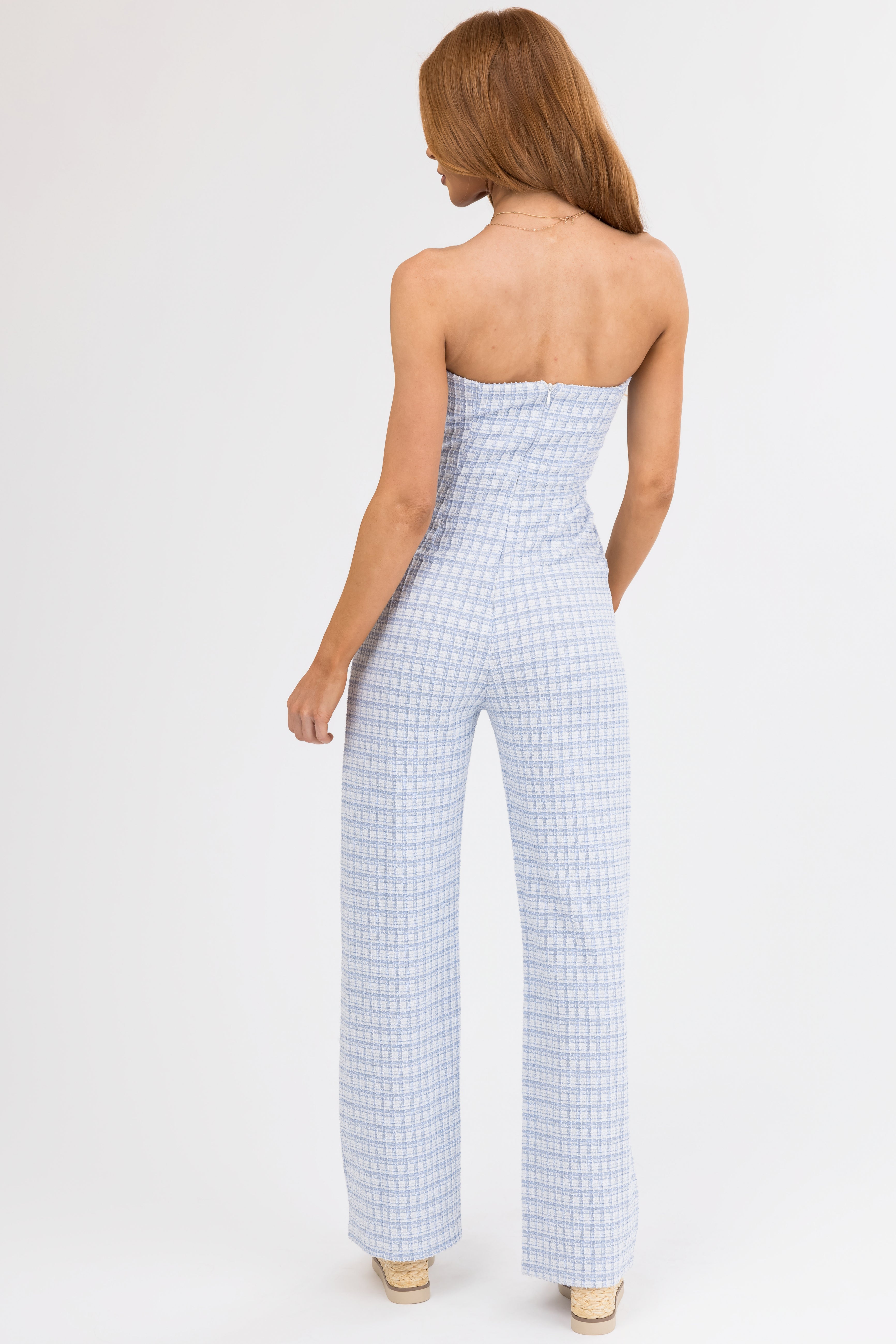 Look effortlessly chic in this Sky Blue Tweed Strapless Wide Leg Jumpsuit. Crafted from a semi-stretchy woven tweed blend, it features a back zipper, functional side pockets, and a flattering wide leg design. The grip lining at the bust ensures secure wear, making it perfect for any occasion. Hand wash cold and line dry for best care results. Available in sizes S, M, and L.