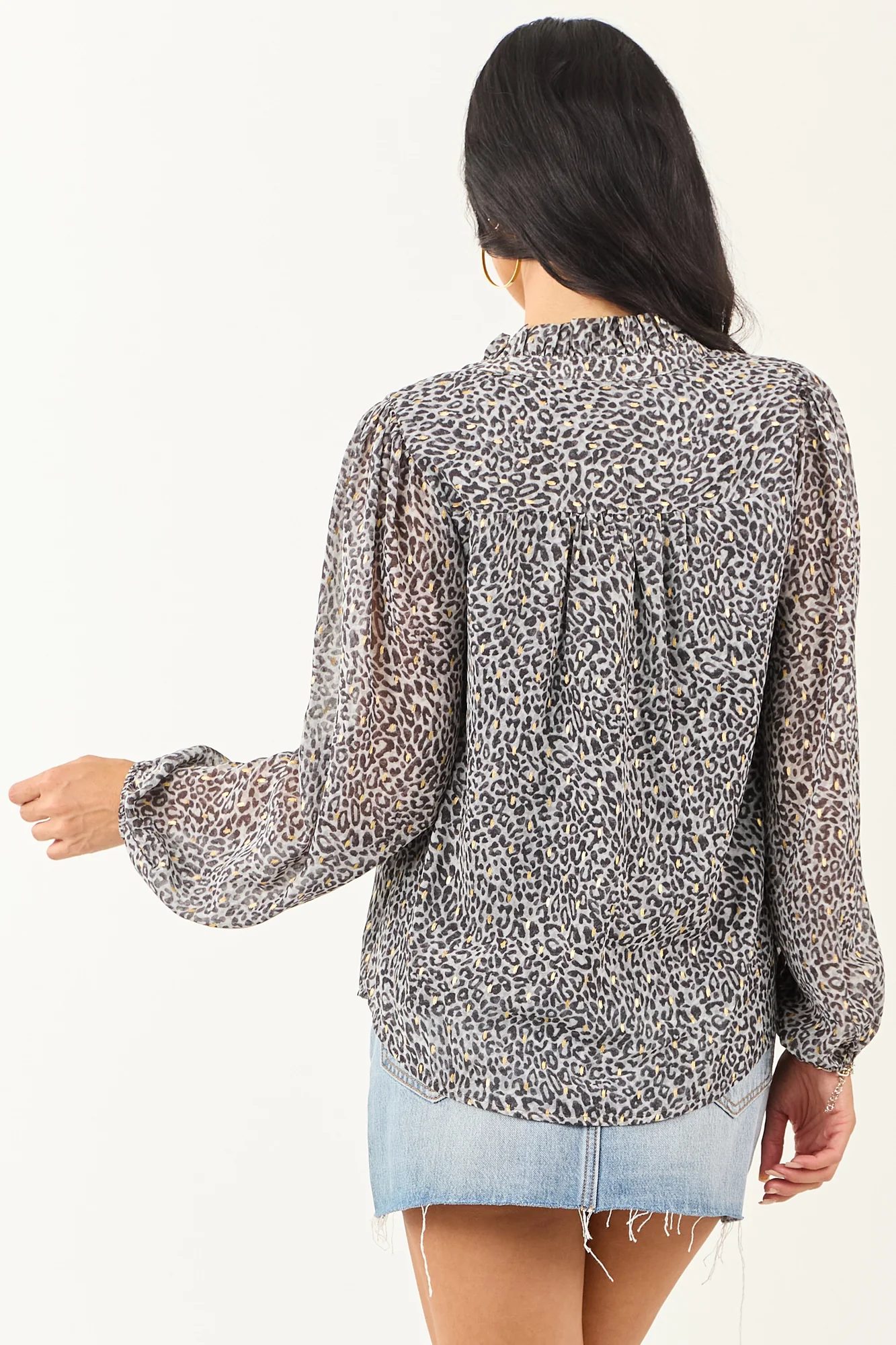 Elevate your wardrobe with this fierce yet polished Slate Leopard Print Top. Featuring soft frills, elastic cuffs, and sheer sleeves in Slate, Stone, Black, and Gold tones. Stay stylish in every size with S, M, L options available. This animal print top in 100% polyester is perfect for wild and sophisticated looks. Imported for unparalleled quality.