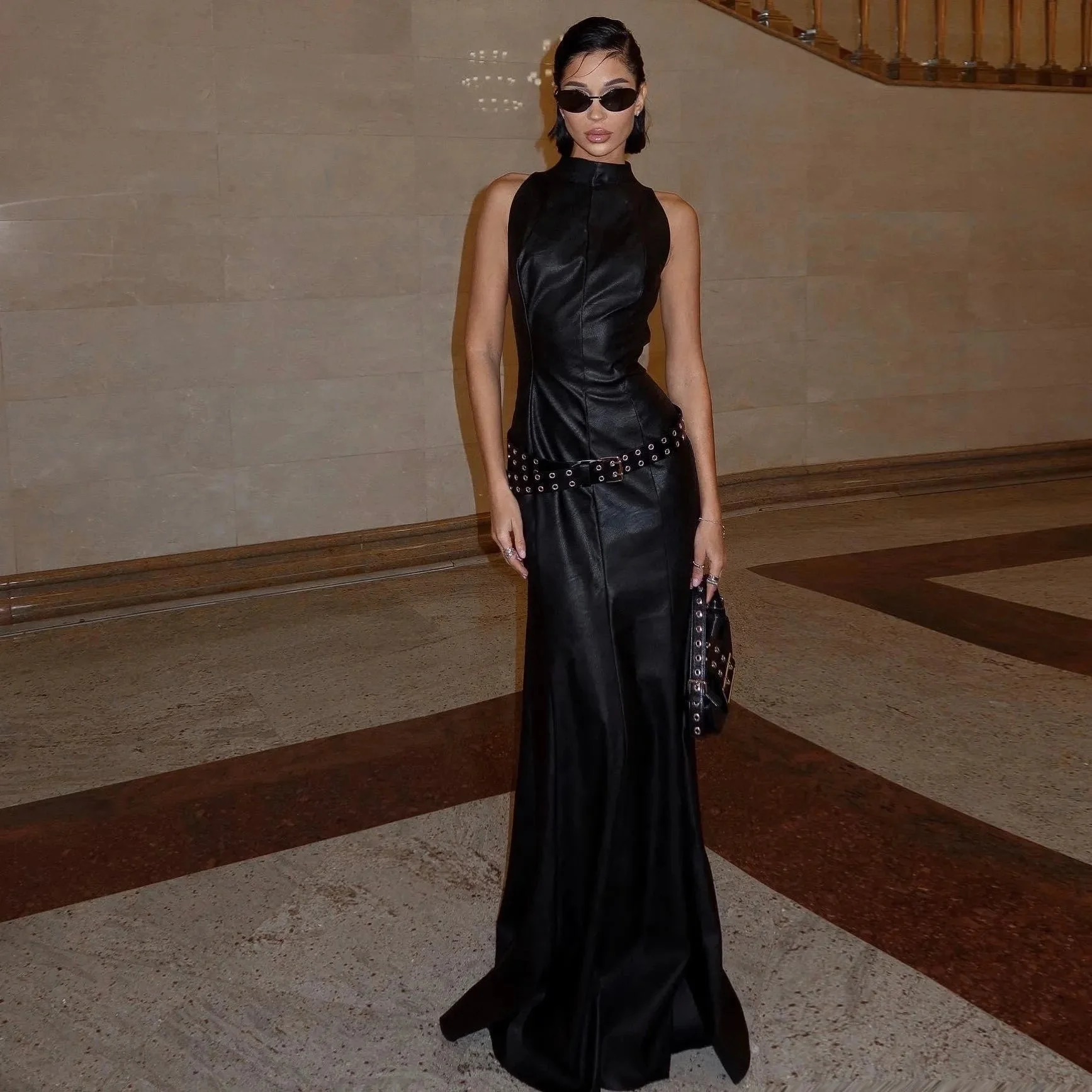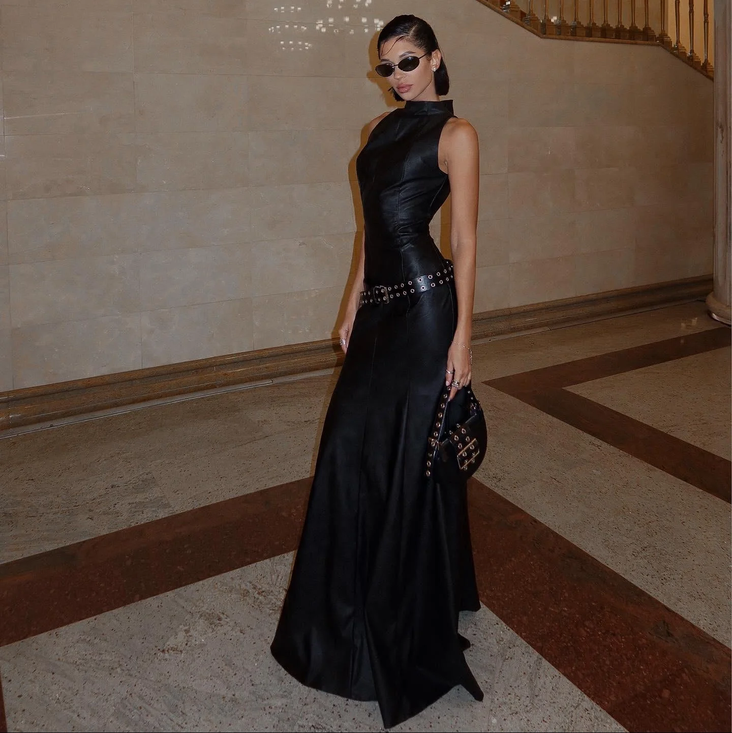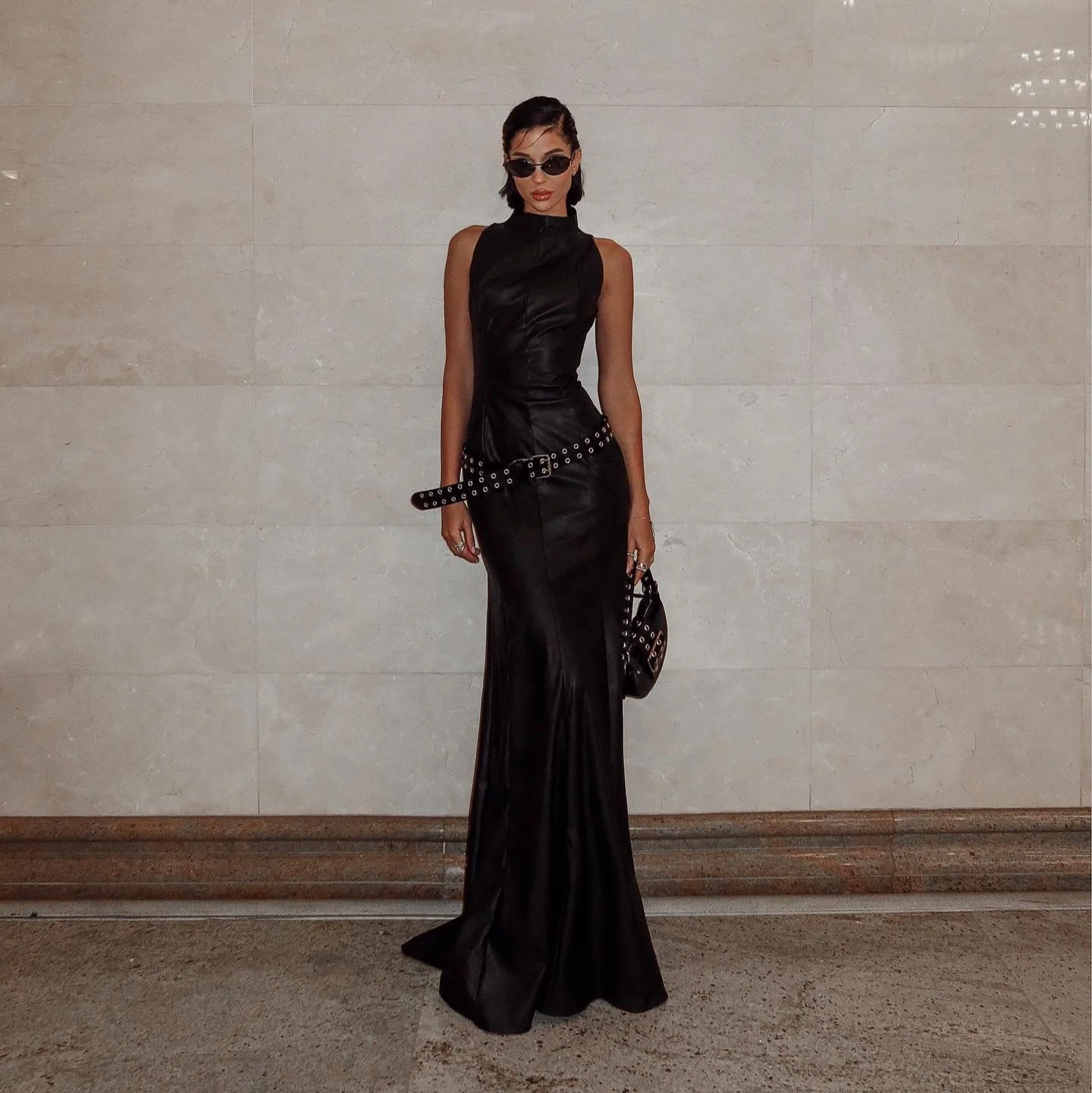 Elevate your style with our sleek Black Faux Leather Maxi Dress. Designed to command attention, the structured silhouette contours your figure, while the high neckline exudes elegance. Perfect for upscale events or fashion-forward parties, pair it with pointed heels for a memorable evening look. Explore unique styling tips on our Instagram @mermaid_way. If the fit isnt perfect, enjoy a complimentary size exchange.