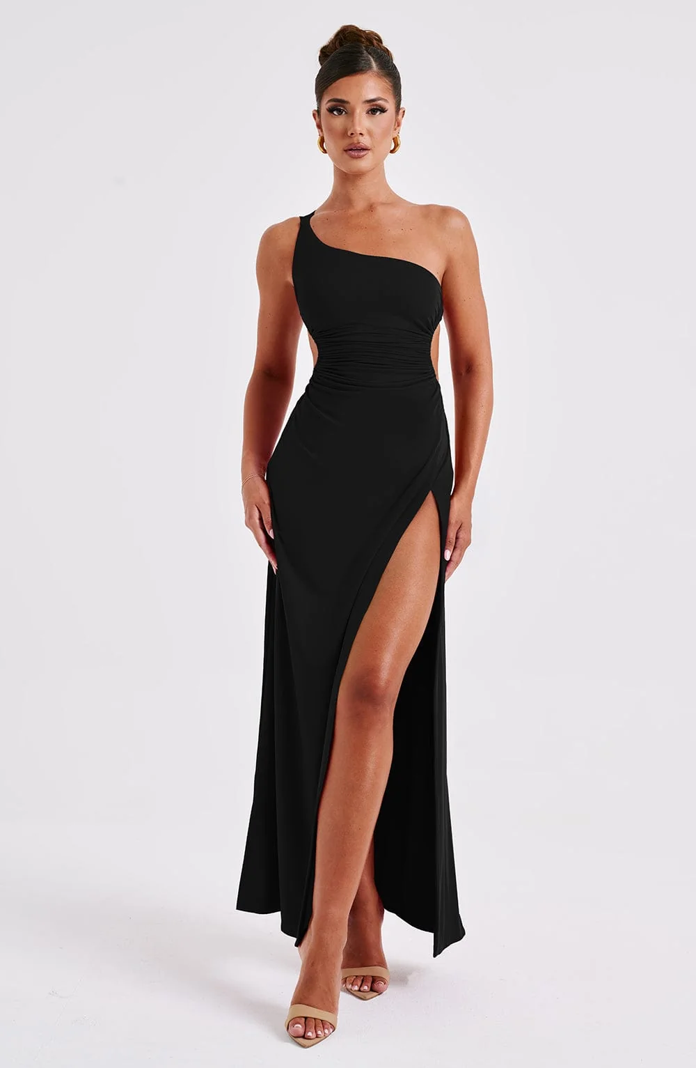 Indulge in the moment with our premium soft black maxi dress, Alecia. Designed to hug every curve gracefully, this dress features a flattering twist strap shoulder, gathered waist detail, and a showstopping low back with an asymmetric tie closure. Perfect for dinner dates, girlsnights out, or glam events. Crafted from high-quality slinky fabric, fully lined for extra comfort. With a thigh-high split adding a touch of allure, this maxi dress in classic black is a must-have for any chic wardrobe. Model is wearing size XS.