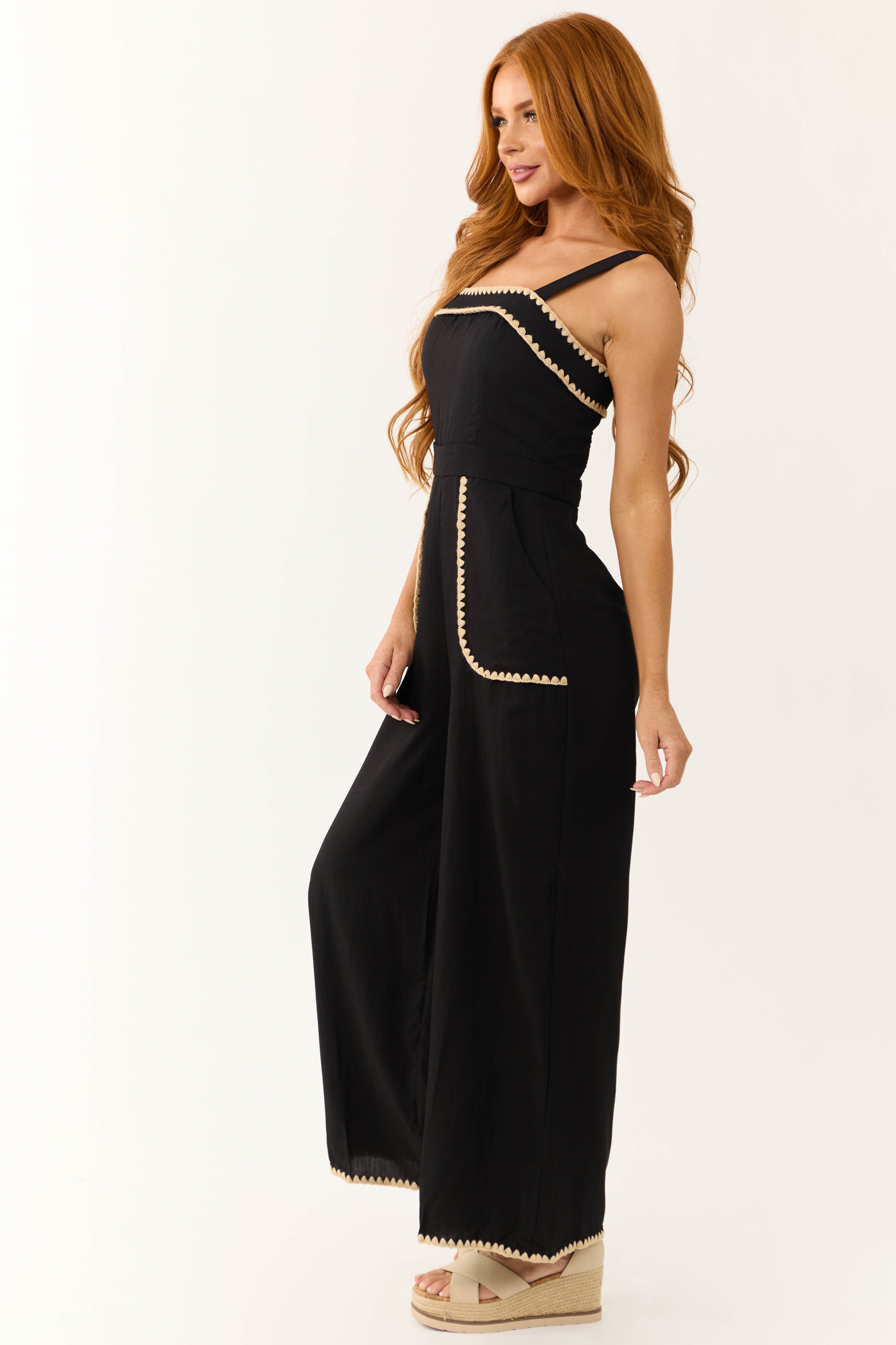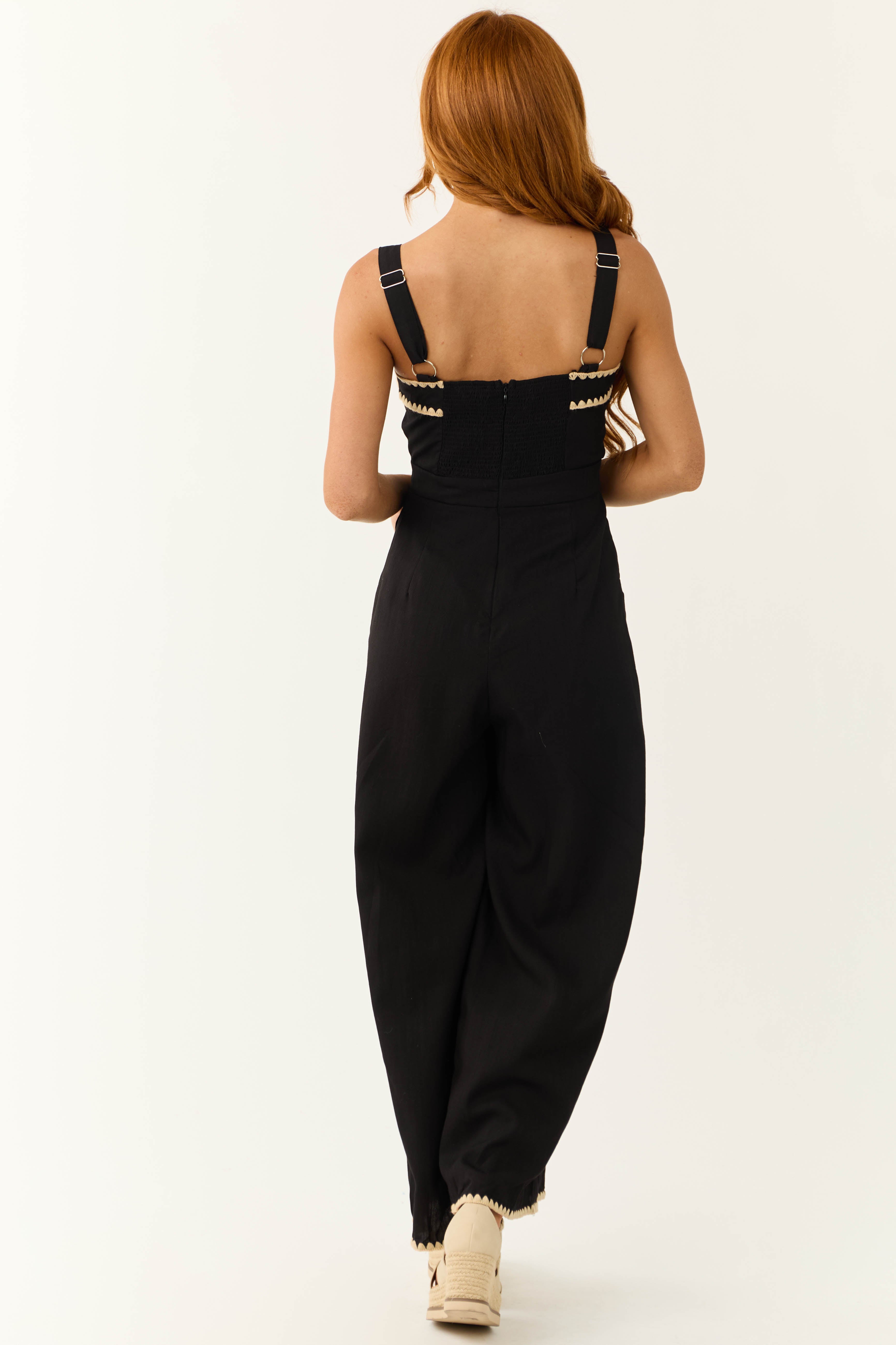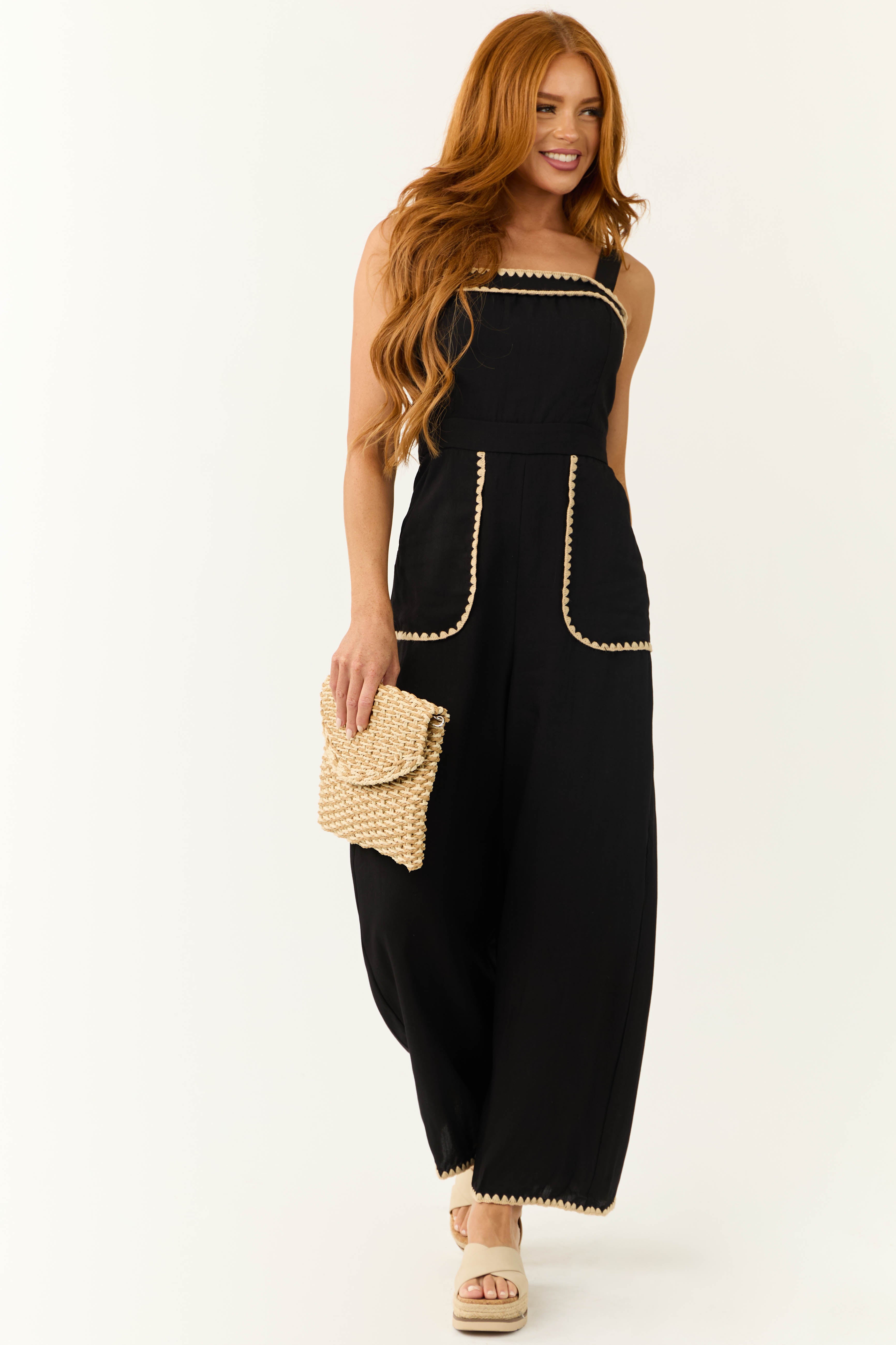 This chic black jumpsuit features contrast stitching in a stylish shade of sand, adjustable straps, a back zipper with hook and eye closure, smocked back, side pockets, and wide legs. Made of high-quality materials including 49% Rayon, 34% Polyester, 17% Nylon with 100% Rayon lining. Imported. Available in sizes S (2-4), M (6-8), and L (10-12), with bust measurements of 31″, 33″, and 35″, waist measurements of 26″, 28″, and 30″, inseam of 27.5″, torso length of 30″, 31″, and 32″. Elevate your fashion with this must-have piece!