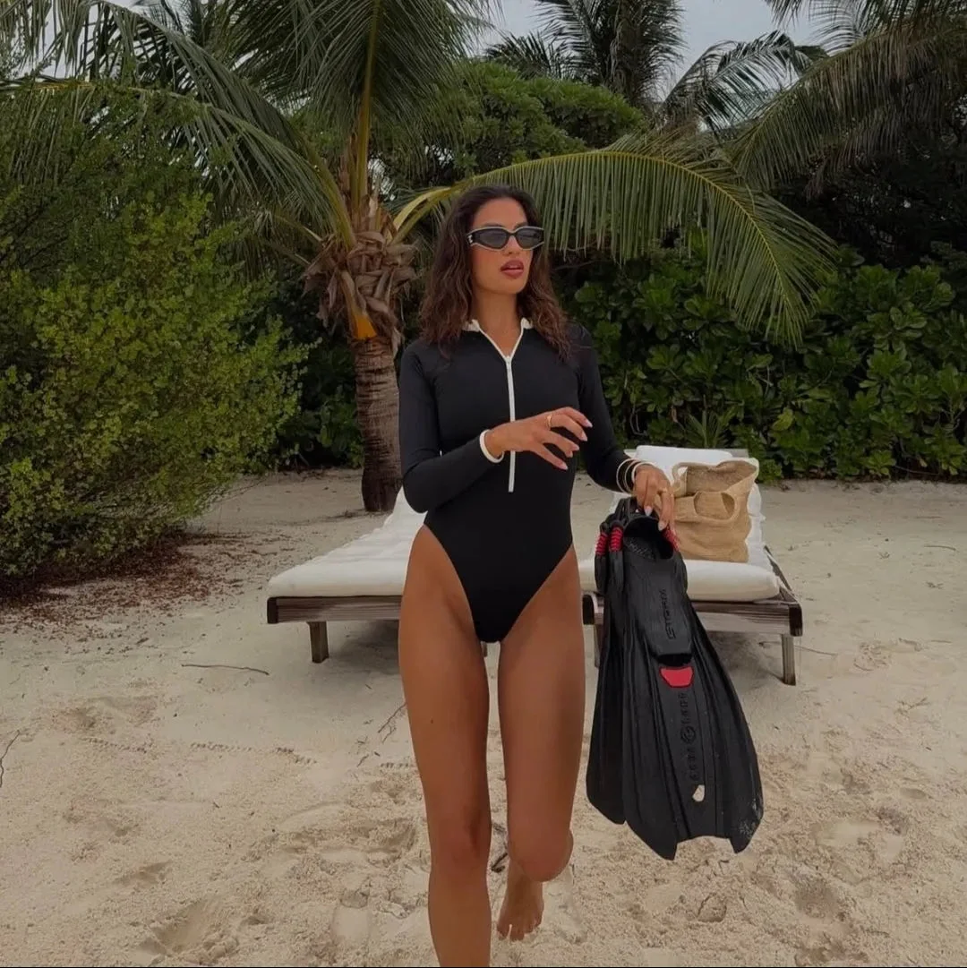 Experience the ultimate comfort and style with our Sleek Black Zipper Long Sleeve Swimsuit. Whether youre swimming, surfing, or simply soaking up the sun, this fully lined swimsuit with UPF50+ sun safe fabric is your perfect companion. The color block neckline and locking zipper detail not only enhance your look but also provide security for worry-free adventures. Feel the soft, smooth fabric against your skin all day long. Follow us on Instagram @mermaid_way for style tips and ideas. Size exchange available if needed!