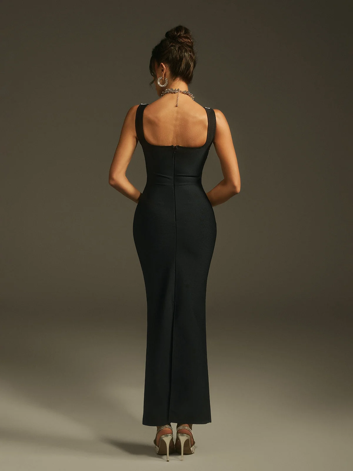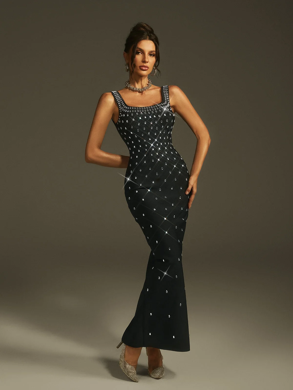 Indulge in the luxurious elegance of the Sleeveless Crystal Bandage Maxi Dress. This dress is designed to delicately accentuate your silhouette with a sleek bandage fit that embraces your curves. The sparkling crystal embellishments add a touch of opulence, making it perfect for upscale events and special occasions. Elevate your style and create memorable moments effortlessly. Crafted from 95% Polyester and 5% Spandex, featuring an invisible zipper at the back for easy wear. Experience the slight stretch of this exquisite dress, ensuring a comfortable fit all day. Pro tip: Dry clean only for lasting quality and color retention. Available in various colors. Model showcased wearing size S.