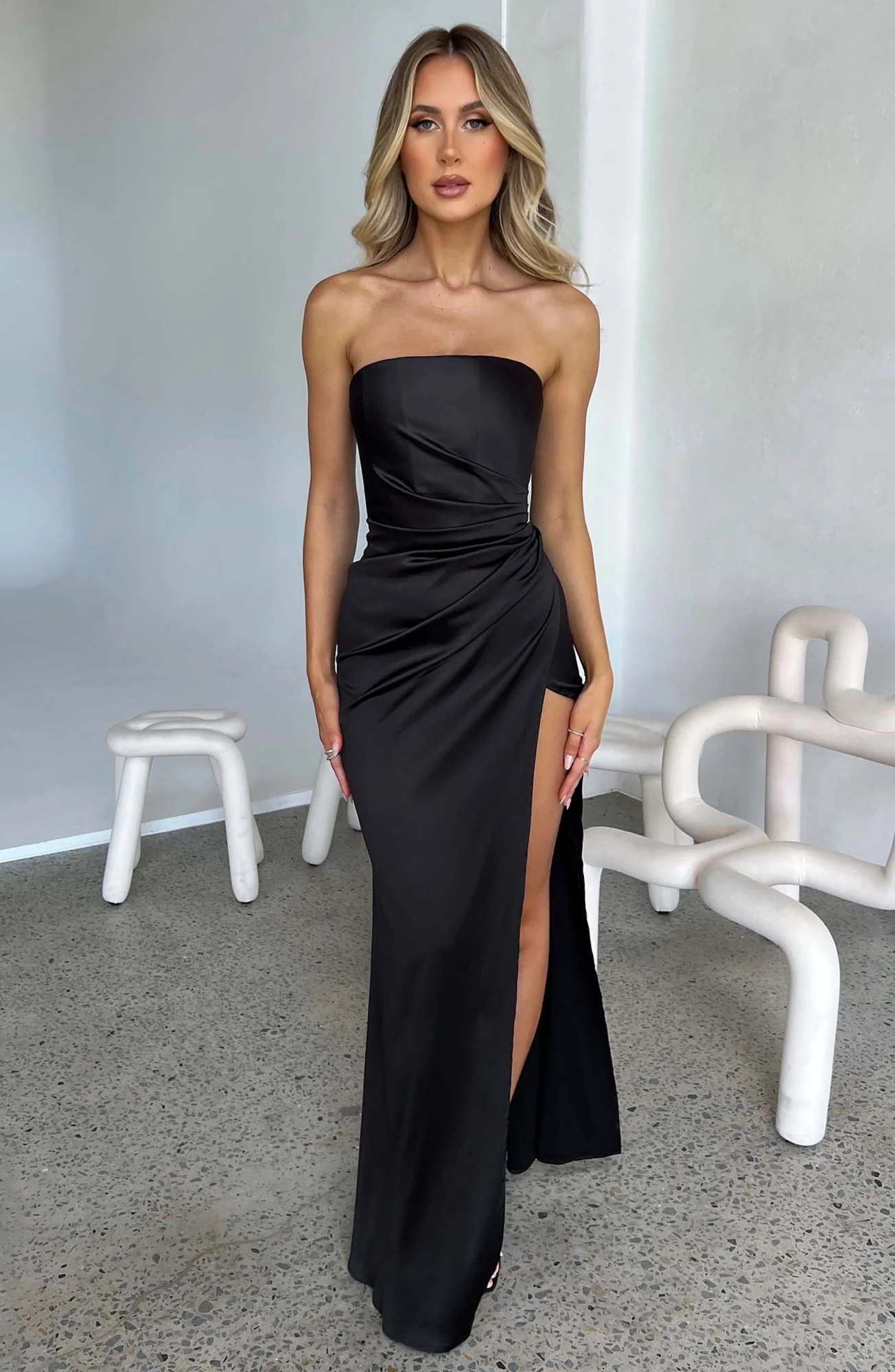 Make a stunning entrance in the sleek satin maxi gown dress in black. This luxurious heavy stretch satin garment hugs the body in all the right places. Designed with a hidden corset to beautifully cinch the waist, the dress boasts a strapless cut, elegant drape detail to the bust, and a daring thigh-high split. The perfect choice for a statement black dress to impress at any formal occasion or glamorous event.