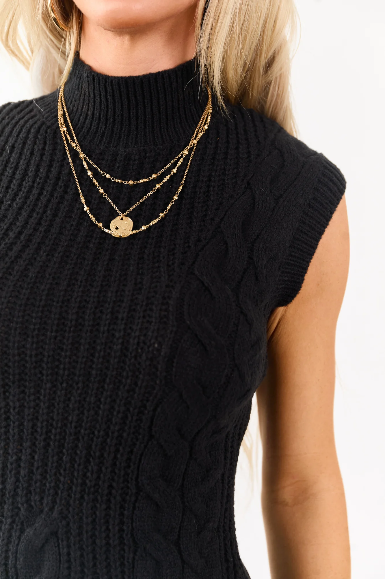 Discover our black mock neck cable sweater short dress, perfect for day-to-night styling. This sleeveless dress offers warmth with its stretchy cable knit design. The garment specs for size SM include a Bust of 34, Waist of 27, and Length of 36. Made of 100% Polyester, this dress is slightly sheer and unlined for a modern look. Imported and fits true to size. Model is wearing a size Small. Ideal for fall season fashion. Elevate your wardrobe with Lovelo x GeeGee brand love.
