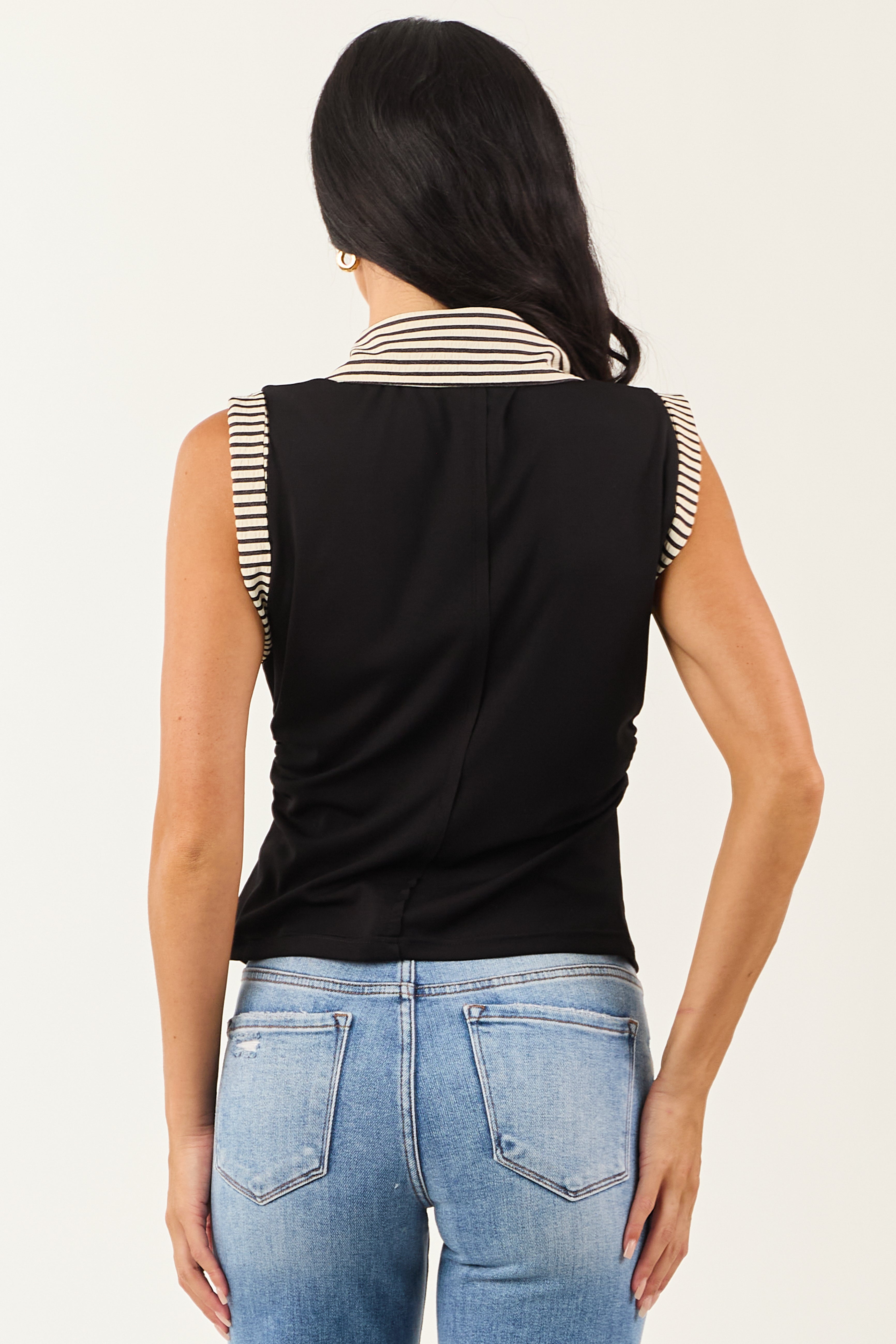 Upgrade your wardrobe with our Sleeveless Black Striped Button-Up Tank Top in sizes Small, Medium, and Large. This office chic top features a ruched bust for a flattering fit and a stylish striped trim in Black and Coconut shades. Made of high-quality 90% Polyester and 10% Spandex with 100% Polyester contrast, this stretchy knit tank is perfect for a fashion-forward look. Imported and designed for comfort, this tank is a must-have for any modern womans collection. Model is wearing a size Small. Models Profile: Size 1, Height 59″, Bust 34″, Waist 26″.
