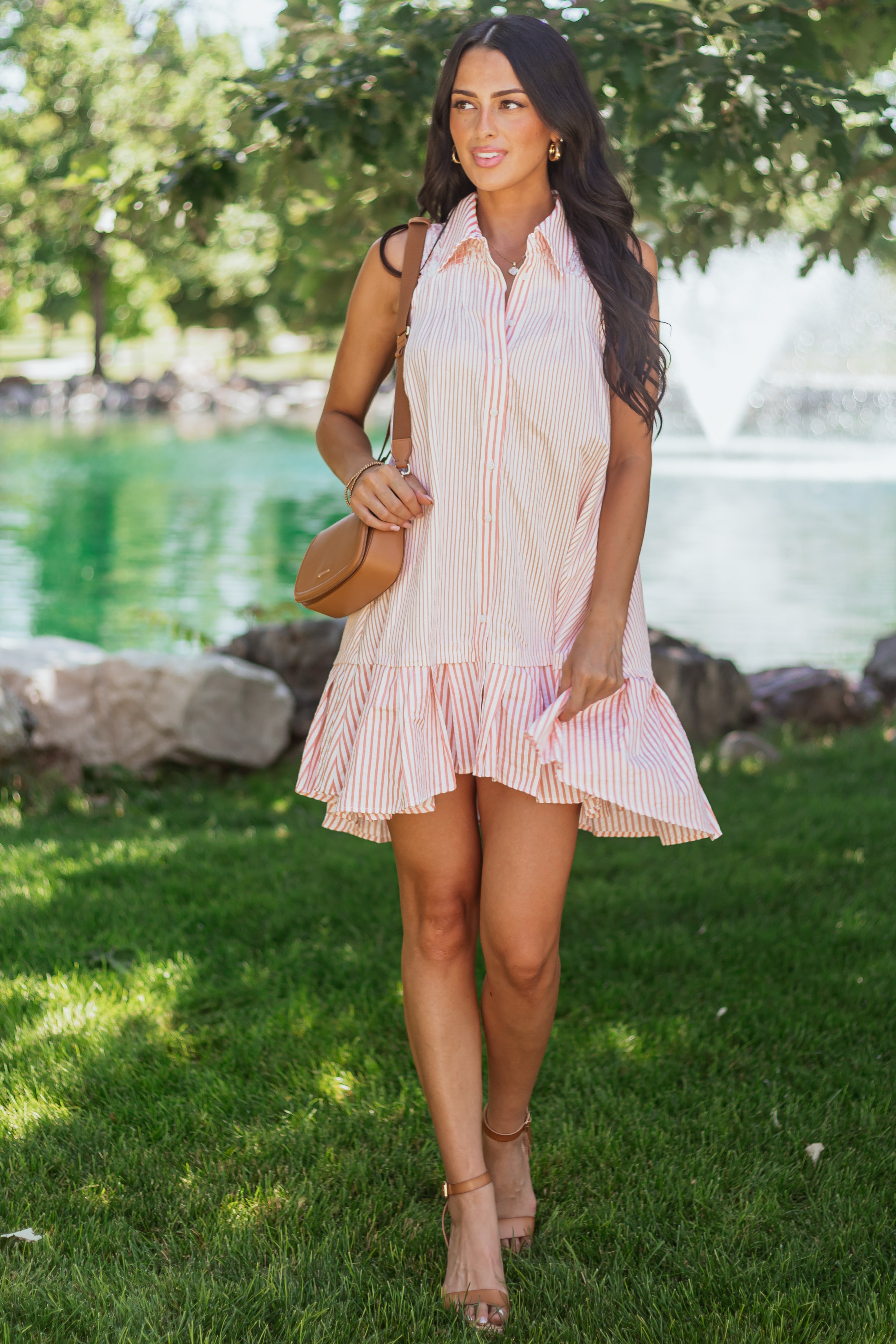 Experience ultimate comfort and style with our Sleeveless Mini Dress in charming coral and off-white stripes. This chic swing dress features a smocked yoke, button-down front, high-low ruffle hem, and convenient pockets. Made of 100% polyester, its perfect for a preppy yet playful look. Feel cool and cute in this versatile wardrobe essential.
