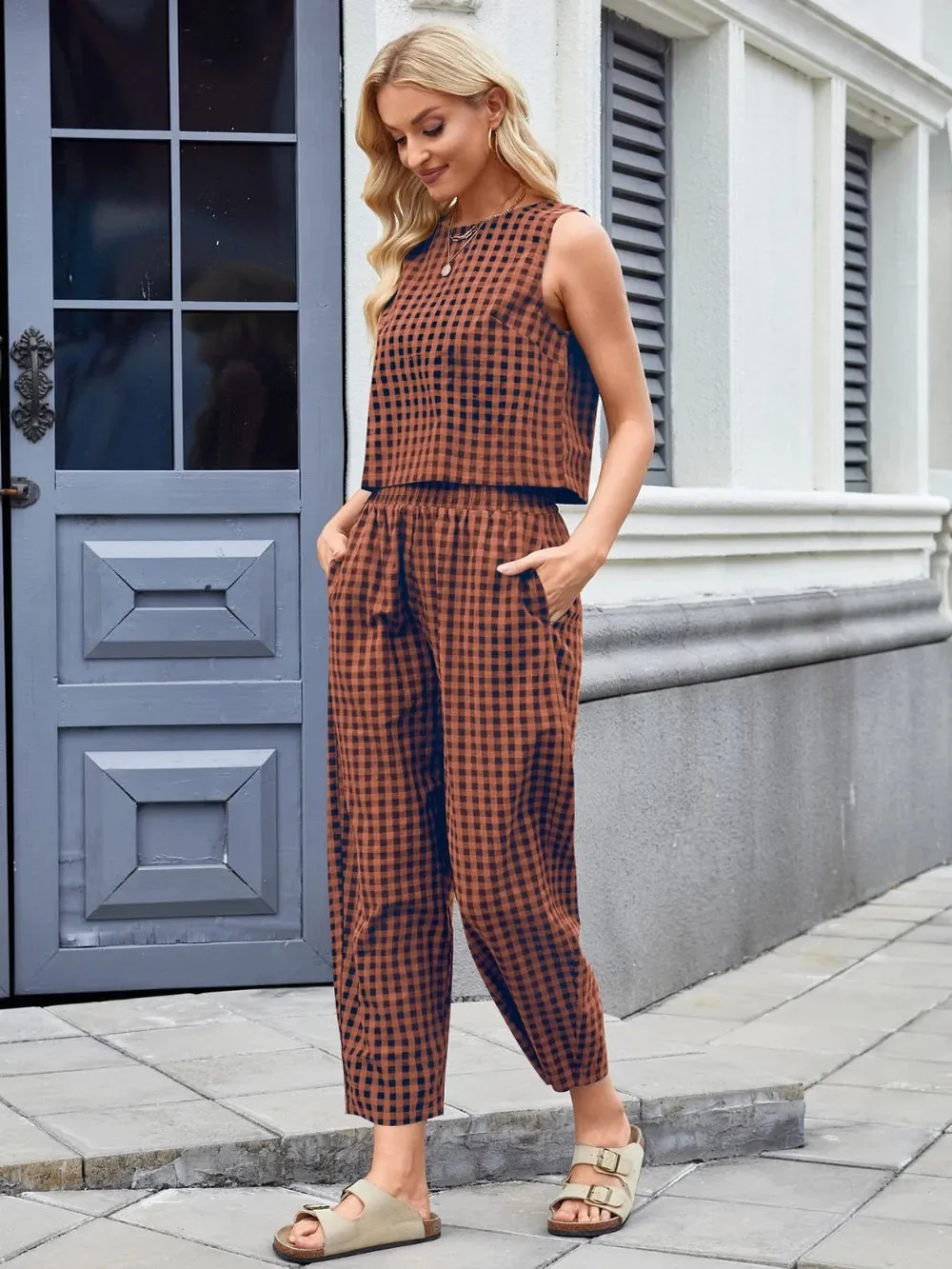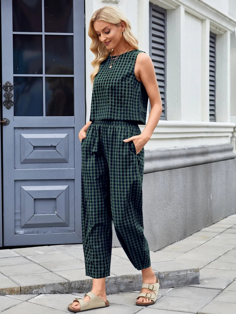 Upgrade your wardrobe with this chic Sleeveless Plaid Top and Navy Pants Set. Crafted from 100% rayon for comfort, this two-piece outfit features a stylish top with pockets complemented by perfectly matching navy pants. Machine washable for easy care. Elevate your style effortlessly with this versatile set. Available in multiple sizes to suit your preference.