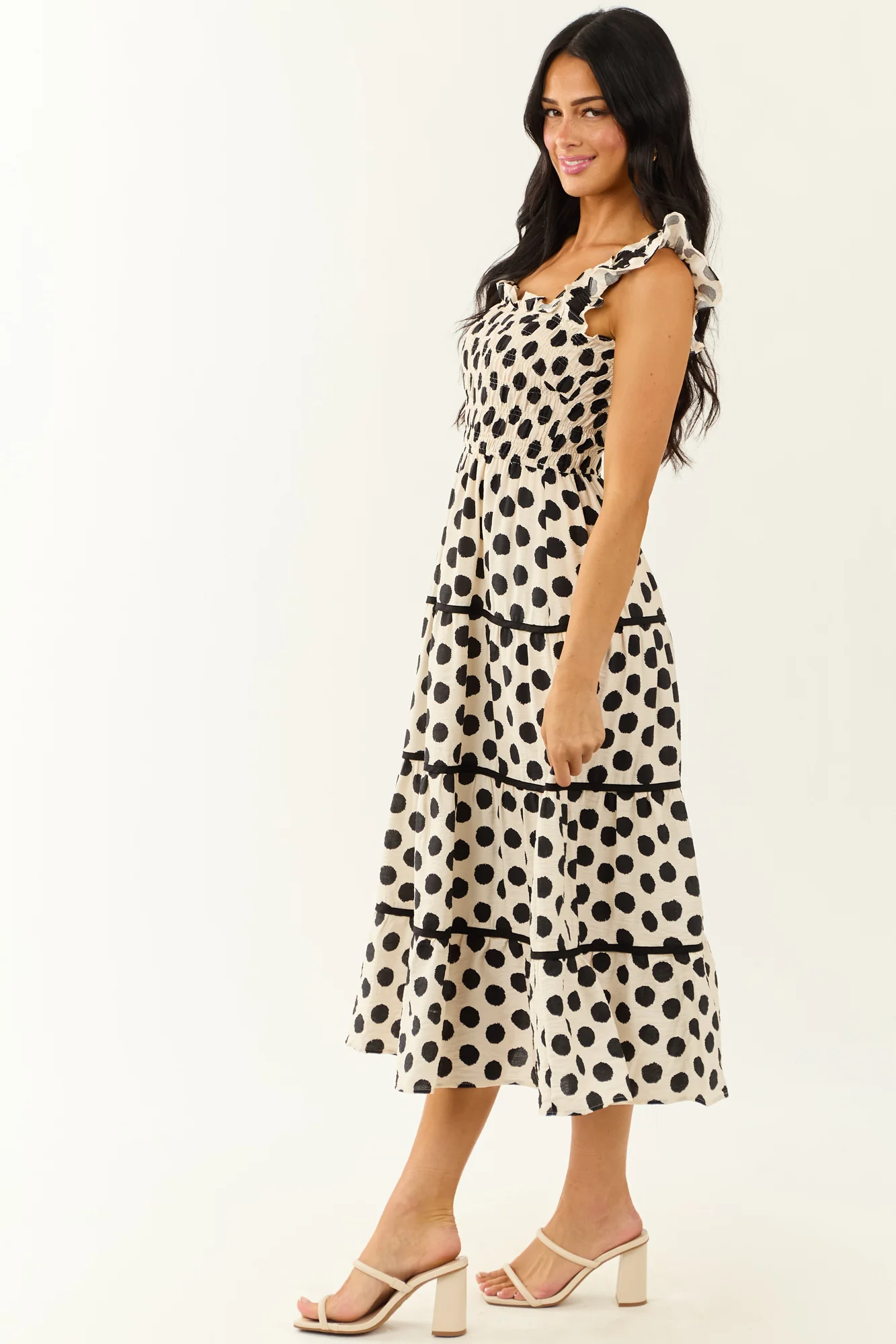 Make a fun fashion statement with this vintage charm polka dot dress in cream and black. This dress features a stretchy smocked bodice, elastic ruffle straps, and a tiered skirt for a playful yet elegant look. It is made of 80% Rayon and 20% Nylon with a skirt lining of 97% Polyester and 3% Spandex. Importantly, due to the fabric’s print and sewing process, slight variations may occur between pieces. Embrace timeless style with this versatile piece that transitions seamlessly from day to night. Model Size: 1, Height 59″, Bust 34″, Waist 26″.