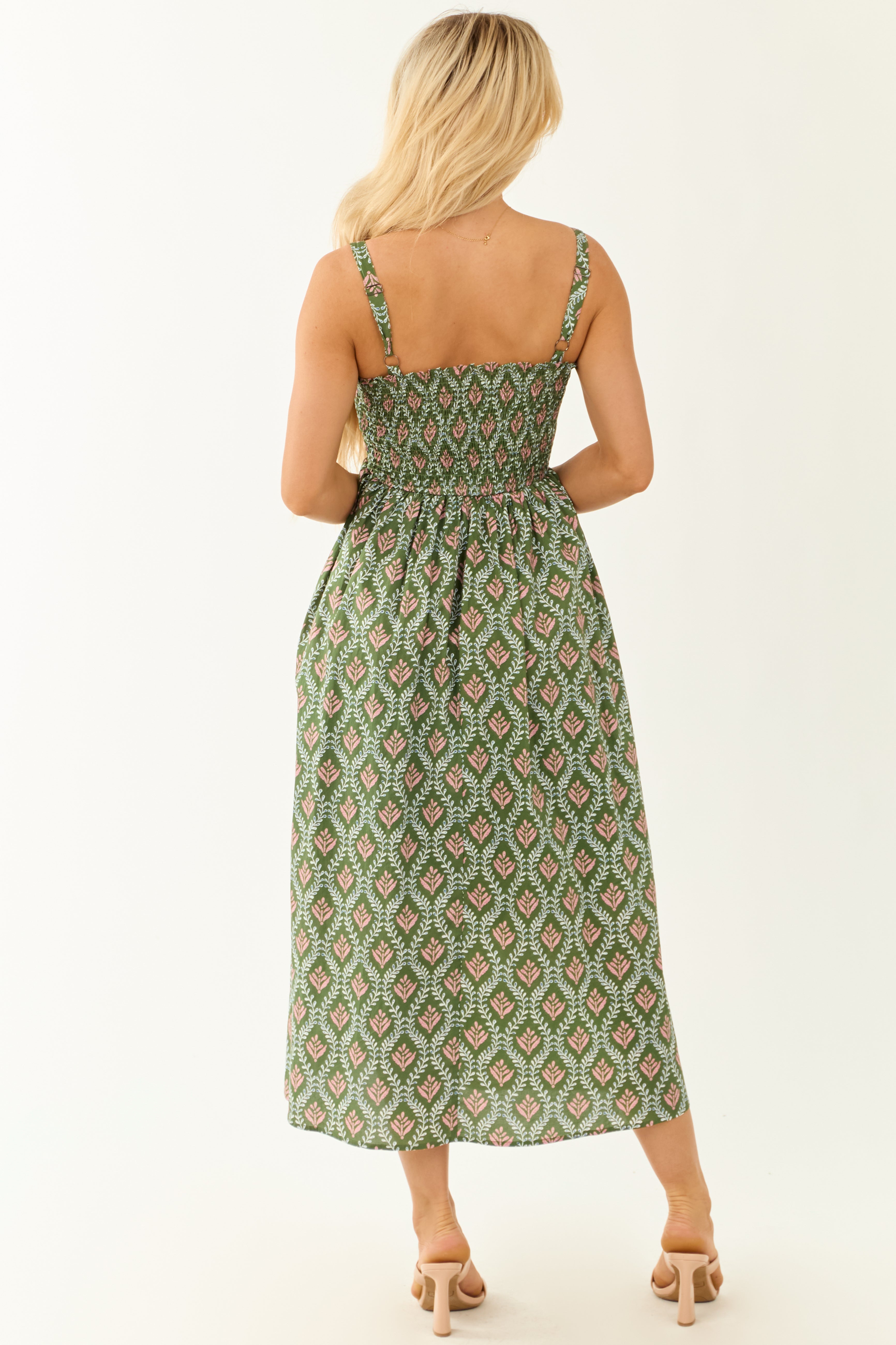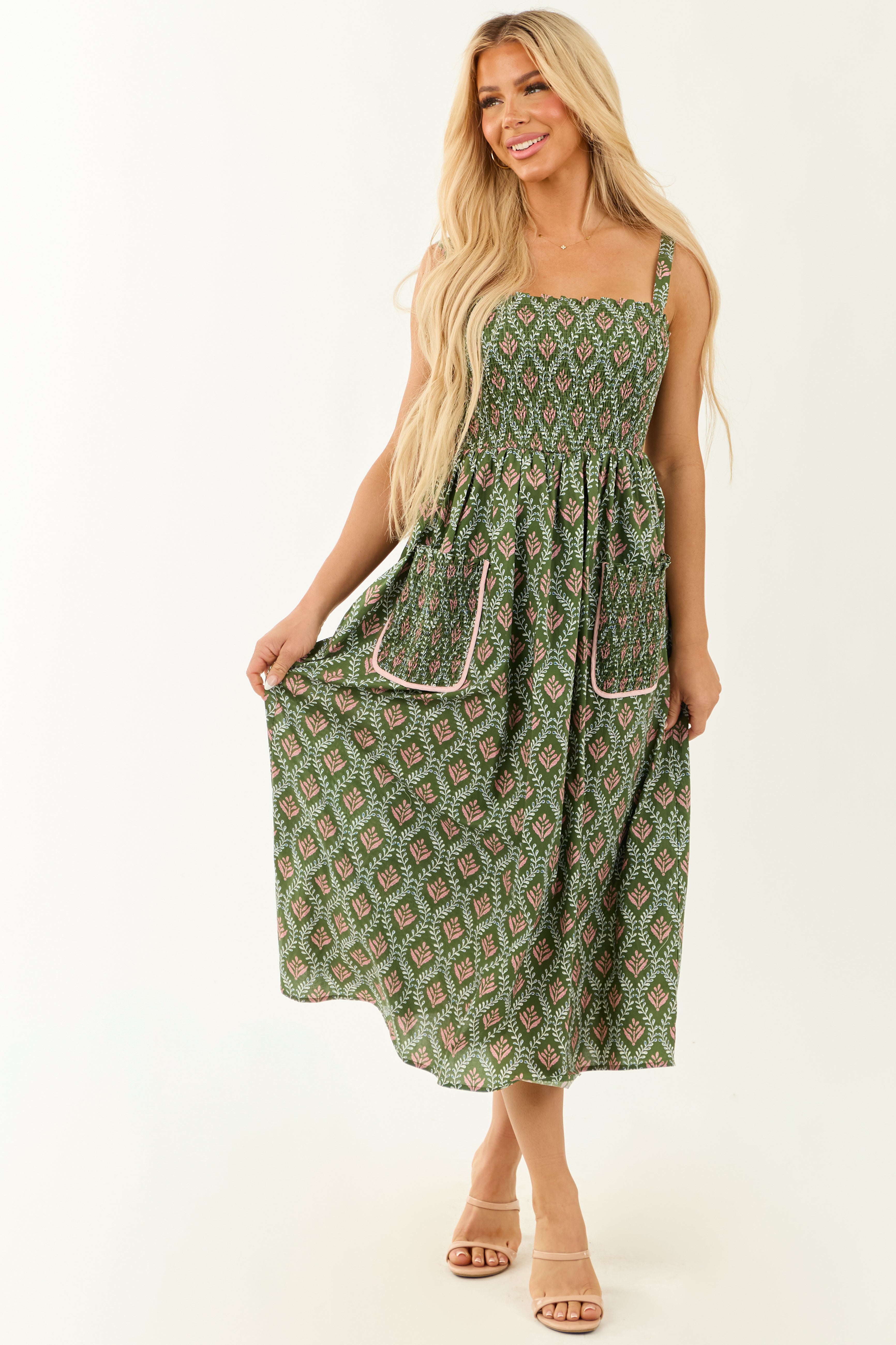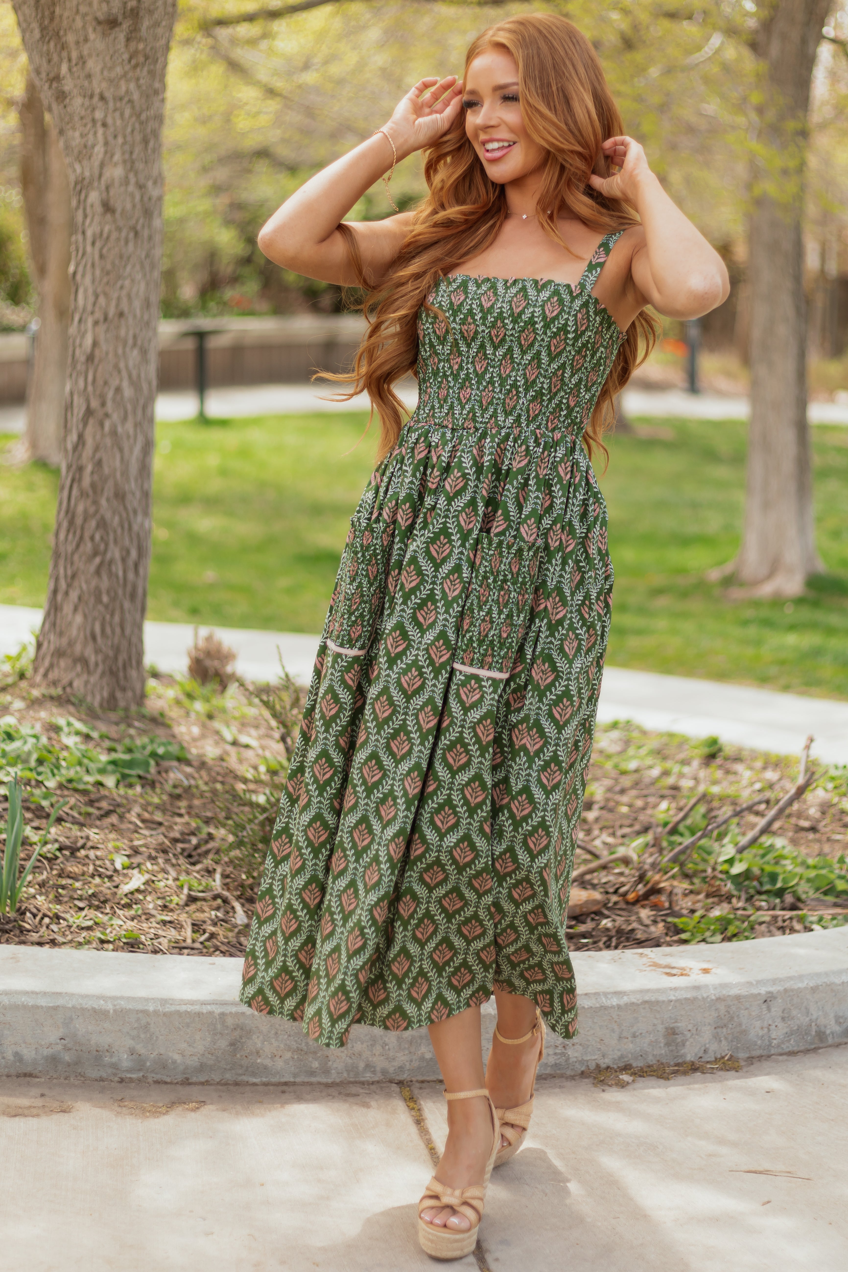 Feel effortlessly chic in this Sleeveless Smocked Olive Print Midi Dress. Crafted from 100% cotton, this dress features a fitted smocked torso, adjustable straps, and two smocked pockets with a Baby Pink trim. Perfect for brunches, gallery strolls, weddings, or garden parties, this flowy and fitted midi dress is a versatile addition to your wardrobe. The frill square neckline adds a charming touch while the abstract print in Olive, Cobalt, Off White, Baby Pink, and Fuchsia exudes modern elegance. Hand wash cold, line dry, and iron at low heat for best care results. Note: Due to the unique print and sewing process, each piece may vary slightly. Model is wearing a size Small. Size measurements: Bust – 34, Waist – 25.