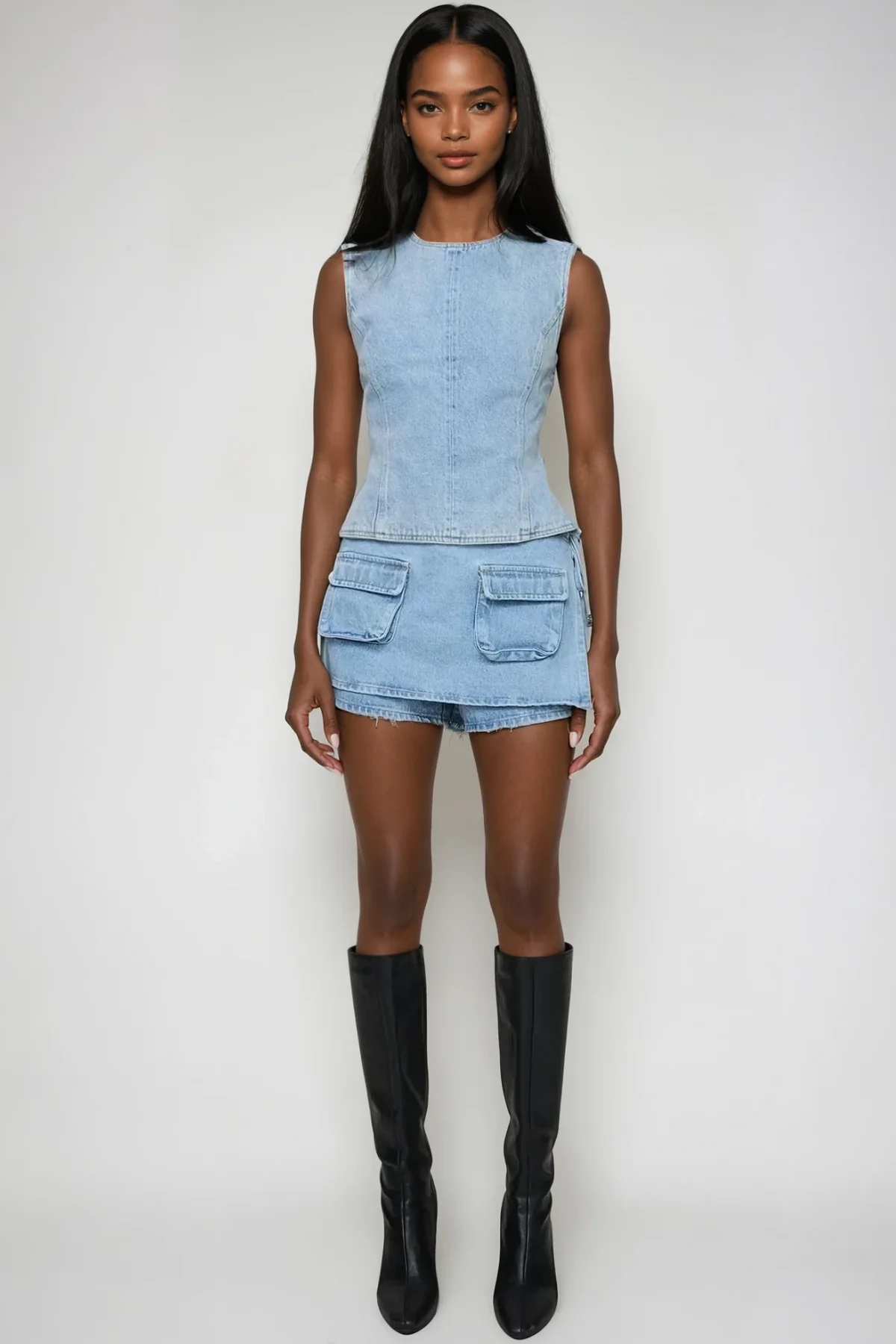 Upgrade your wardrobe with this versatile Slight Blue Denim Mini Skirt . Crafted with a deconstructed design and unique pocket details, this skirt is perfect for any casual or trendy outfit. Made of 50% Polyester and 50% Cotton, this skirt brings both functionality and style together flawlessly. Gentle machine wash recommended. The color may vary due to lighting in images. Discover the perfect blend of style and comfort today!