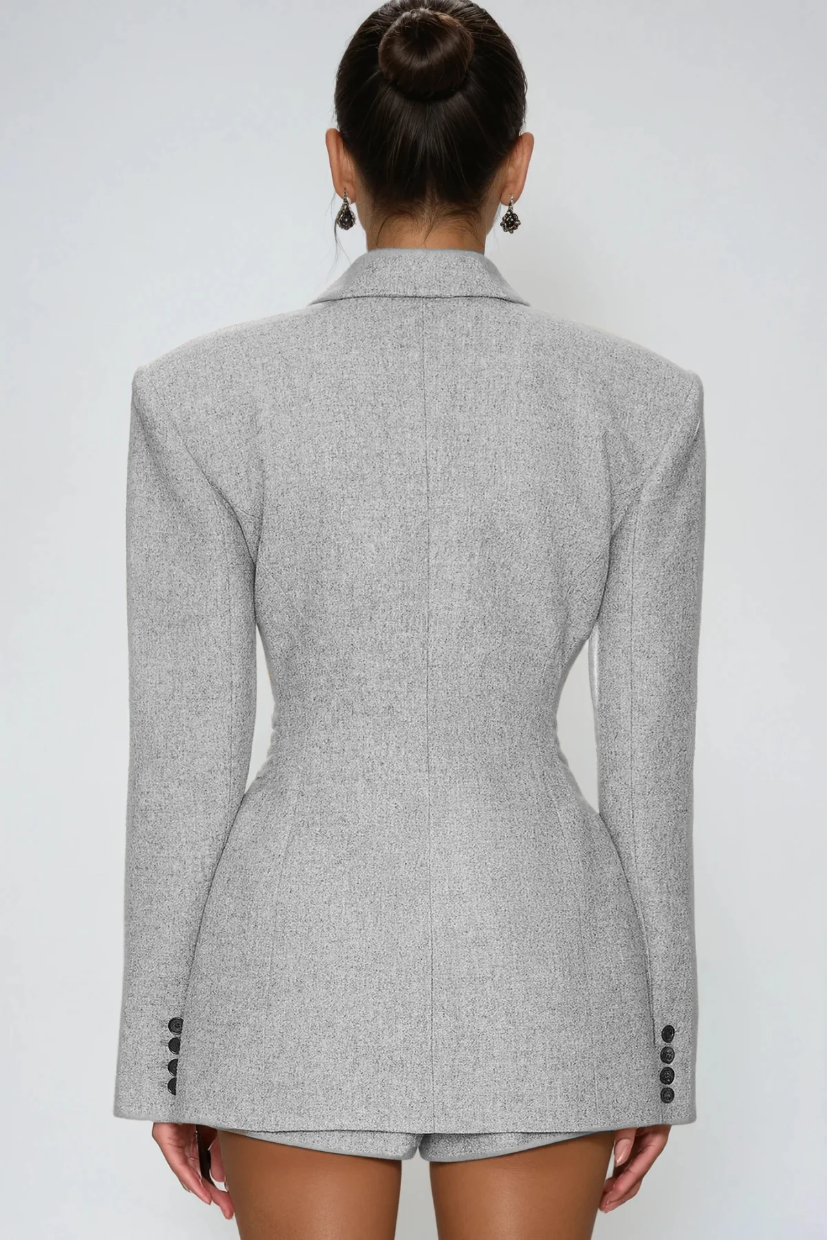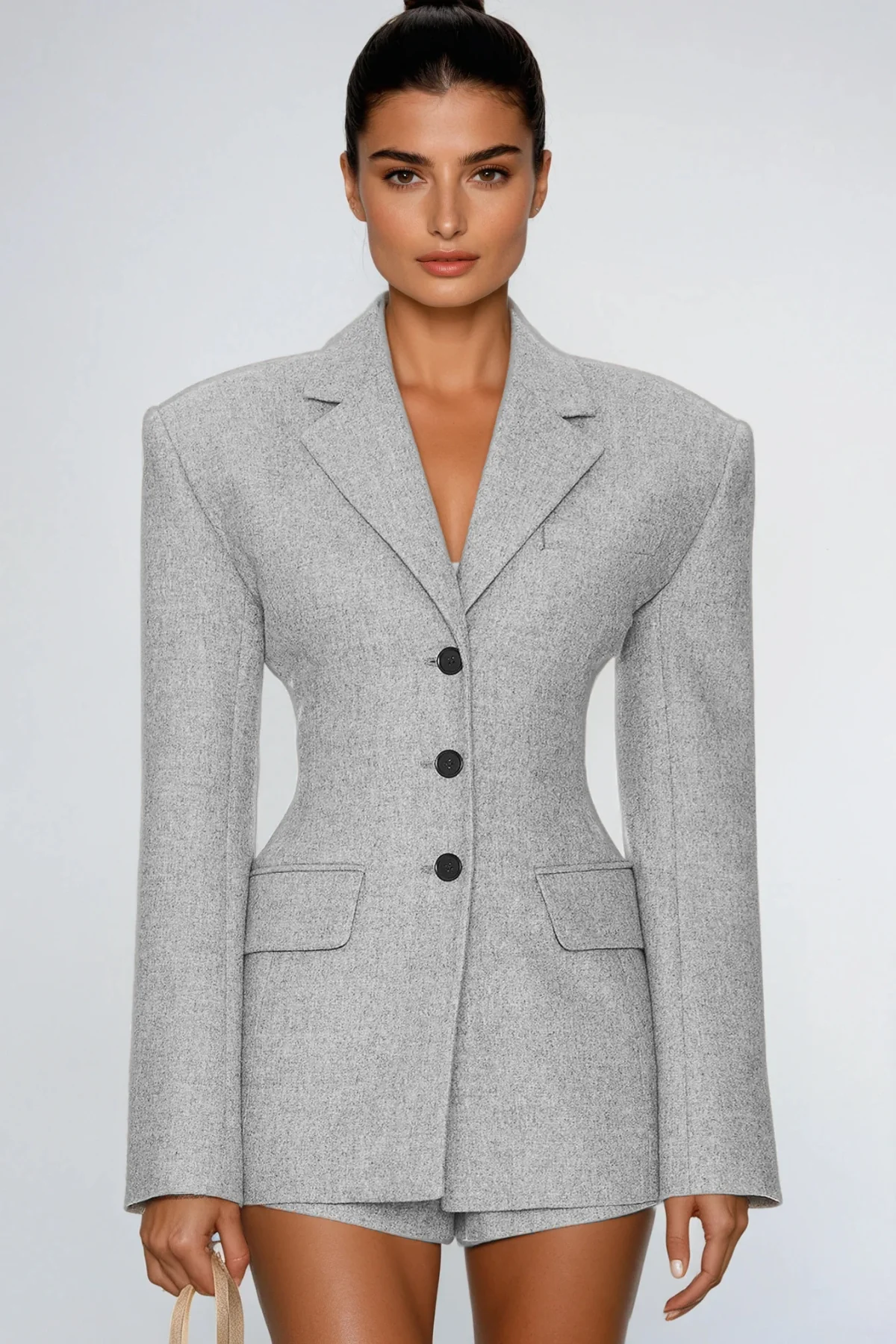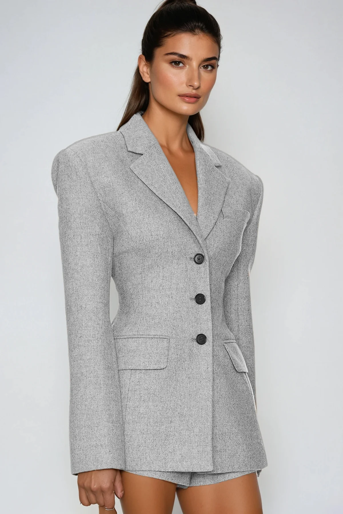 Indulge in the timeless sophistication of the Slight Grey Lapel Blazer. Crafted from premium fabric, this blazer offers durability and comfort. The subtle grey hue allows versatile styling for both formal and casual occasions. Featuring a classic lapel and structured silhouette, this blazer exudes elegance and polish. Elevate your wardrobe with this exquisite piece that ensures you stand out with grace and charm. Please note: Color may vary due to lighting.
