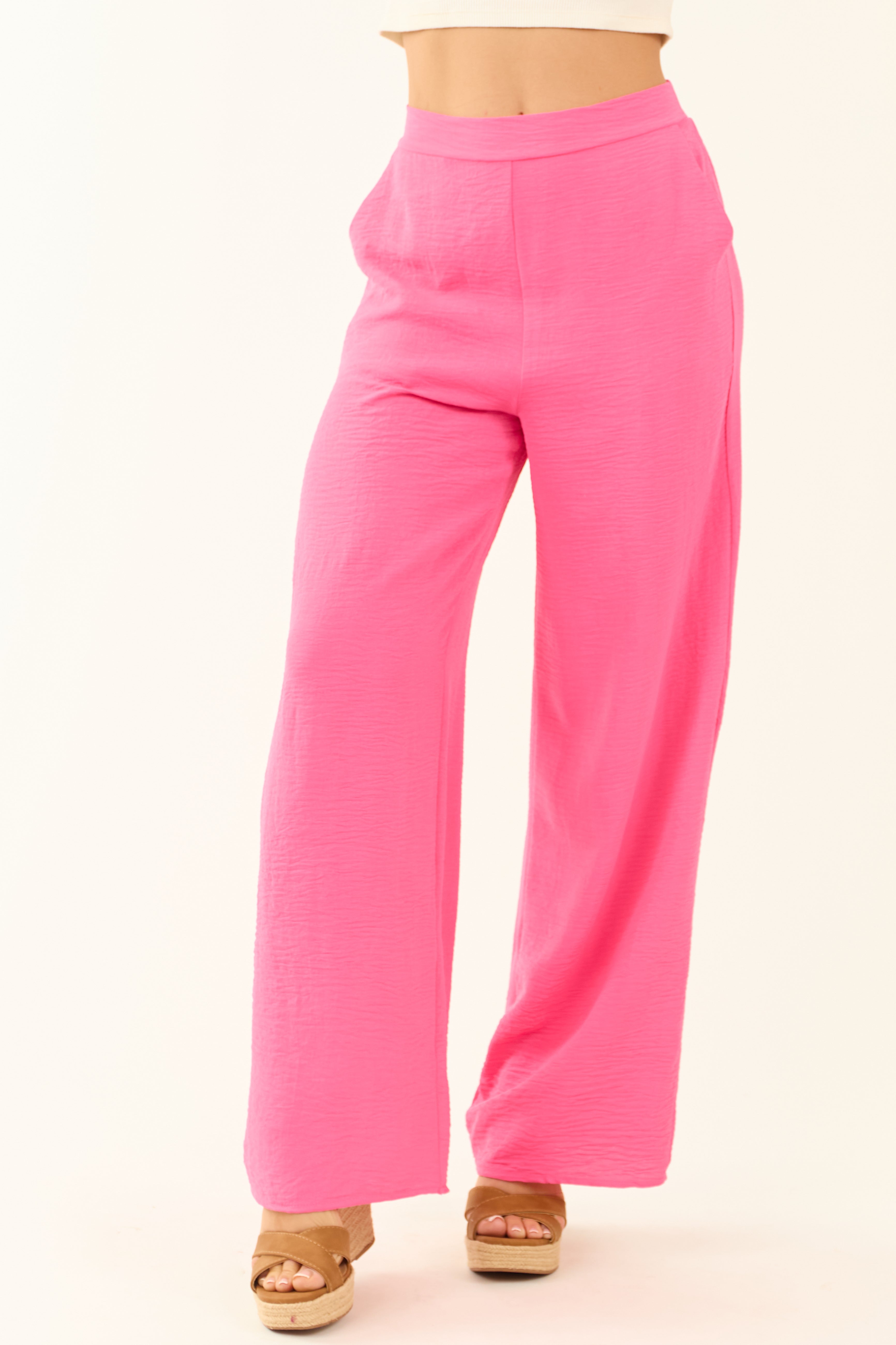 Upgrade your wardrobe with our fashionable Hot Pink Wide-Leg Pants! Available in sizes Small to Large and made of premium quality polyester for a luxurious feel. These non-stretchy woven pants feature a trendy smocked high waist design, convenient side pockets, and a comfortable fit. Perfect for any occasion, these pants can be dressed up or down effortlessly. Care instructions: Hand wash, do not bleach, low iron, and dry flat. Make a stylish statement with these vibrant pants today!