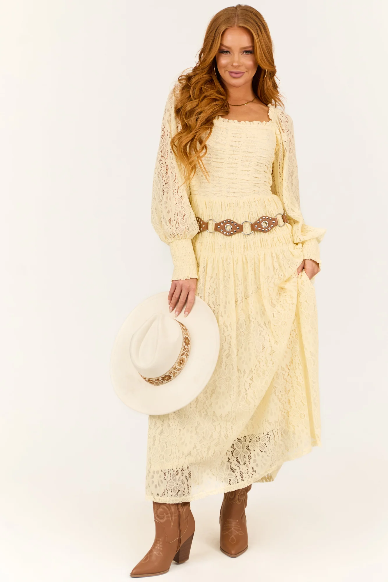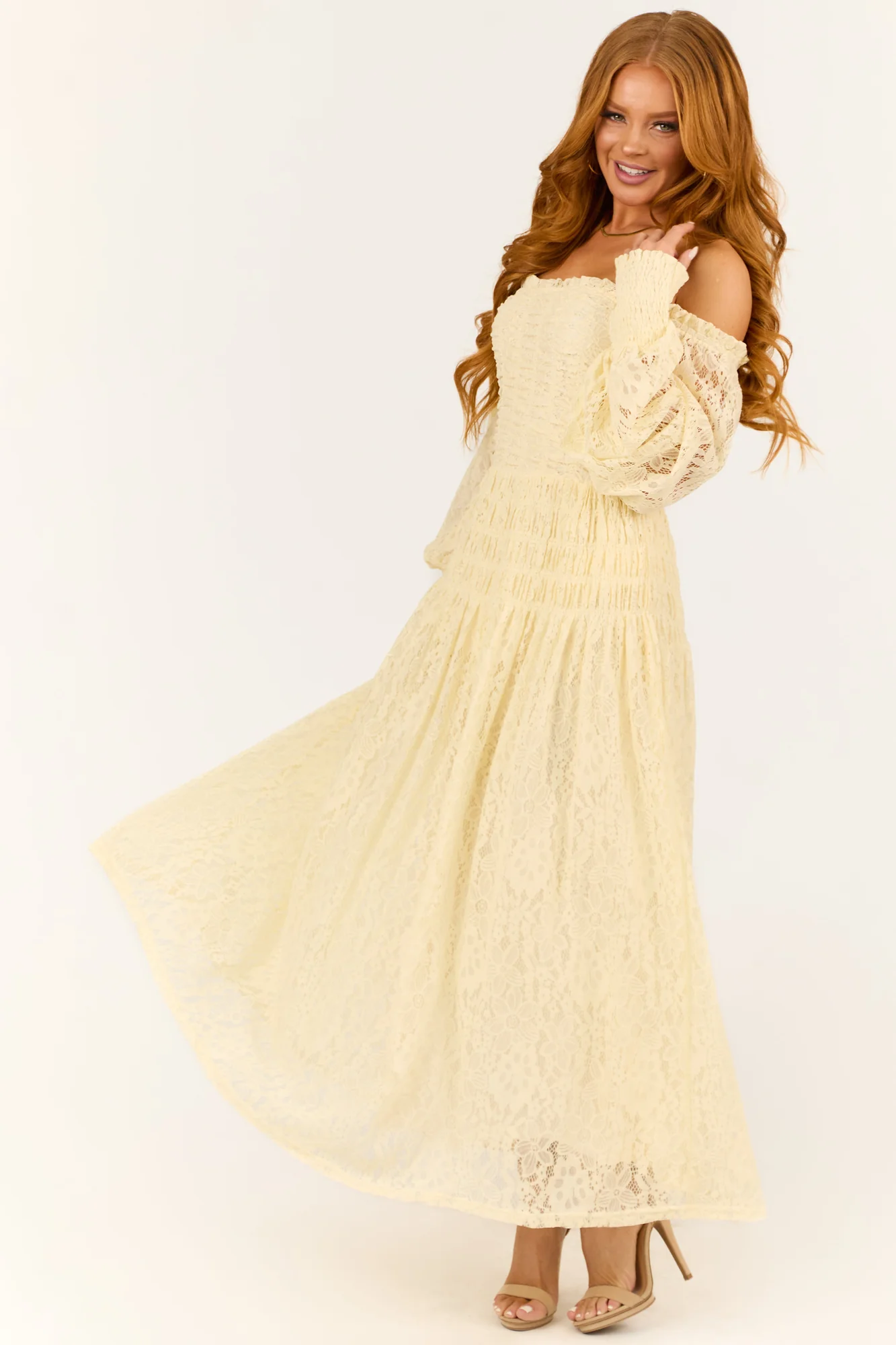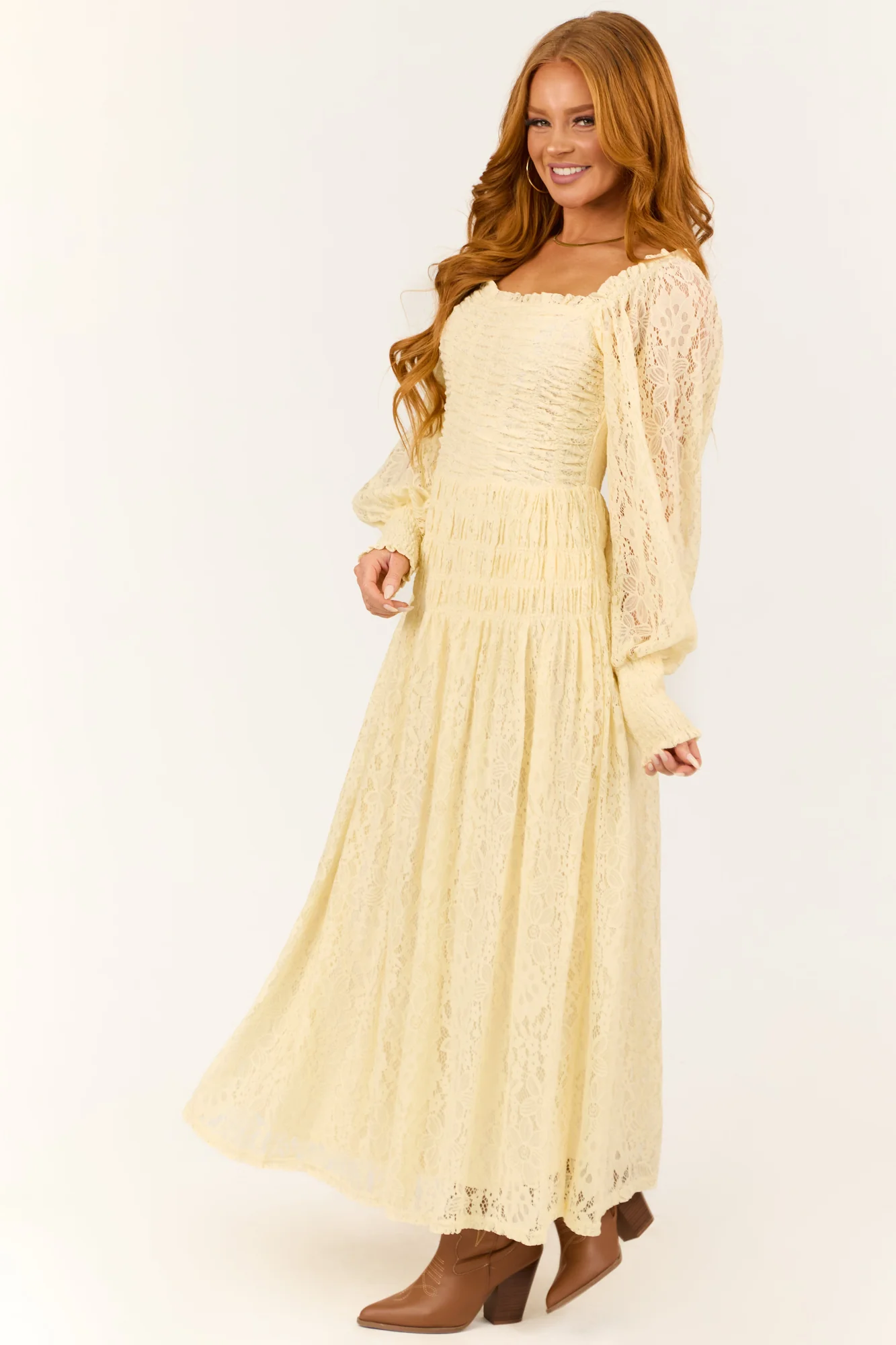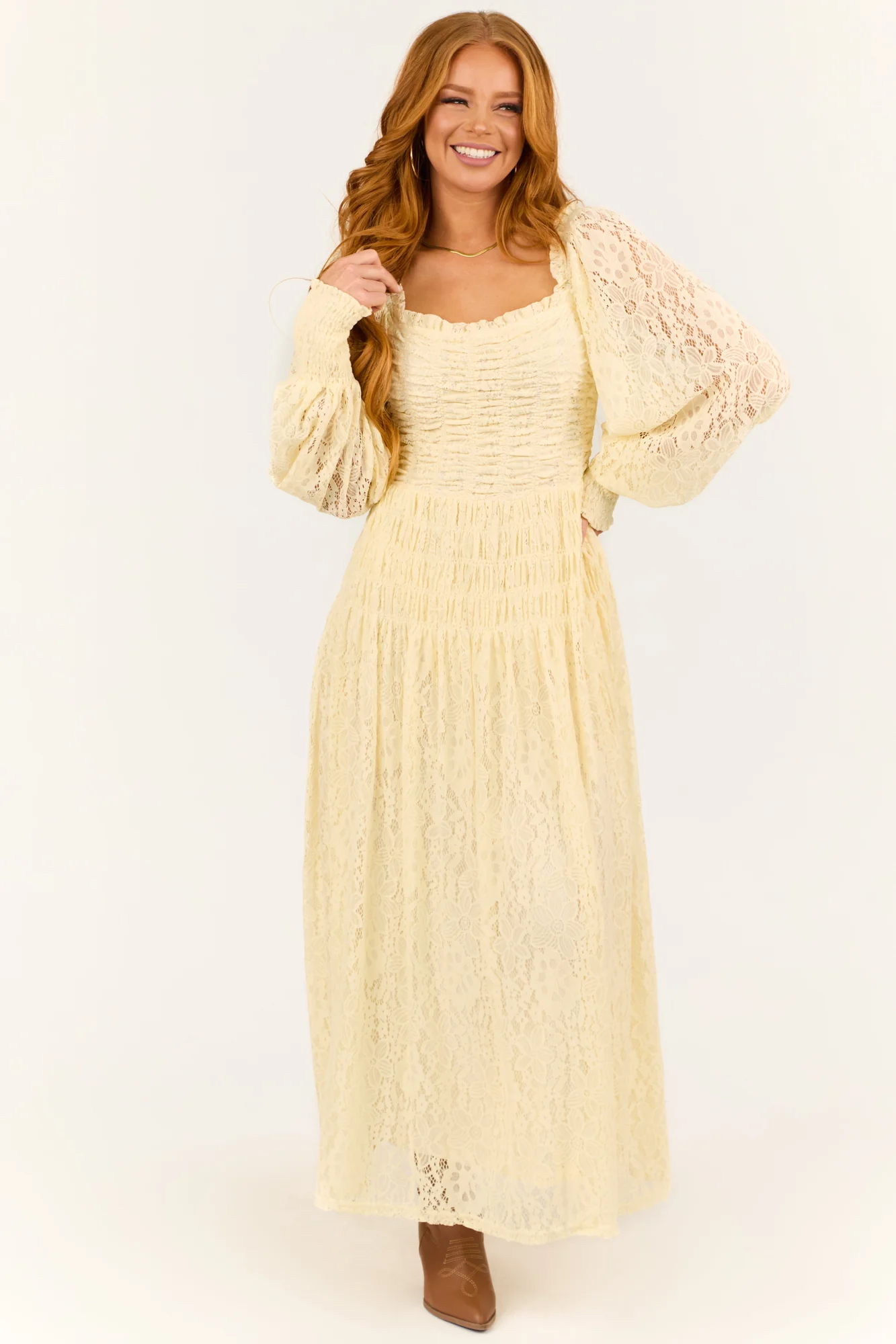 This stunning maxi dress features elegant long bubble sleeves with open lace details, a square frill neckline, and a smocked elastic bodice for a flattering fit. Made of high-quality polyester-spandex blend with a soft lining for extra comfort. Perfect for spring occasions. Available in sizes S, M, and L. Hand wash recommended. Model is 57″ and wearing a size Small.