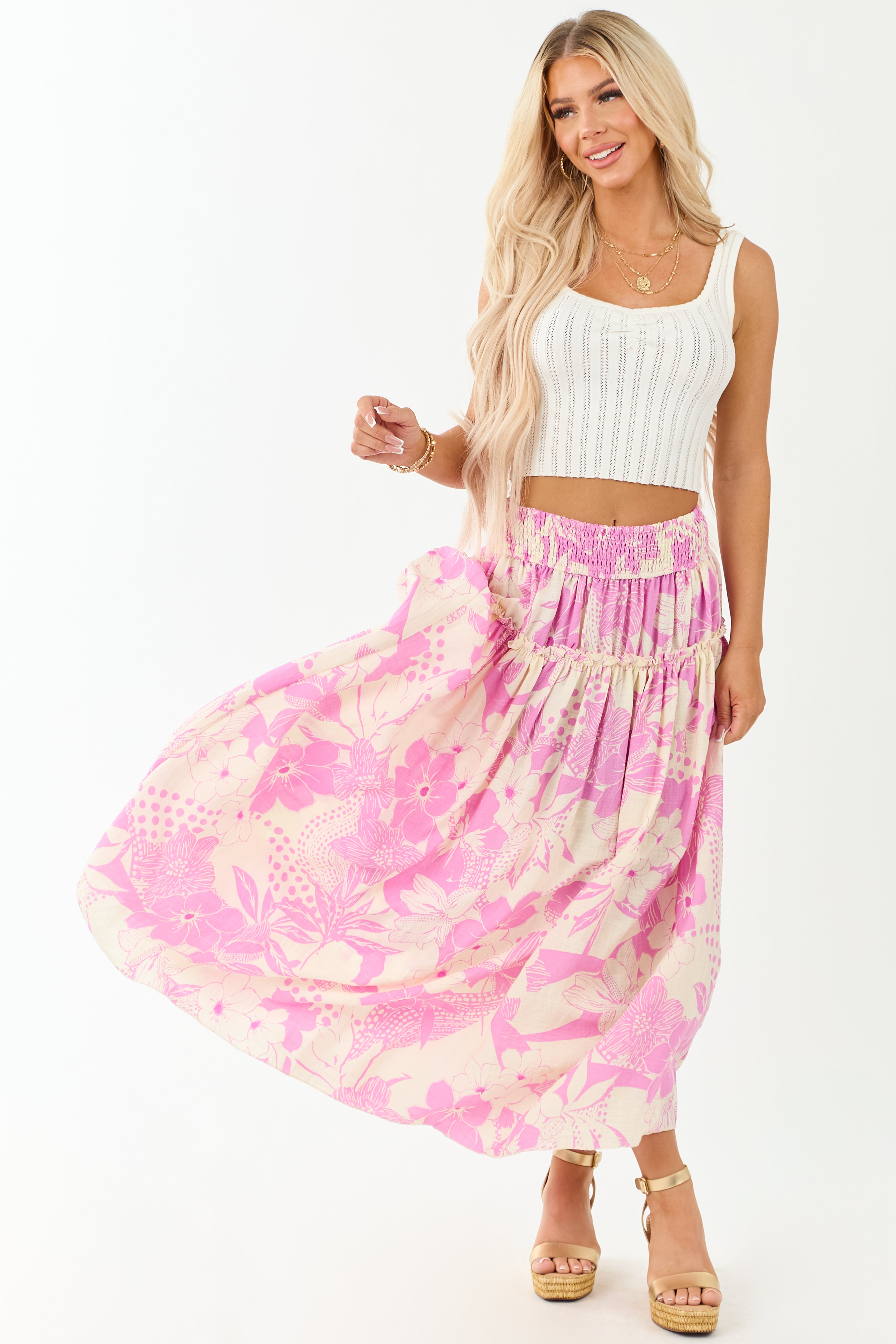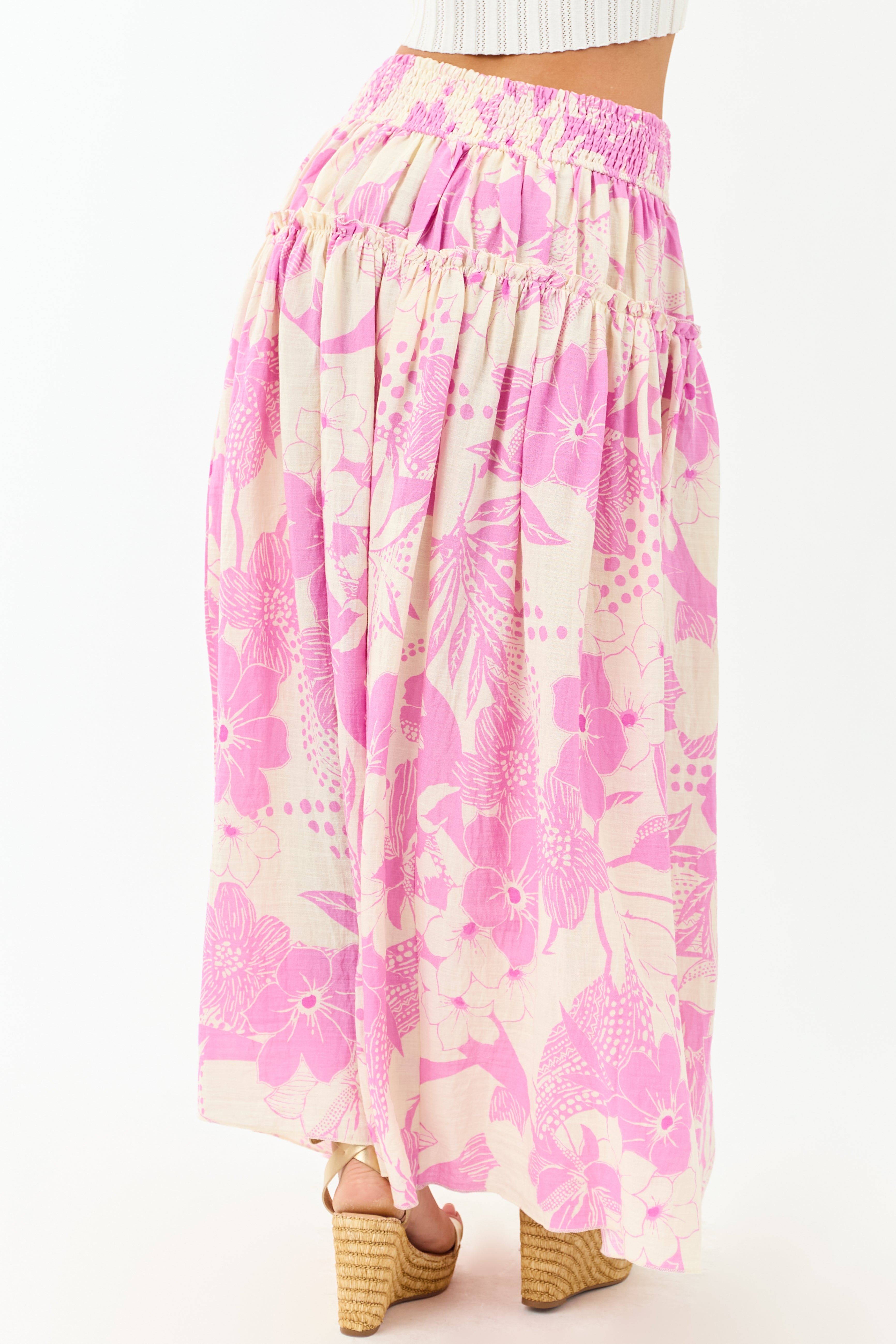 Indulge in tropical vibes with our Cream and Mauve Smocked Maxi Skirt. Crafted from 97% Rayon and 3% Nylon, this breezy skirt features a stretchy smocked waistband, ruffle detail, and measures 40″-42″ in length. Whether for a beach getaway or a casual outing, this skirt guarantees both style and comfort. Available sizes: S, M, L.