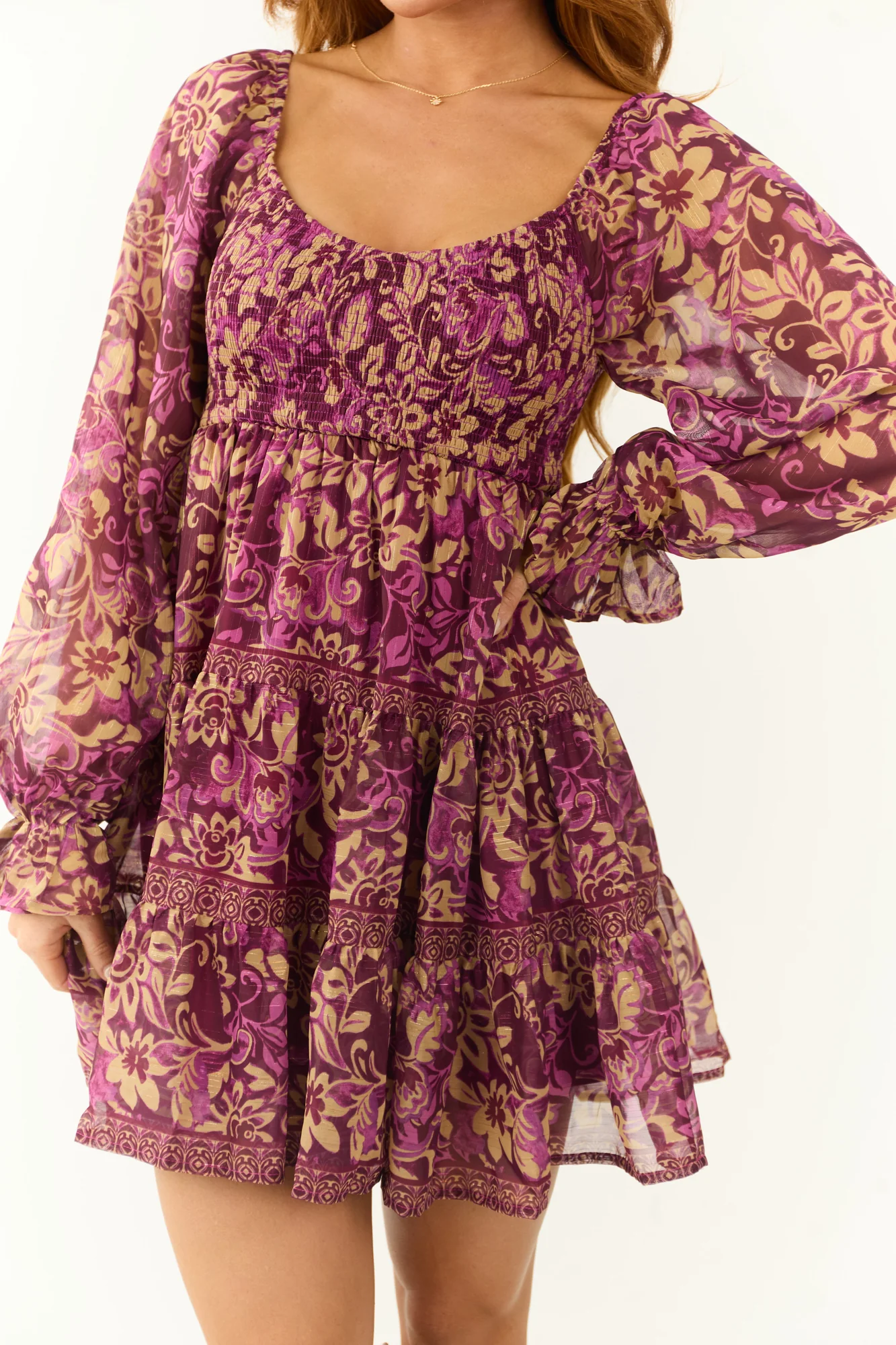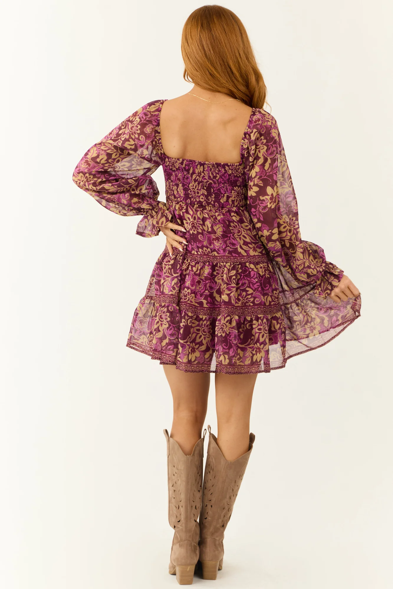 This flowy Mini Dress in shades of orchid, straw, and maroon features long balloon sleeves, elastic flared cuffs, and a tiered ruffle skirt for a babydoll fit. Crafted from non-stretchy woven polyester with metallic stitching, it has a subtle sweetheart neckline and elastic detail. Perfect for daytime occasions, this lined dress is ideal for a winter wardrobe. Care instructions: Hand wash cold separately, do not bleach, flat dry. Model height: 55″, size 1, bust: 33″, waist: 24″.