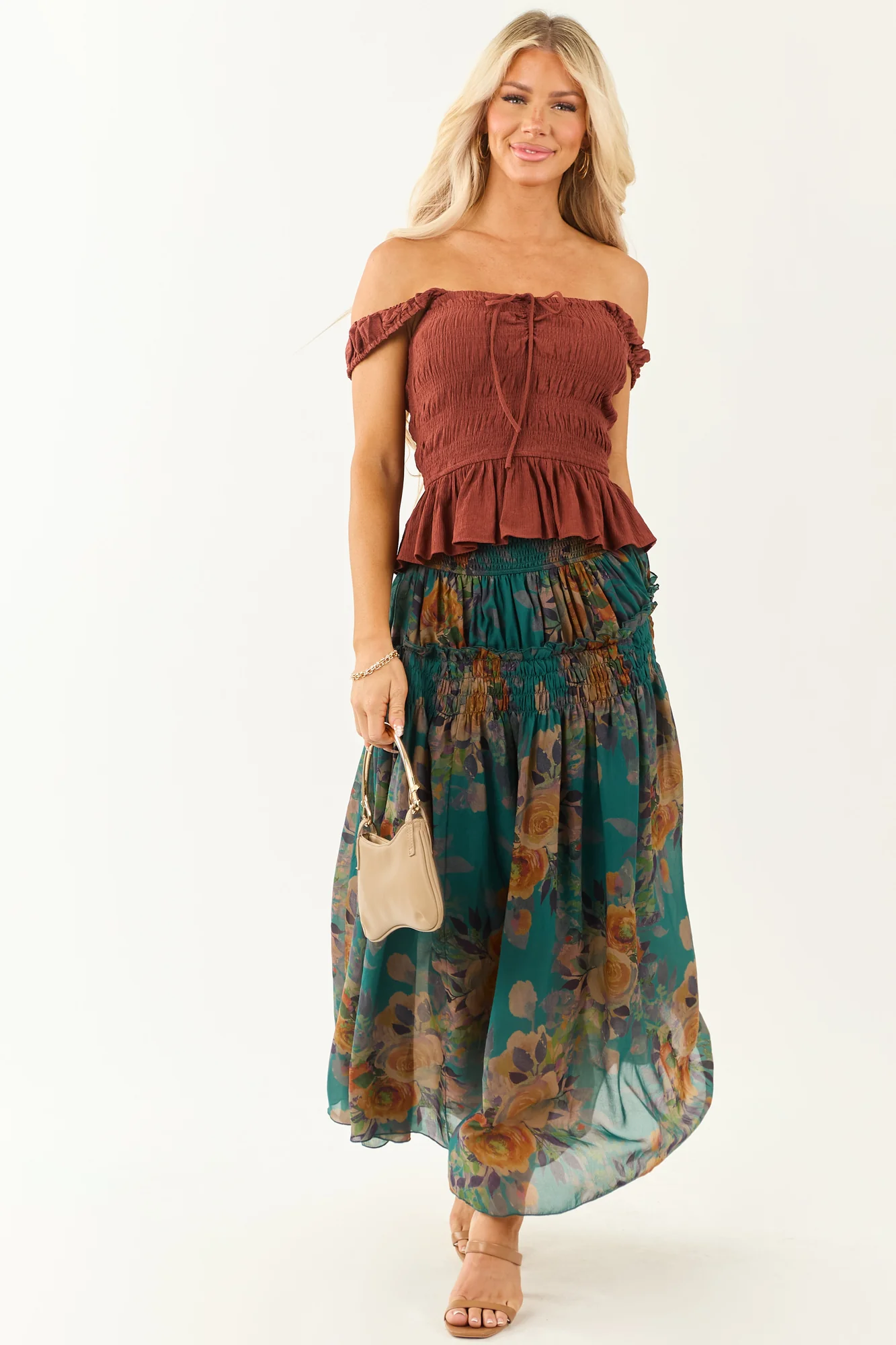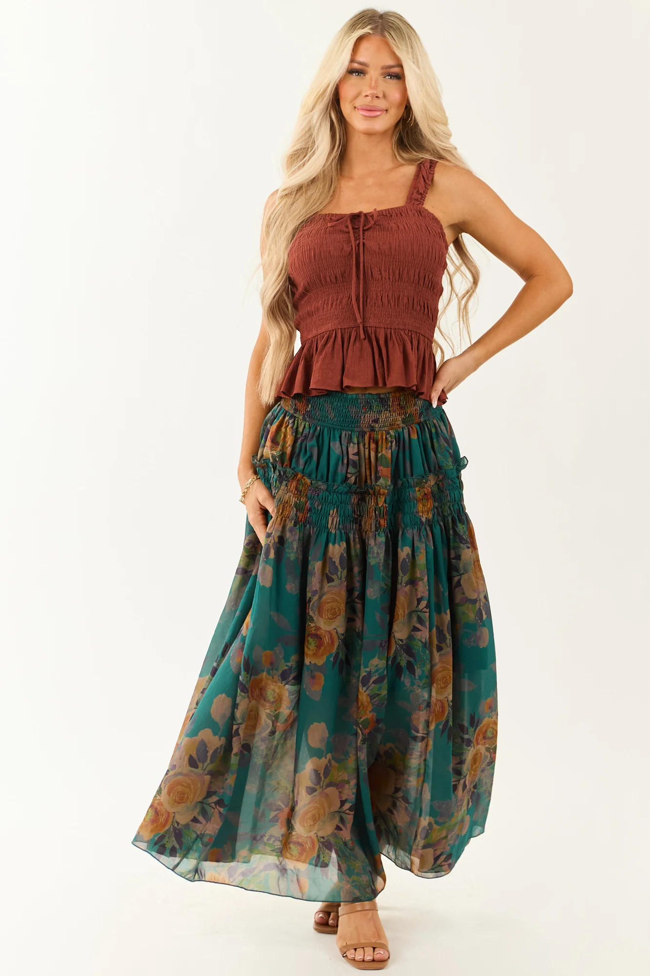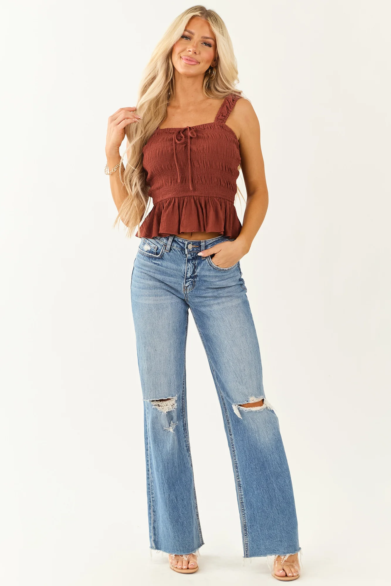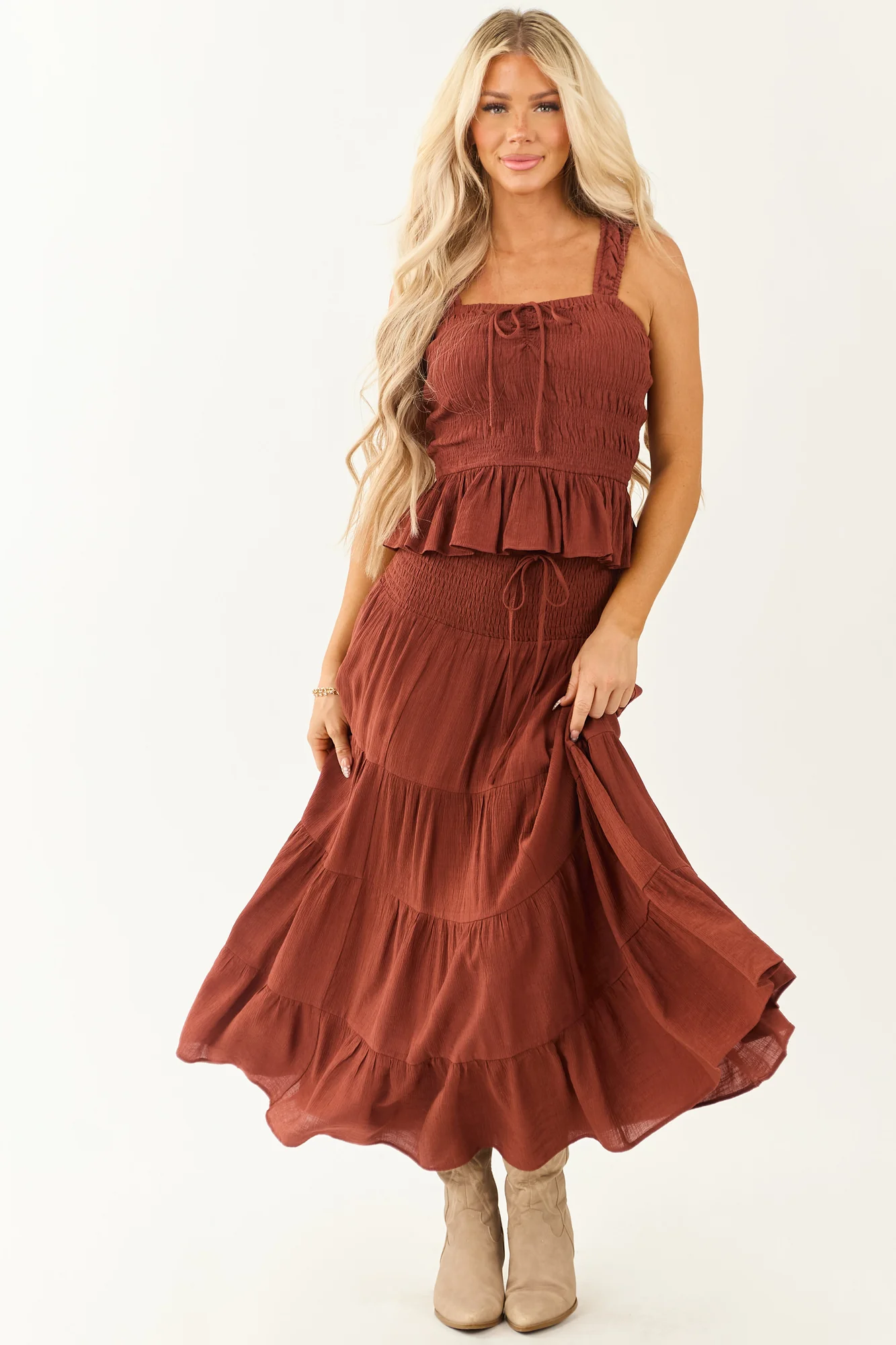 Embrace warmth and style with our cinnamon-brown tank top featuring a smocked bodice, playful ruffle hemline, elastic straps, and a non-cinching bust tie. Perfect for fall, this semi-cropped top is made of 85% Rayon and 15% Nylon with a 100% Rayon lining. Pair it with our Cinnamon Smocked Waist Tiered Maxi Skirt for a complete look. Available in sizes S, M, and L. Model is 57″ tall, bust 35″, waist 26″, wearing a size Small.