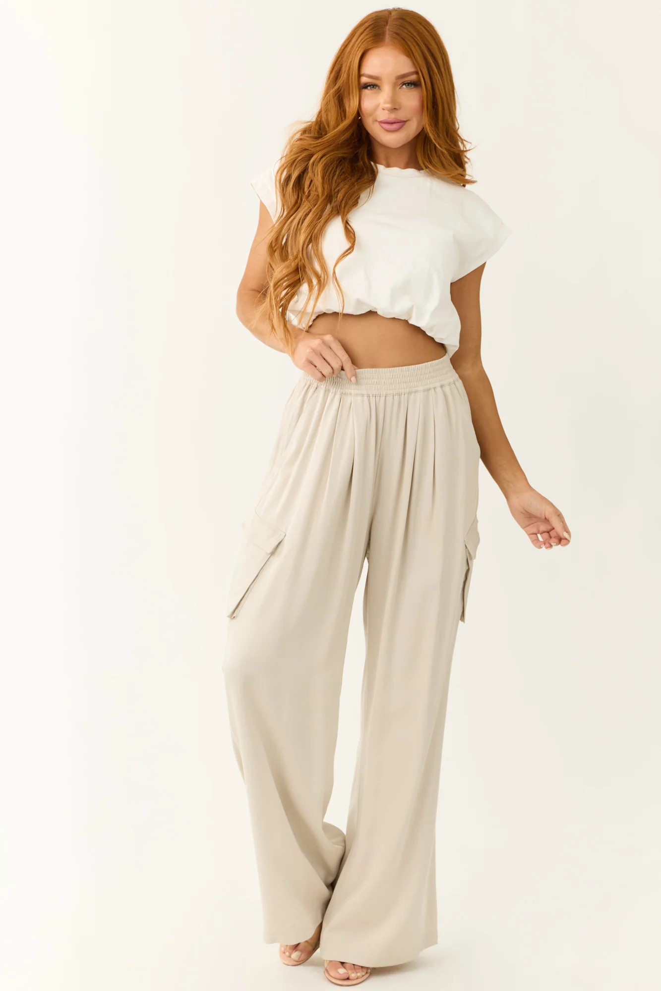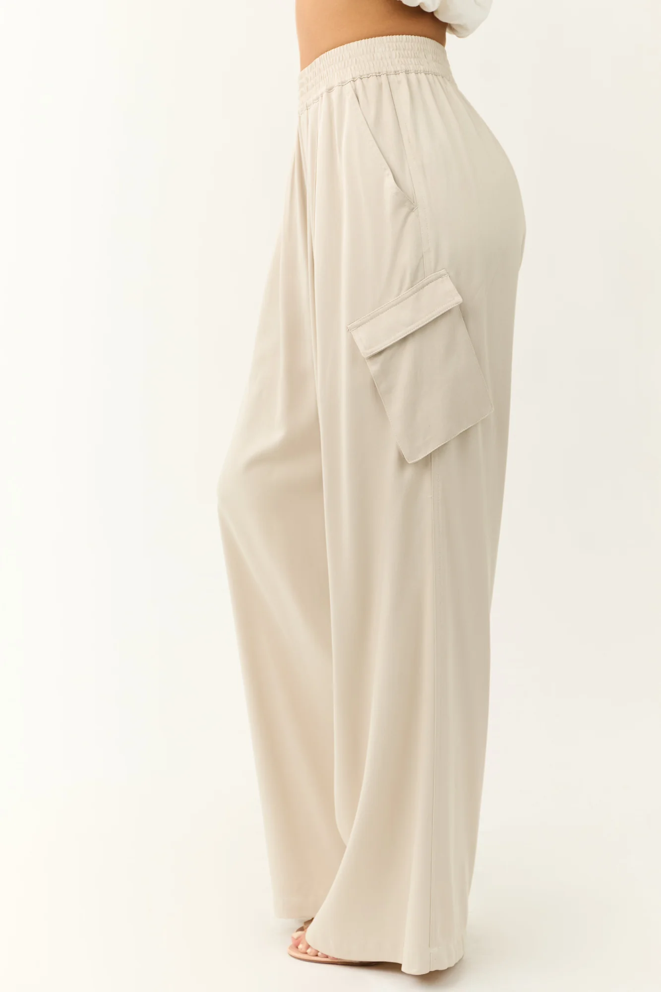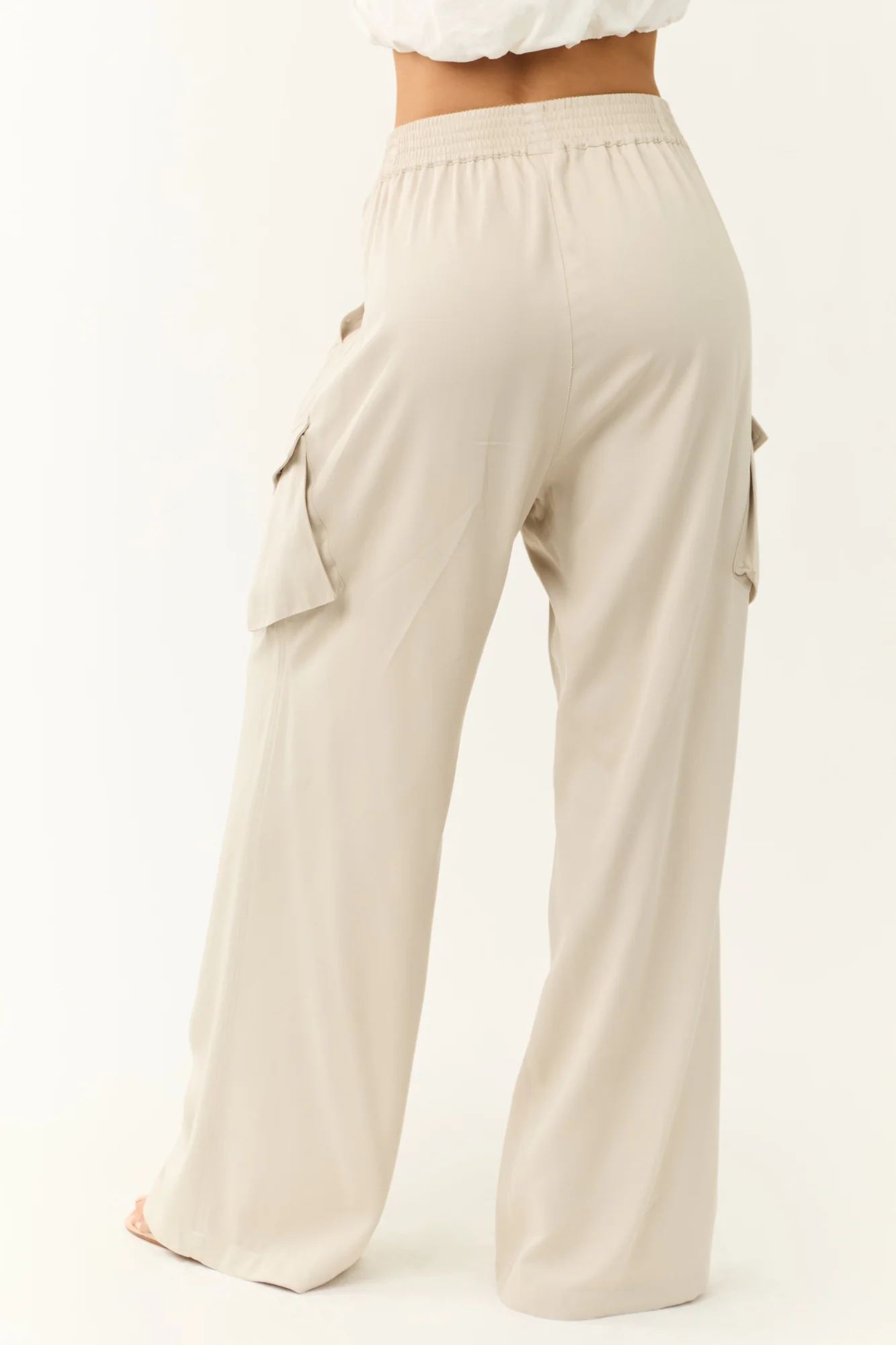 Upgrade your wardrobe with our trendy Cloud Color Smocked Waist Cargo Pants. This versatile piece features a non-stretchy woven fabric in a relaxing wide-leg fit. It comes with side pockets and two cargo pockets for added convenience. Crafted from 100% Tencel, these pants are both comfortable and durable. Perfect for daytime wear, these pants pair effortlessly with any top. Available in sizes S, M, and L. Hand wash cold, line dry, and iron on low heat if necessary. Elevate your style effortlessly!