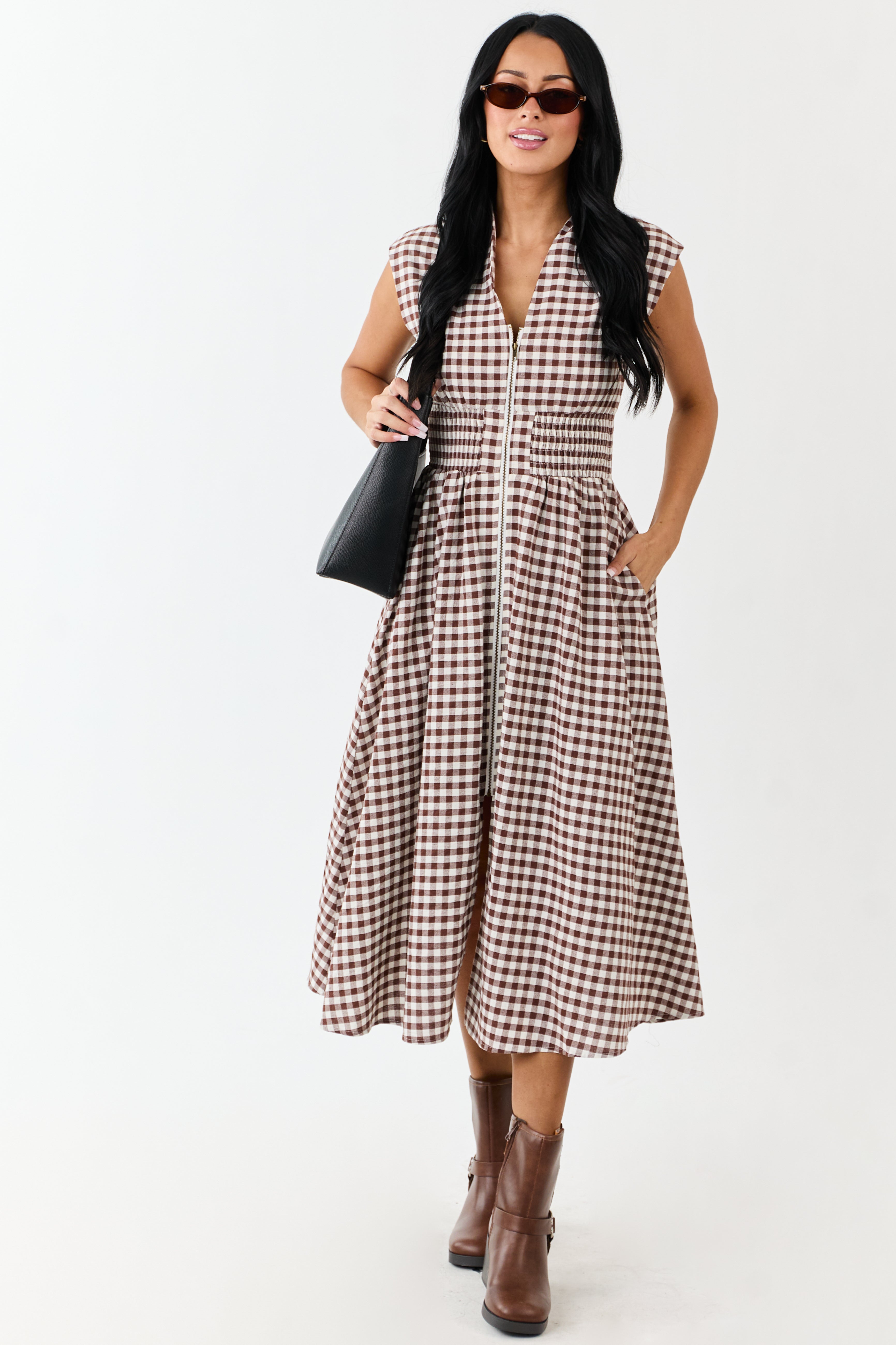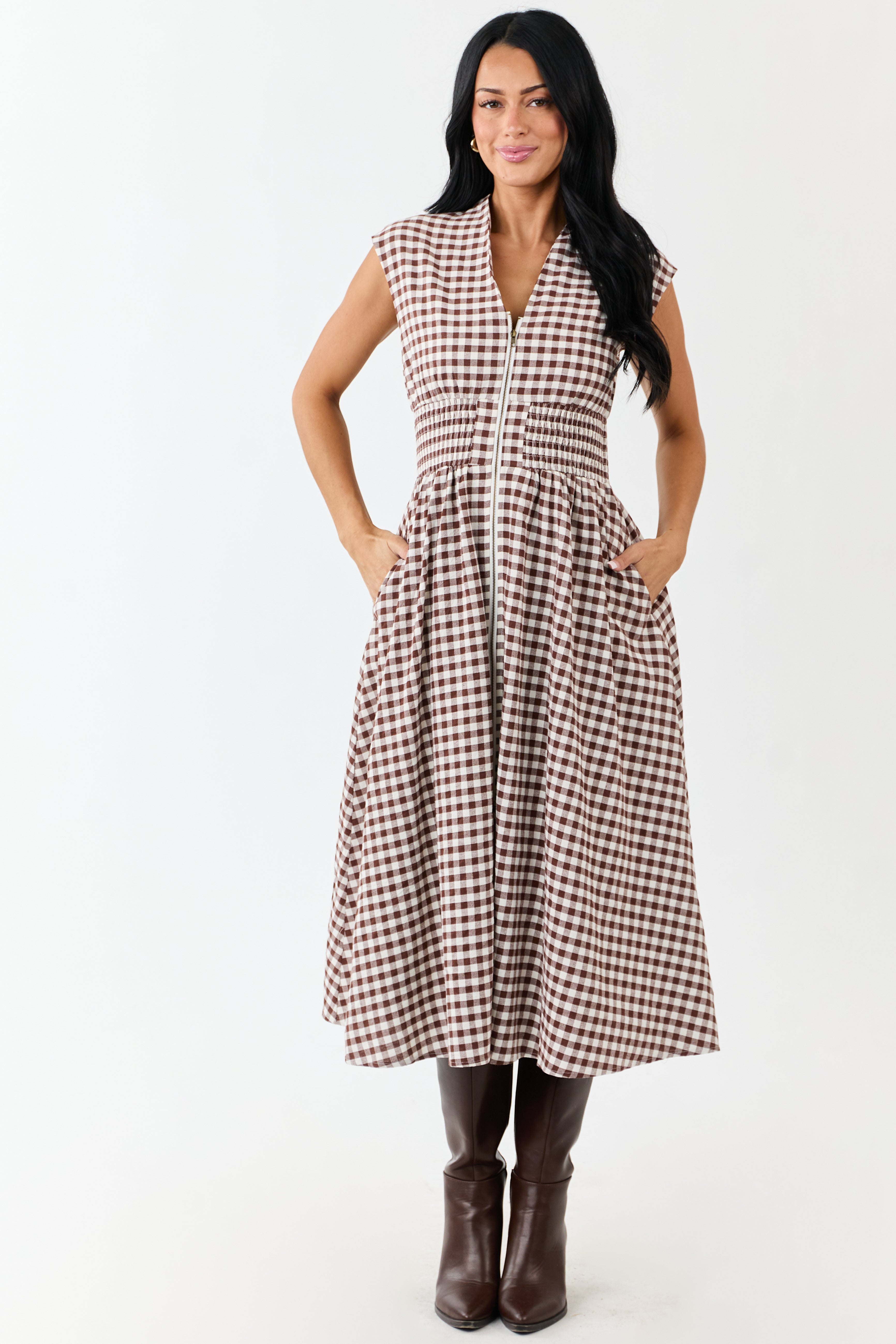 Indulge in the timeless elegance of this Sepia and Ivory gingham midi dress crafted from non-stretchy lightweight cotton. Designed with a flattering smocked waist, zip-up front, sleeveless cut, and featuring a front slit and side pockets for utmost style and comfort. Perfect for all occasions, this garment offers a fitted silhouette and comes lined for a premium finish. Embrace sophistication with this versatile wardrobe essential that exudes charm and grace. Available in sizes XS to XL.