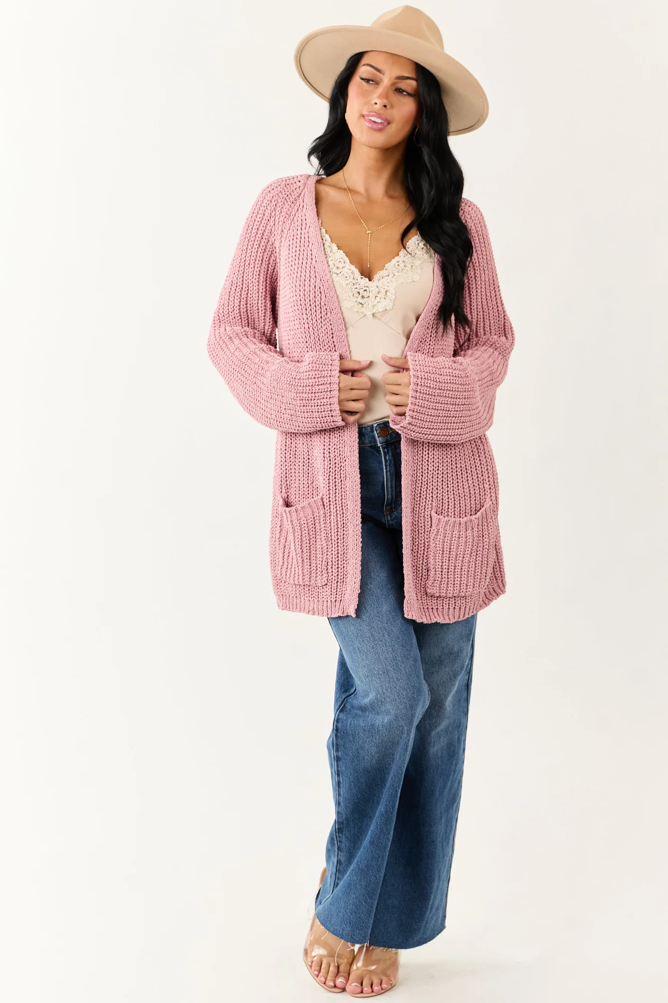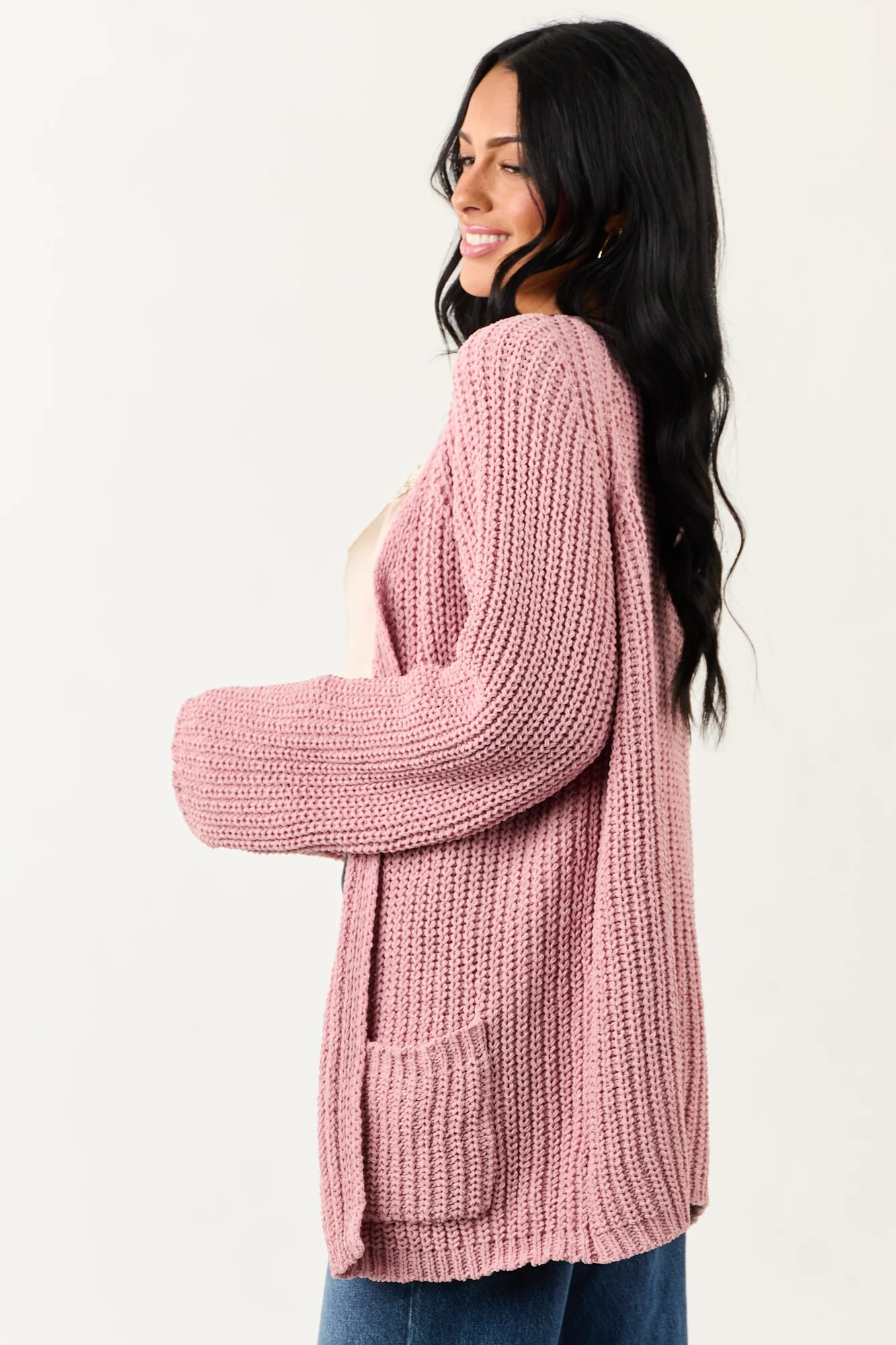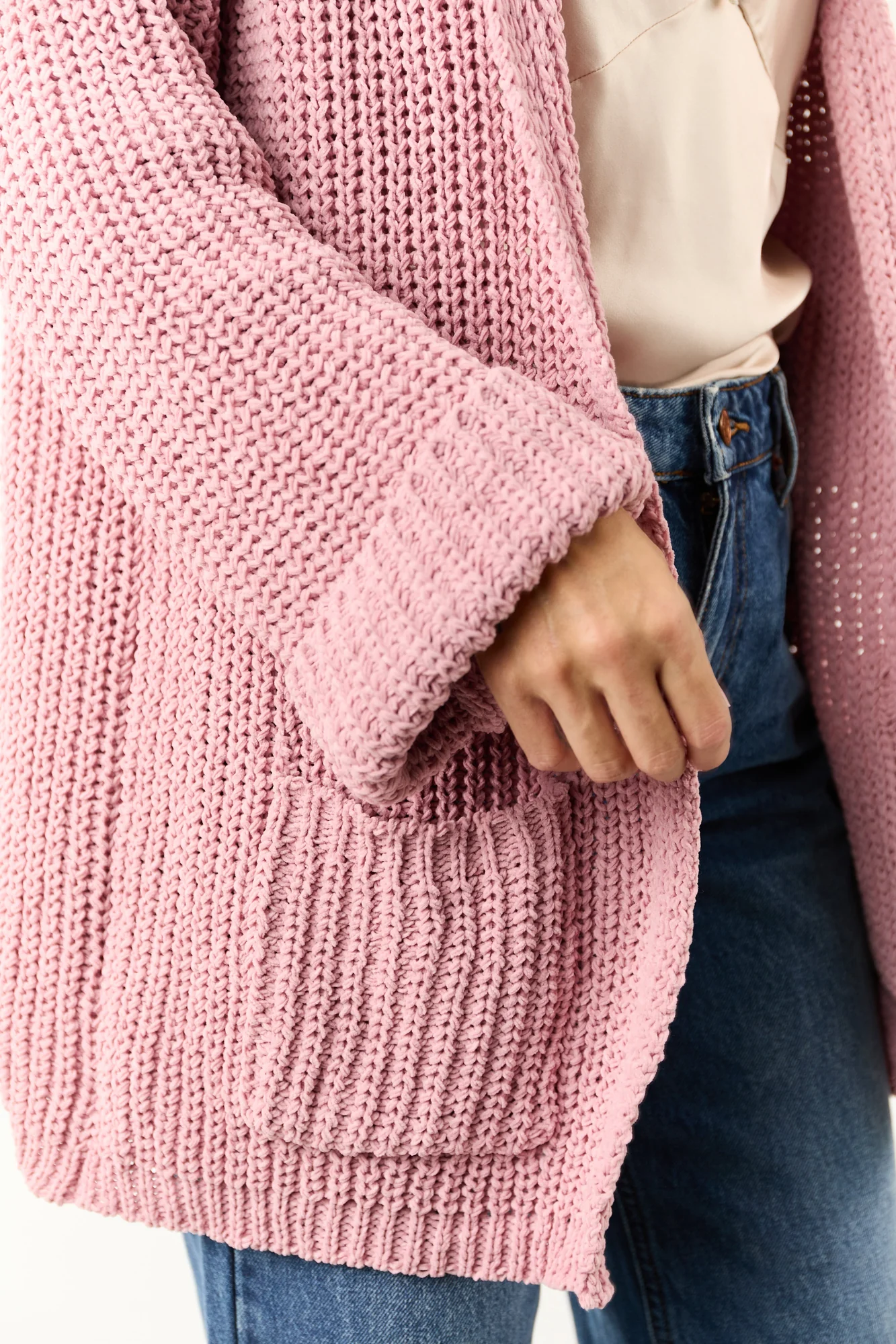 Wrap yourself in cozy charm with this soft knit baby pink open front cardigan. Crafted from a thick knit, it provides plush warmth and a relaxed drape. Designed with an oversized fit and stretchy ribbed knit, it features side pockets for added convenience. Made of 100% polyester. Imported. Model is wearing a size Small. Model’s Profile: Size 1, Height 59″, Bust 34″, Waist 26″. Embrace comfort and style with this versatile piece that complements any outfit effortlessly.