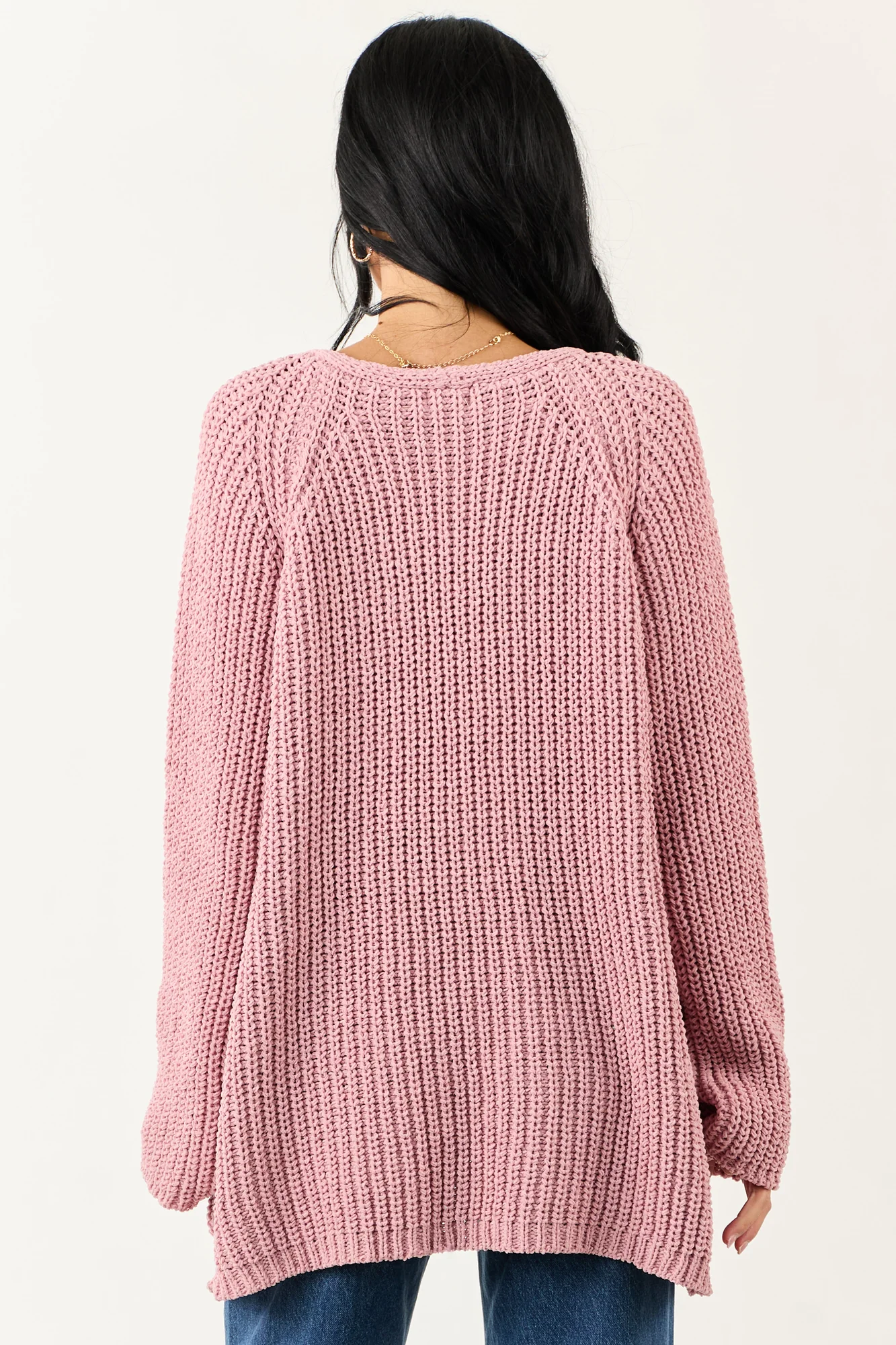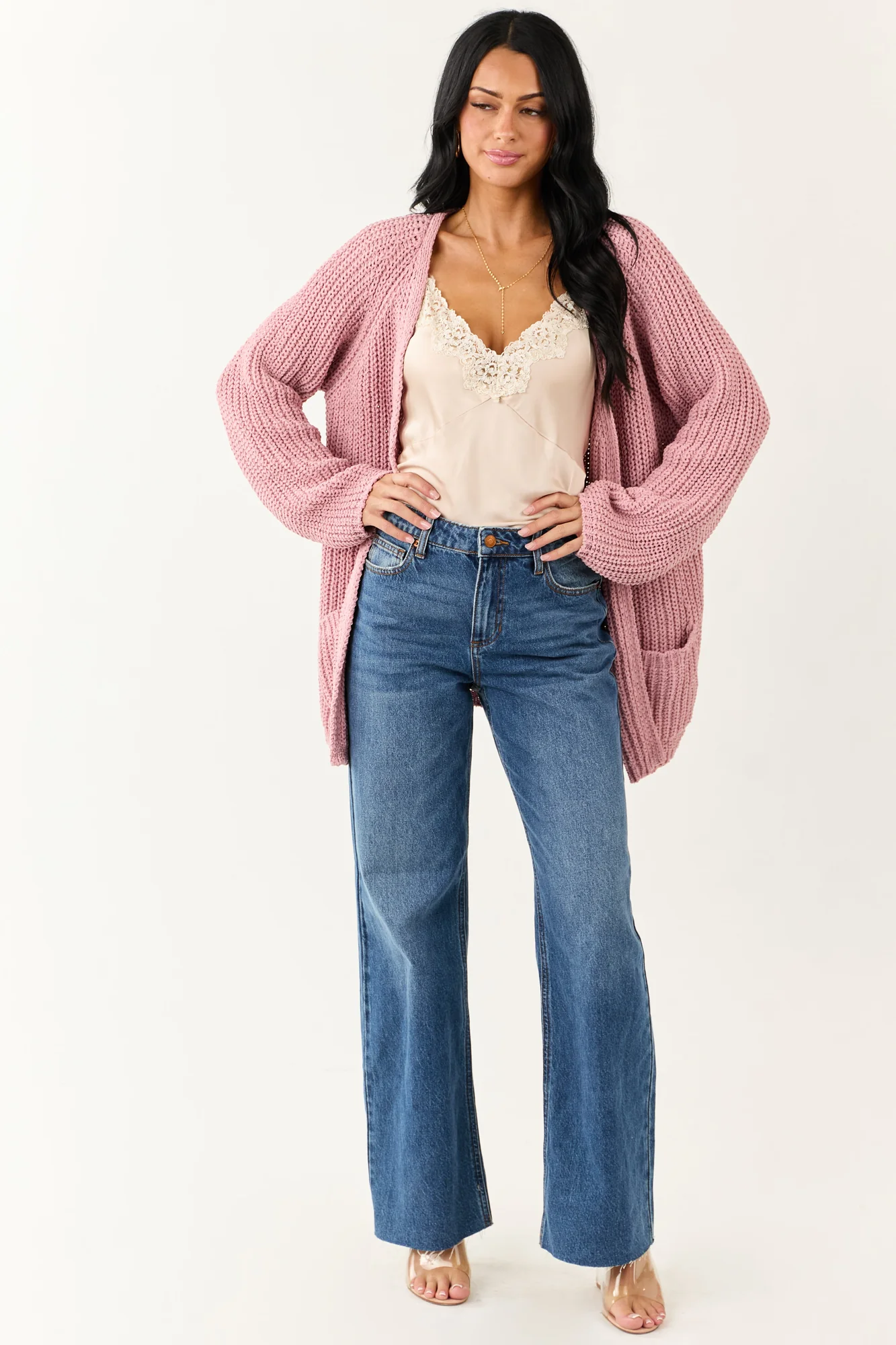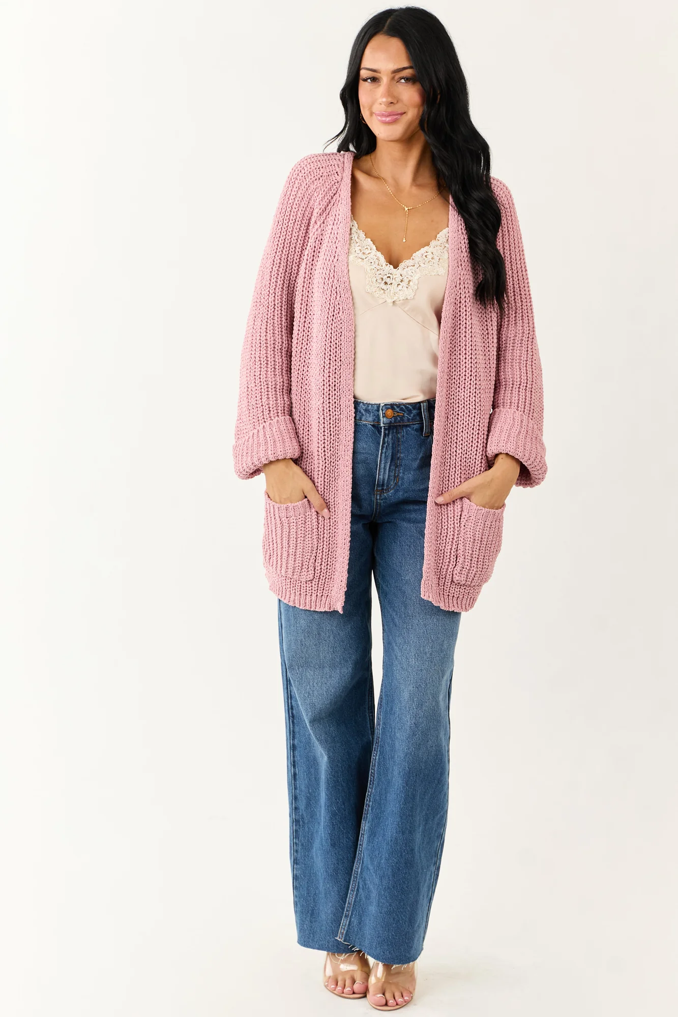 Wrap yourself in cozy charm with this soft knit baby pink open front cardigan. Crafted from a thick knit, it provides plush warmth and a relaxed drape. Designed with an oversized fit and stretchy ribbed knit, it features side pockets for added convenience. Made of 100% polyester. Imported. Model is wearing a size Small. Model’s Profile: Size 1, Height 59″, Bust 34″, Waist 26″. Embrace comfort and style with this versatile piece that complements any outfit effortlessly.