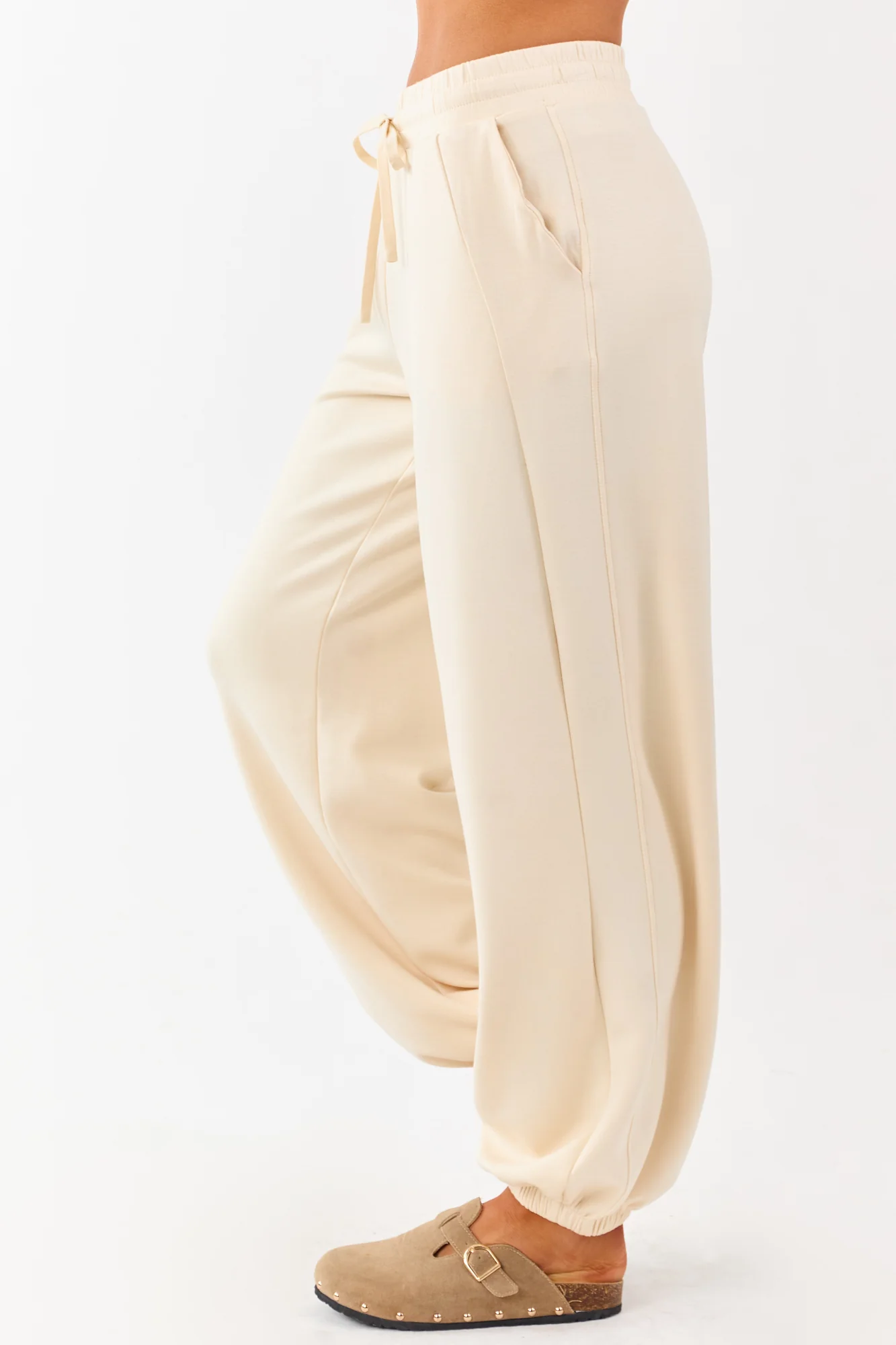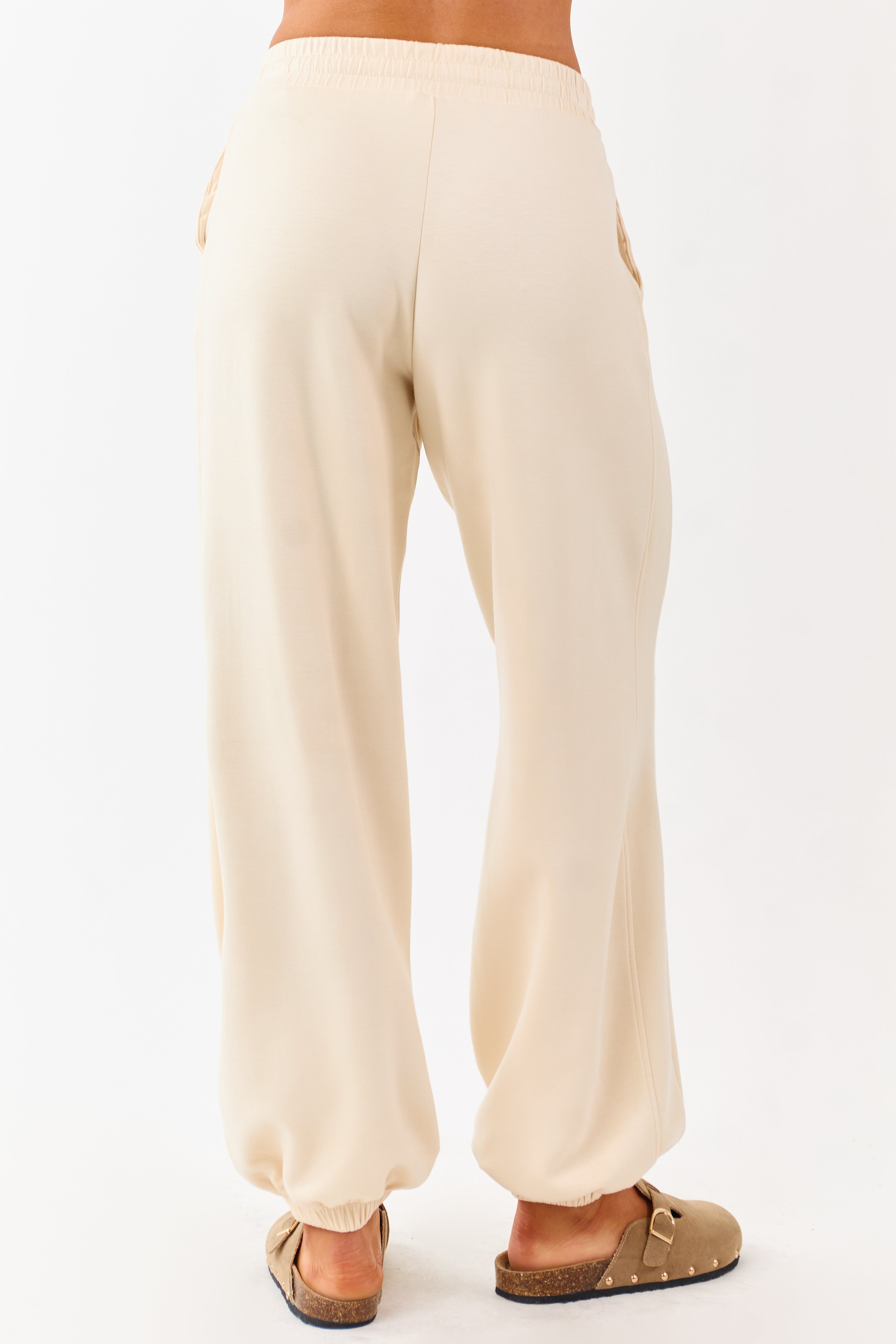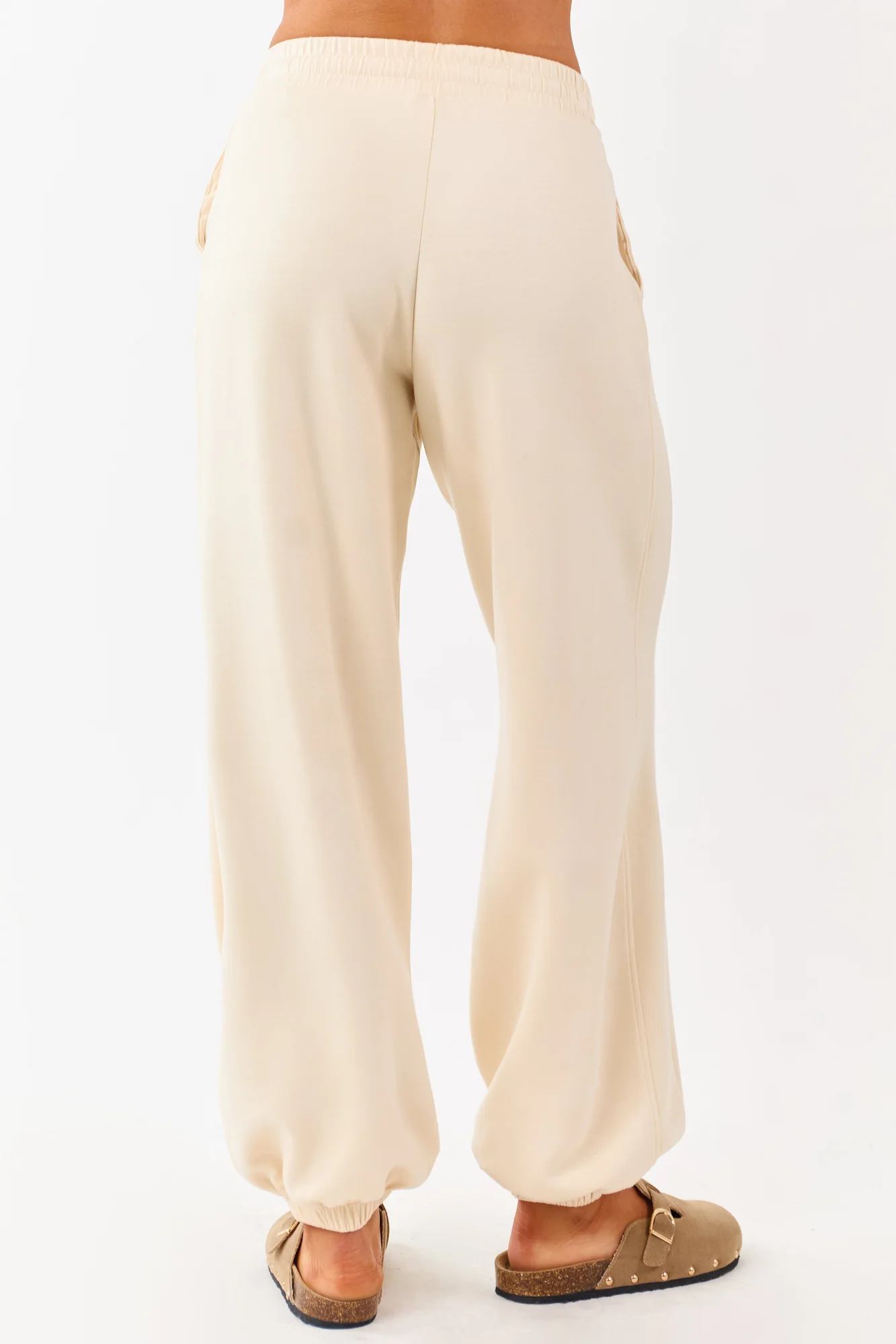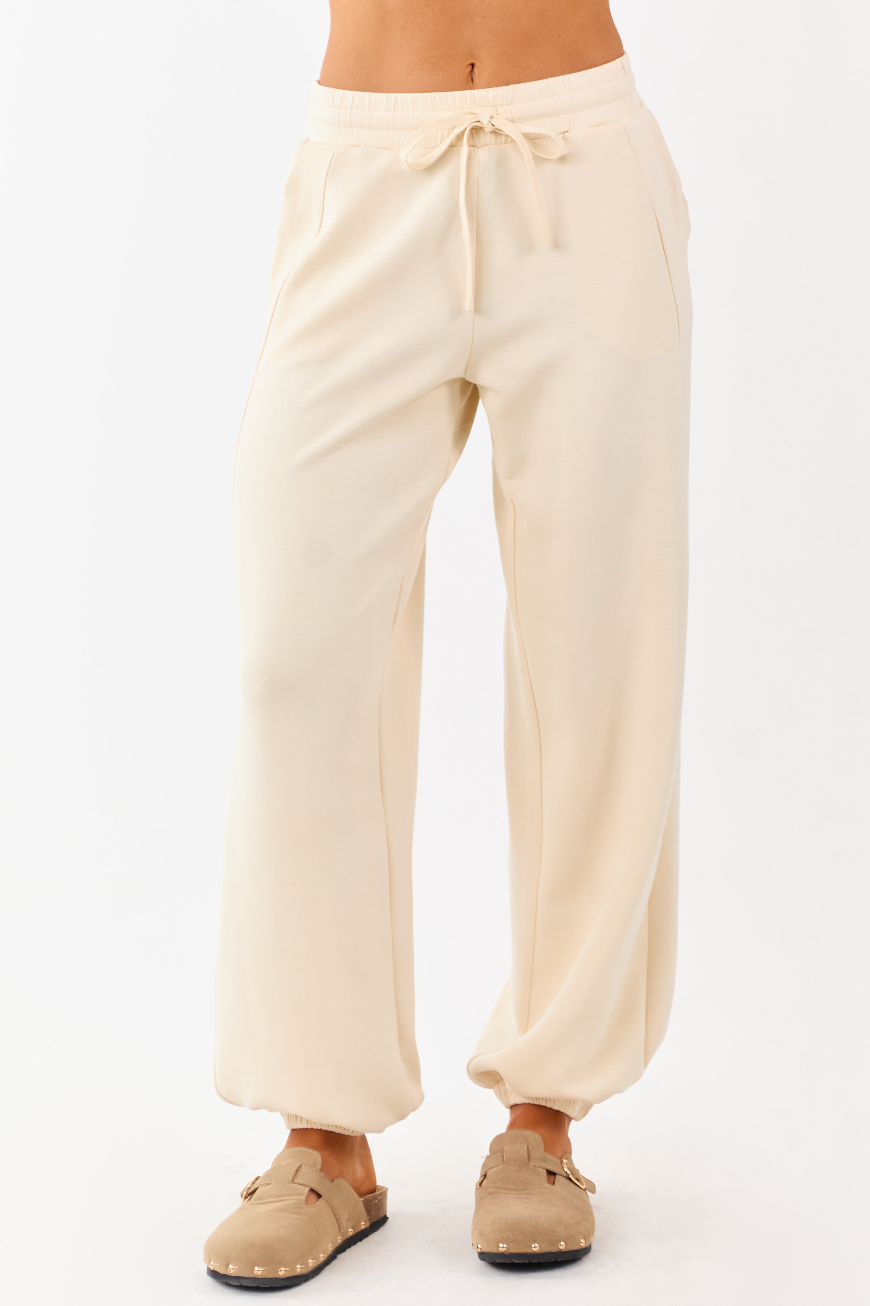 Introducing our Cream Soft Knit Drawstring Jogger Pants, the perfect blend of comfort and style for your everyday needs. Made of 46% Rayon, 47% Polyester, and 7% Spandex, these pants feature a stretchy knit fabric, elastic waistband with a cinching drawstring, side pockets, and a high-waisted design. The inseam measures 31 inches, ensuring a flattering fit. Available in sizes XS to XL. Order yours today!