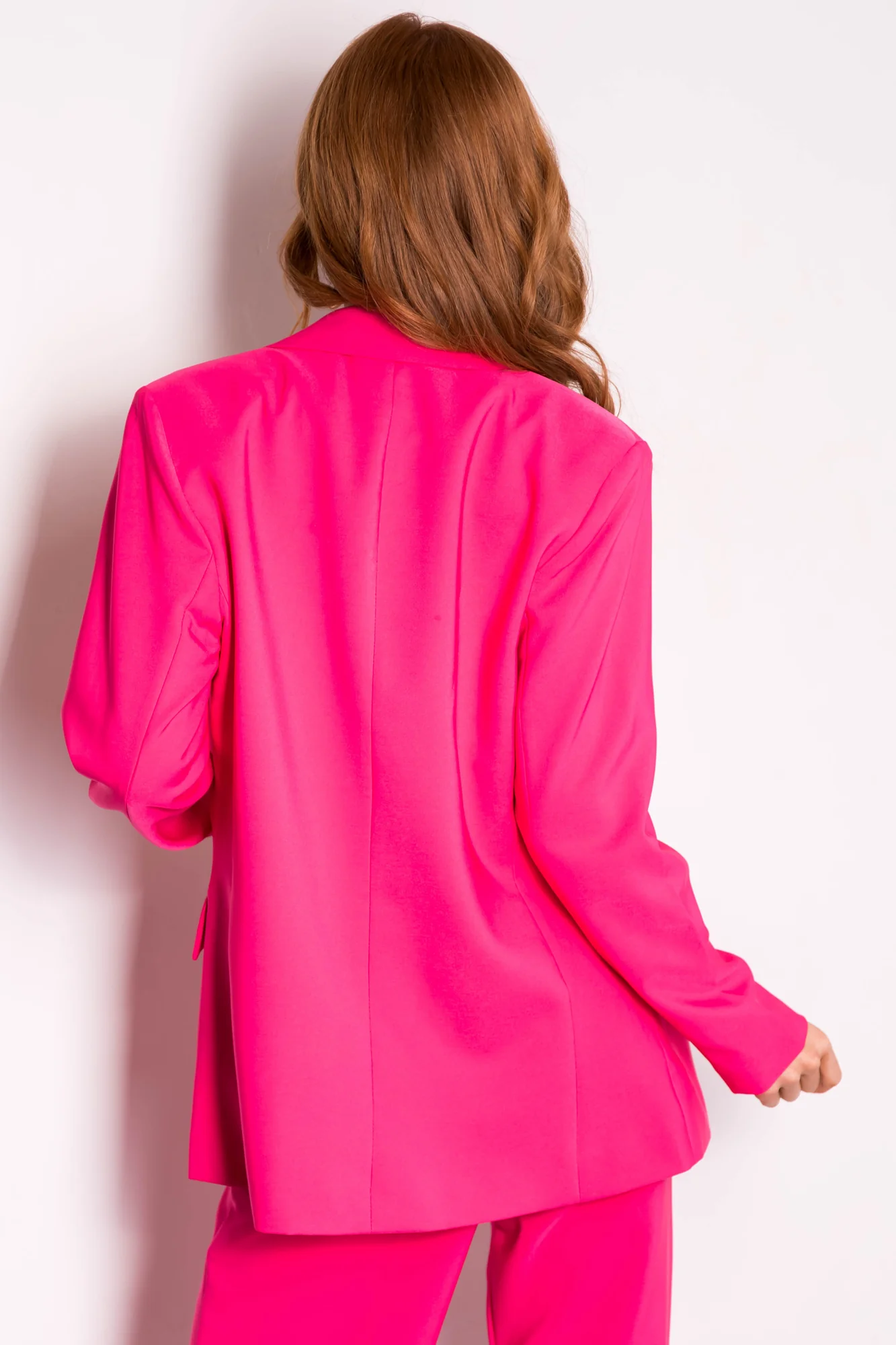 Upgrade your work wardrobe with our Solid Pink Blazer featuring a double button front closure. Made from high-quality polyester and spandex blend, this blazer boasts shoulder pads, collared lapels, and non-functional front pockets for a professional yet stylish look. The long sleeves and slit back hemline add a touch of elegance, making it perfect for any occasion. Stay comfortable and chic all day long with this non-stretchy woven blazer. Ideal for pairing with our Hot Pink Wide Leg Elastic Waist Woven Pants. Available in sizes S, M, and L. Hand wash cold, hang dry, do not bleach, iron low. Model is wearing a size Small.